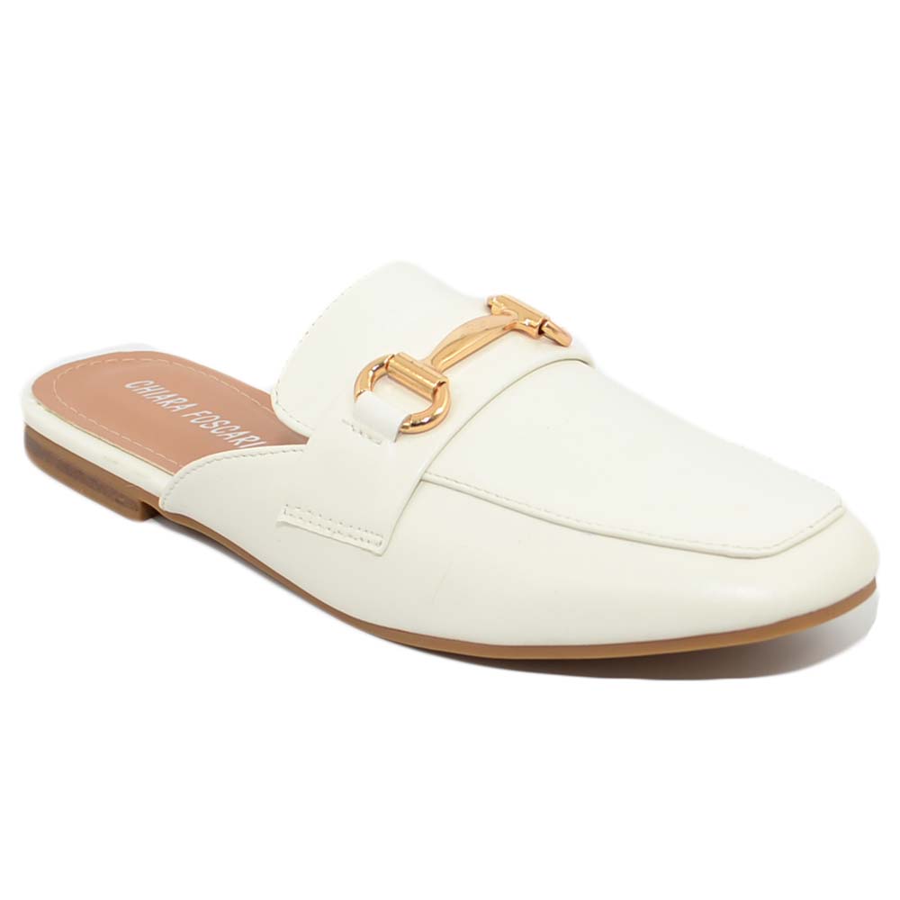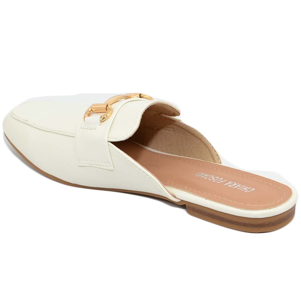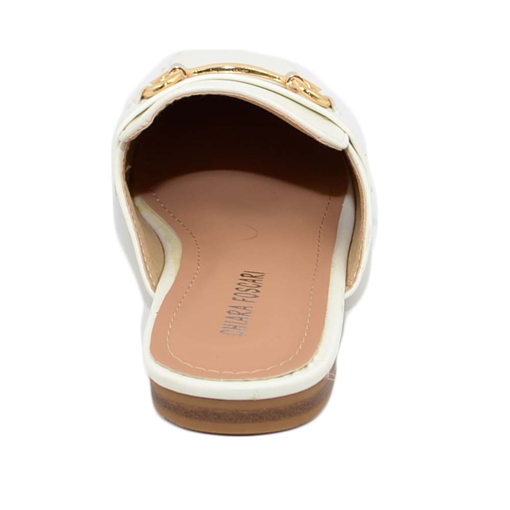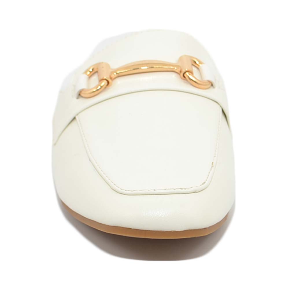 Sabot mocassino college bianco donna flat a punta quadrata tallone scoperto e accessorio metallico oro raso terra mules
