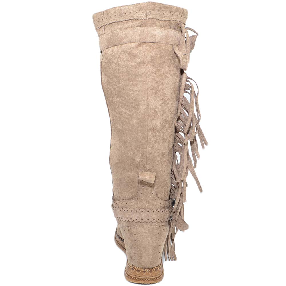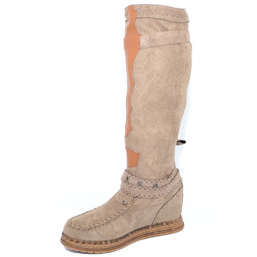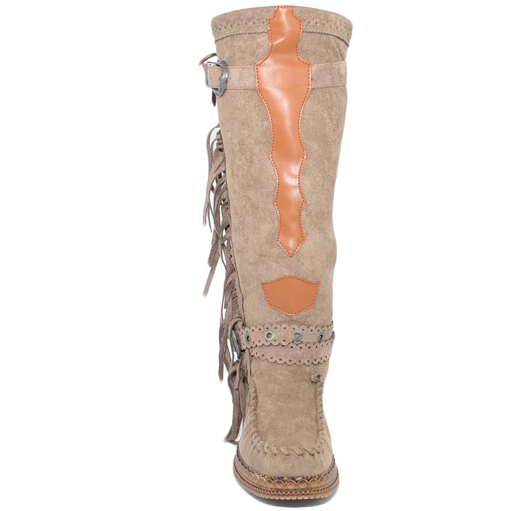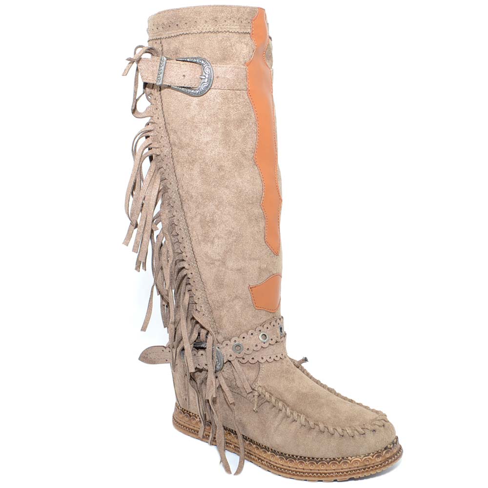 Stivali donna indianini taupe scamosciati con frange zeppa interna 5 cm cinturino fibbia altezza ginocchio moda
