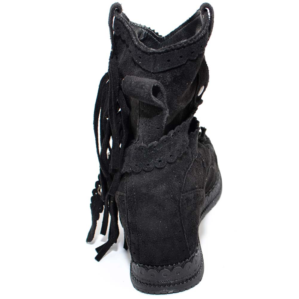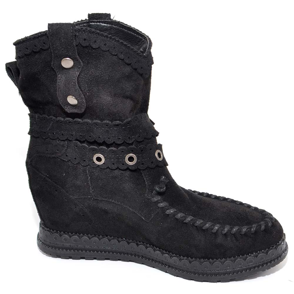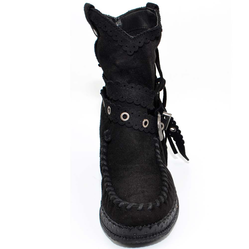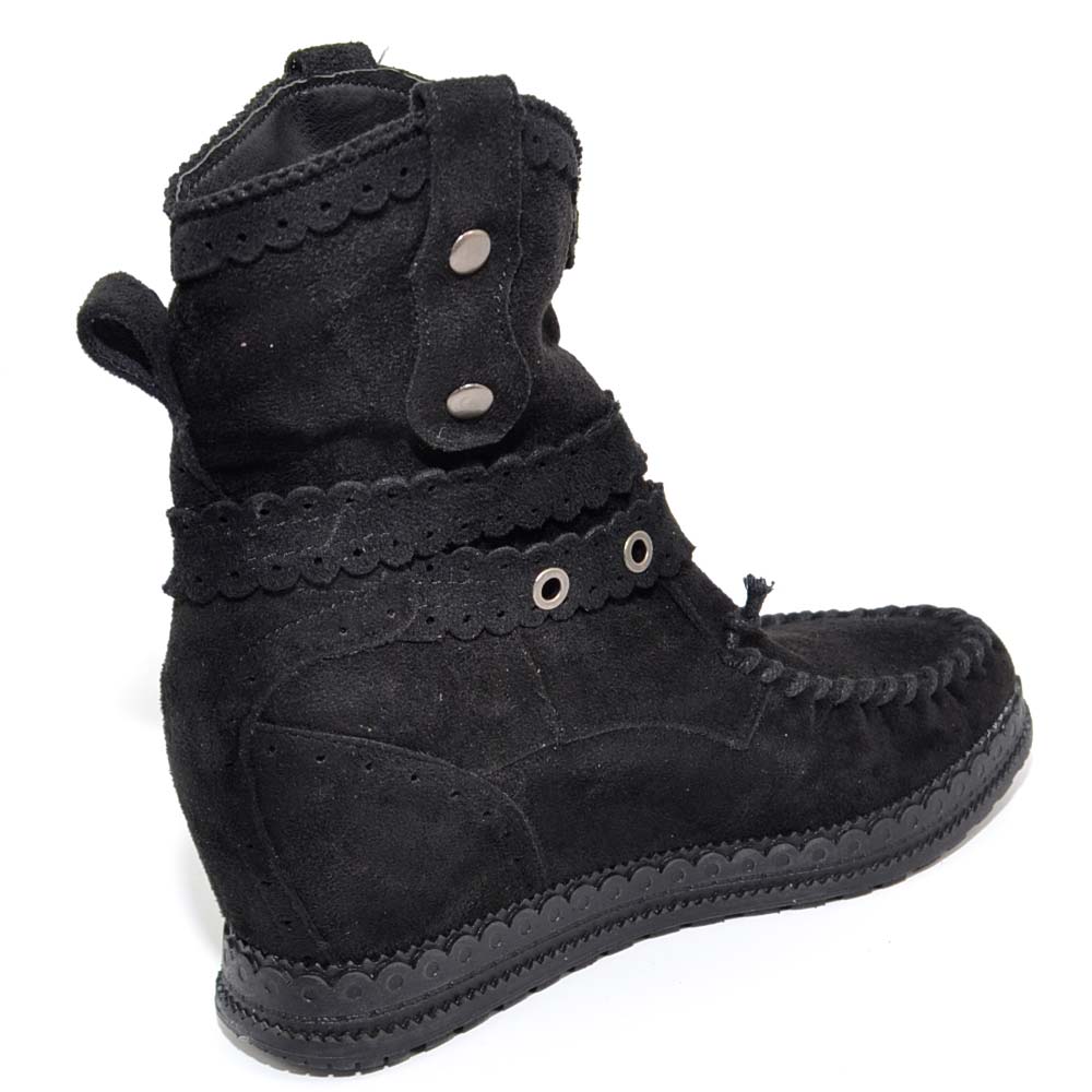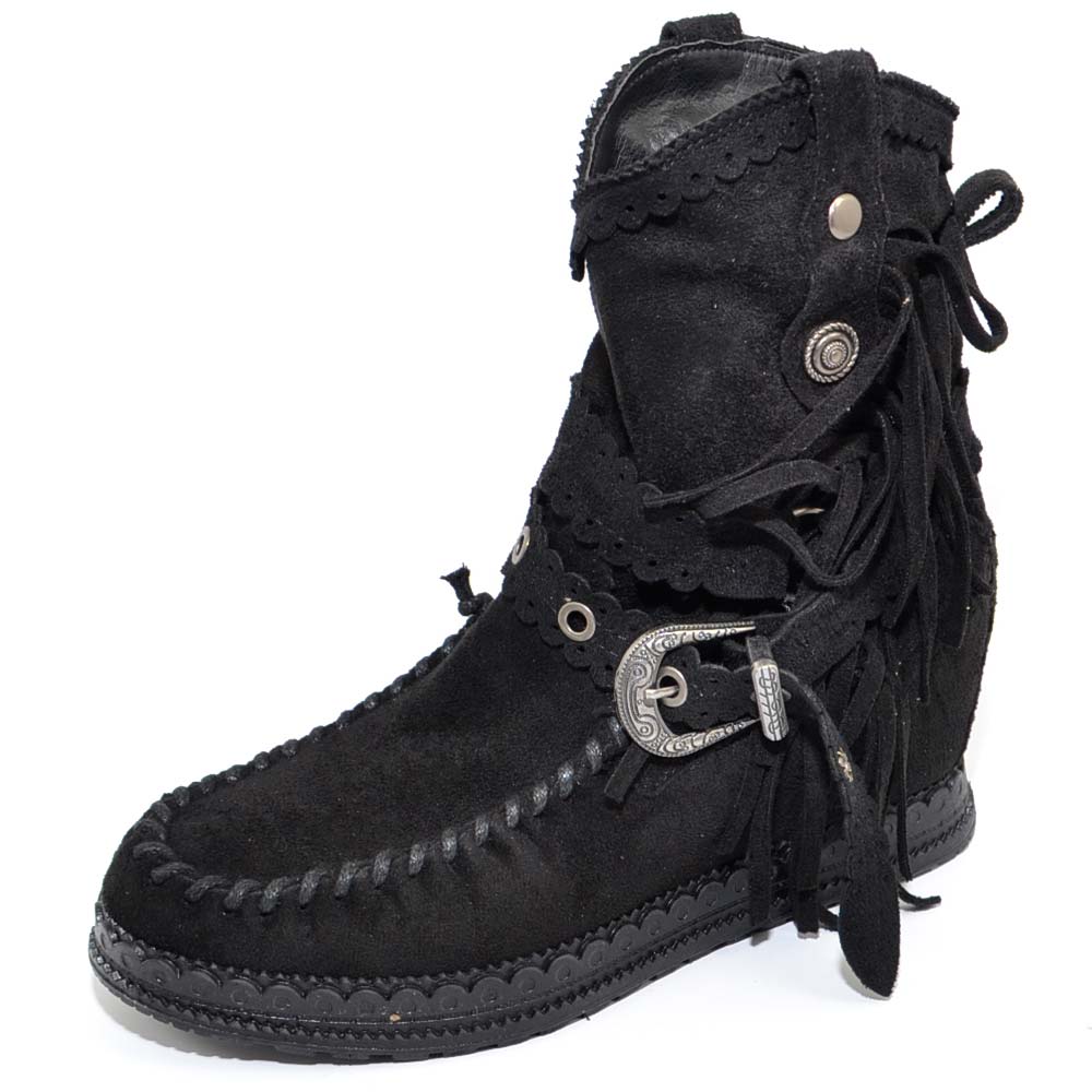 Stivaletto donna indianini nero scamosciati con frange zeppa interna 5 cm cinturino fibbia altezza caviglia moda