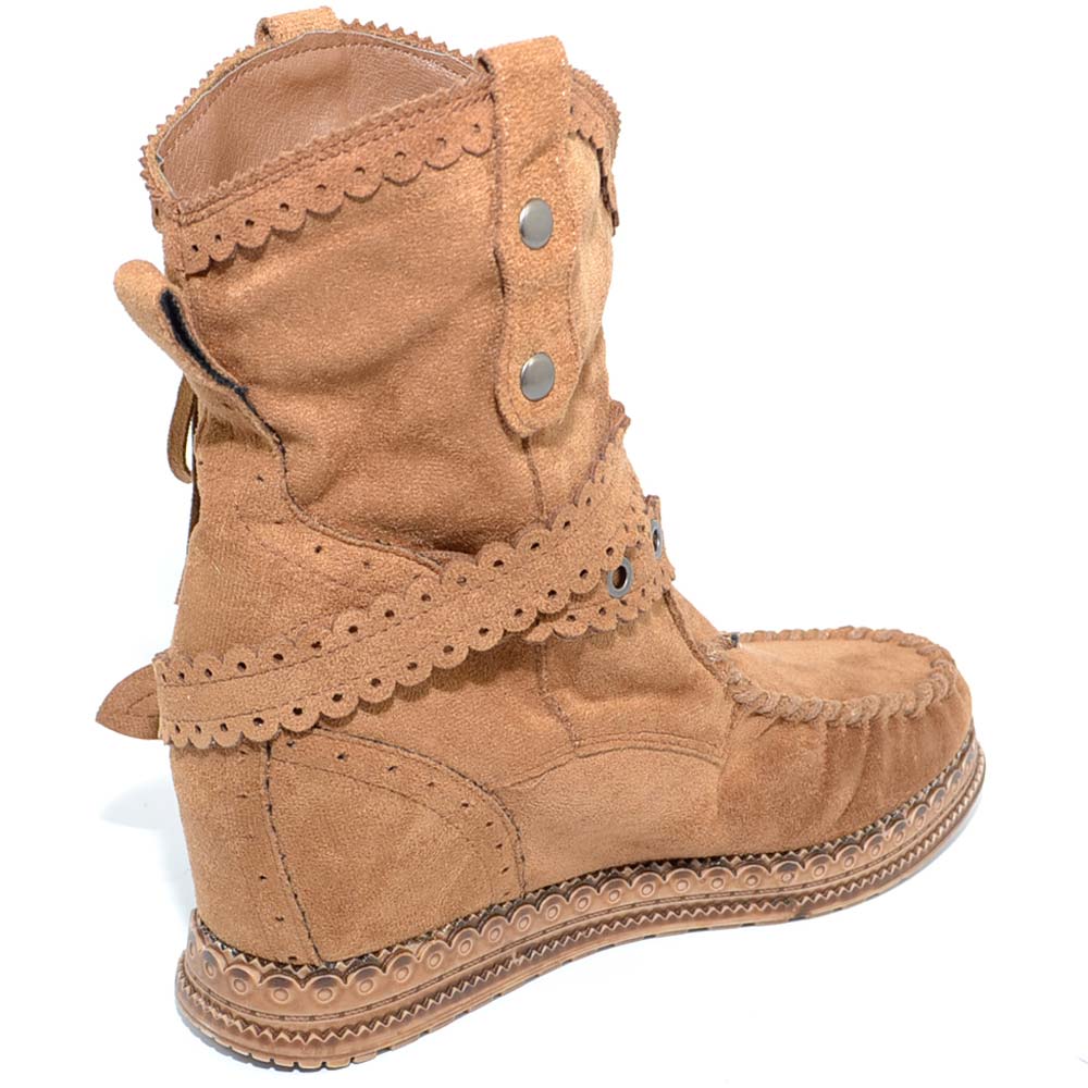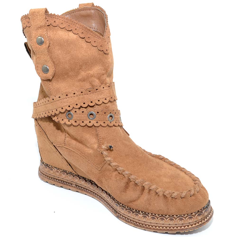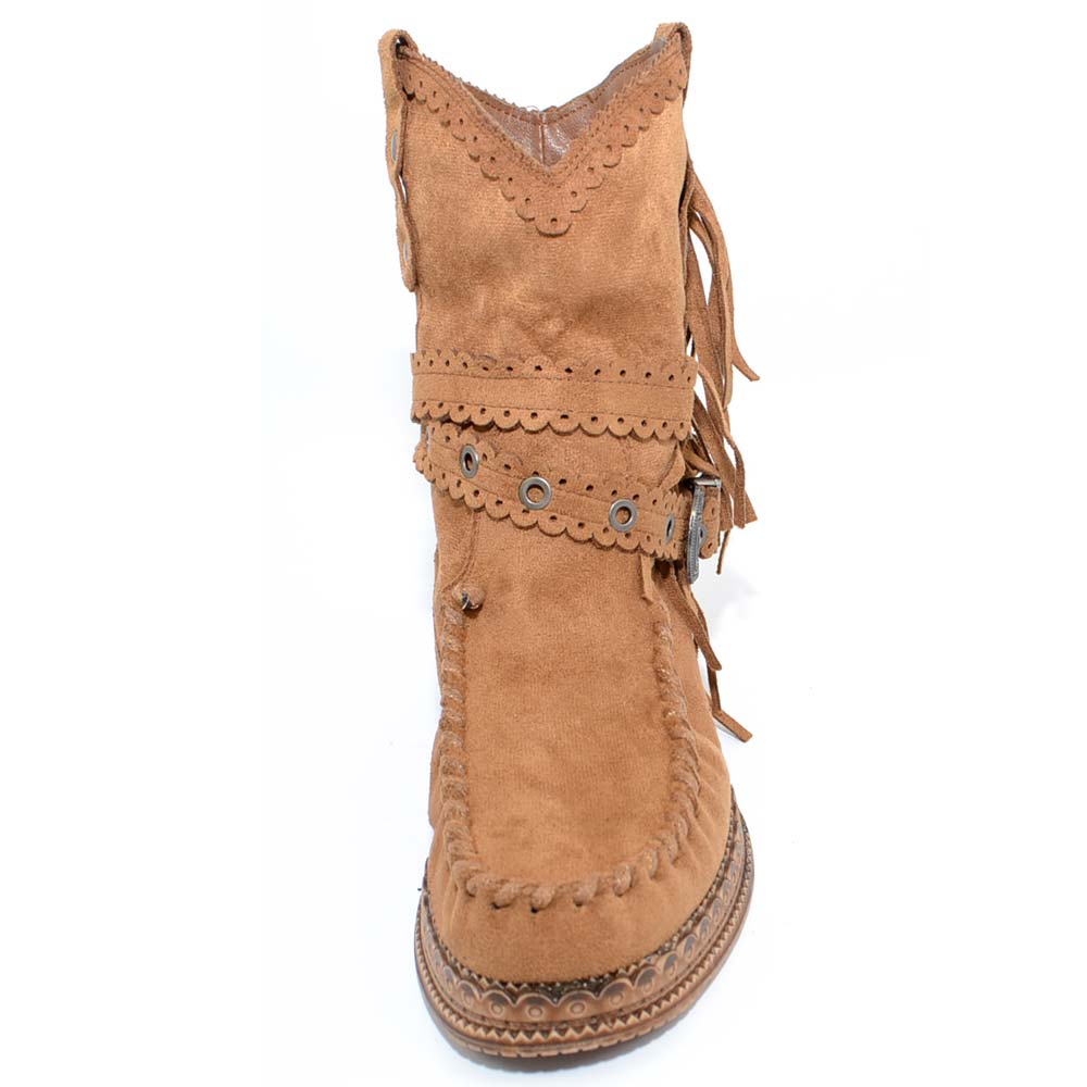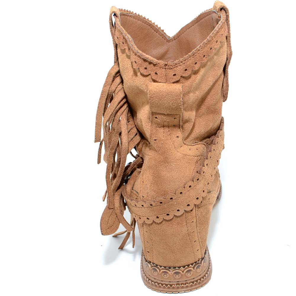 Stivaletto donna indianini marrone scamosciati con frange zeppa interna 5 cm stemma altezza caviglia moda.