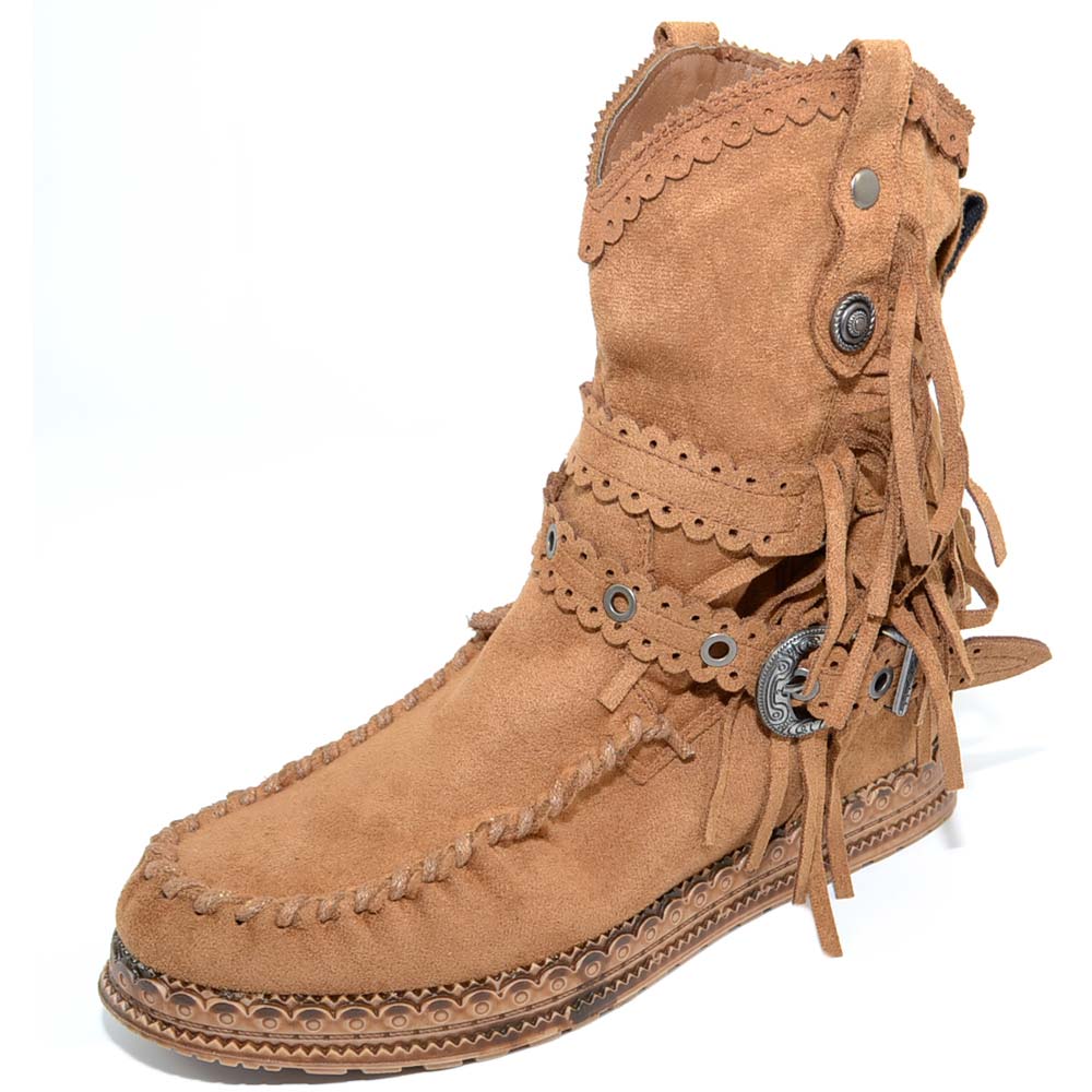 Stivaletto donna indianini cuoio scamosciati con frange zeppa interna 5 cm cinturino fibbia altezza caviglia moda
