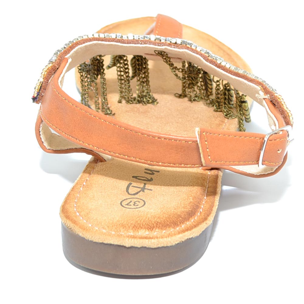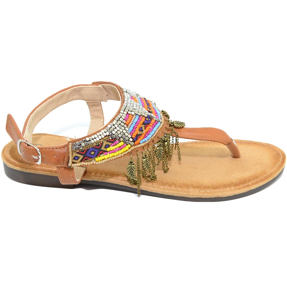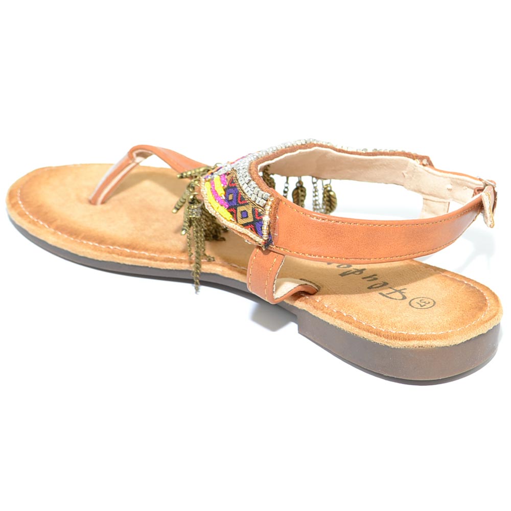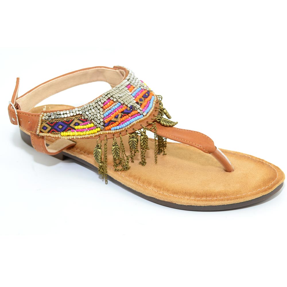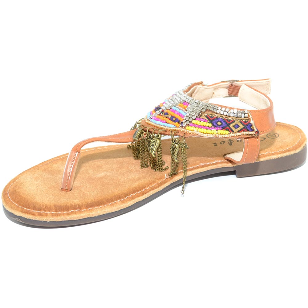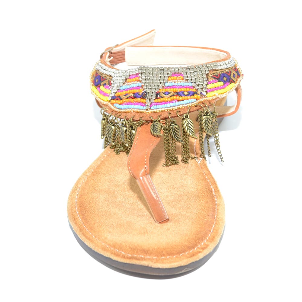 Sandalo cuoio basso infradito con frange, corallini e piume allacciato alla caviglia moda comfort estate