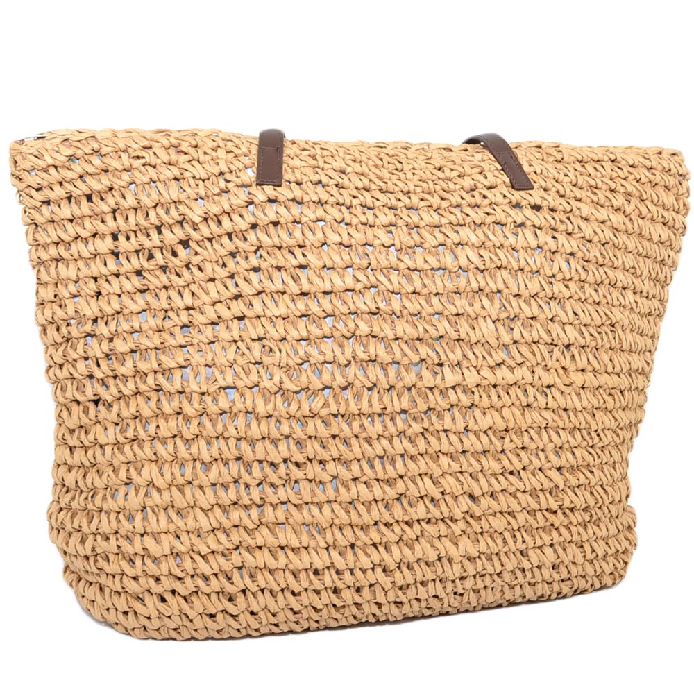 Borsa a mano di paglia donna morbida beige rettangolare grande manico in pelle con zip da mare foderata in raso moda