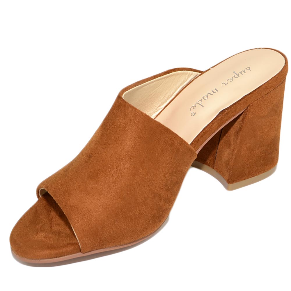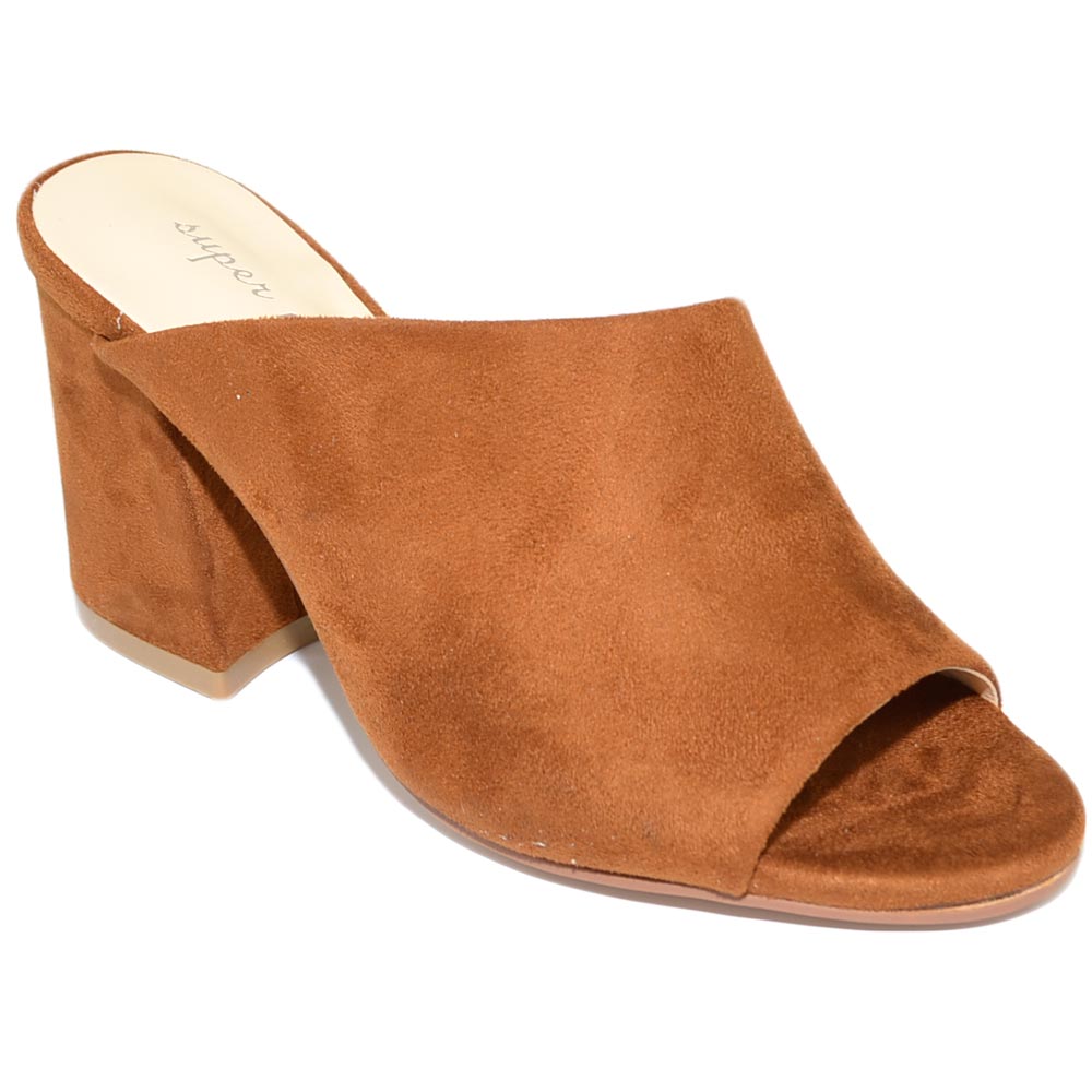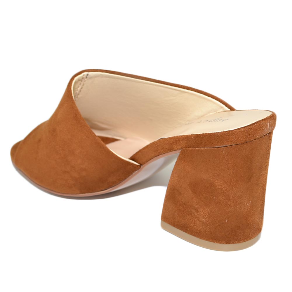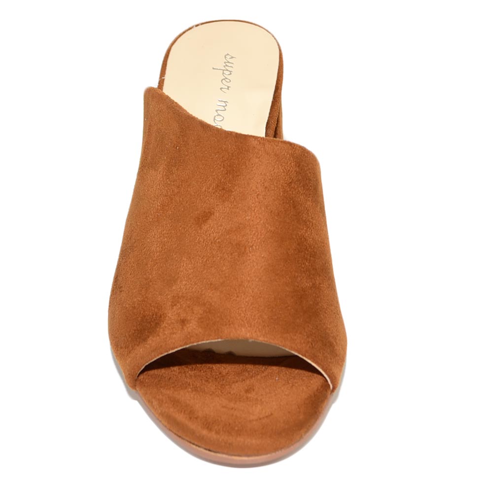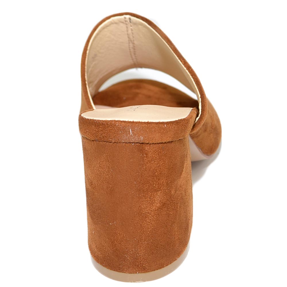 Sabot donna cuoio bruciato scamosciato sandali tallone aperto scollo asimmetrico unica fascia basic tacco comodo grosso