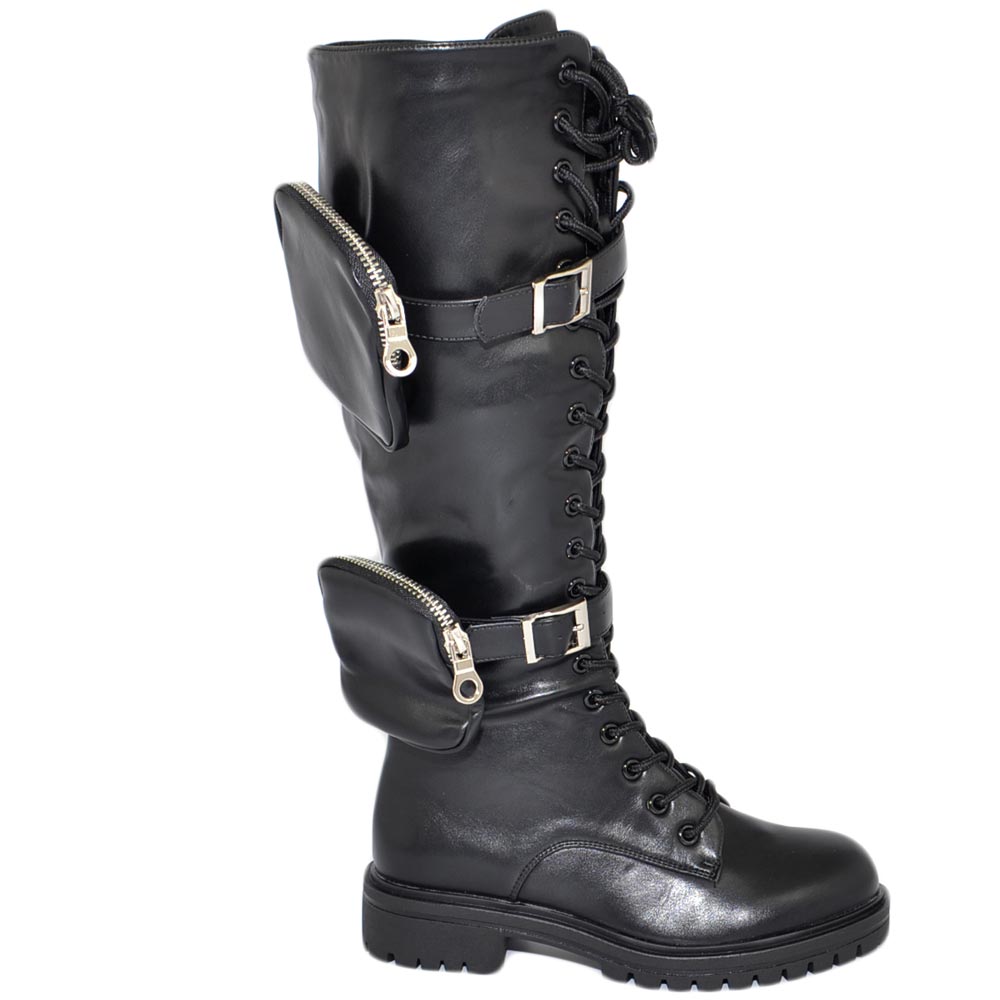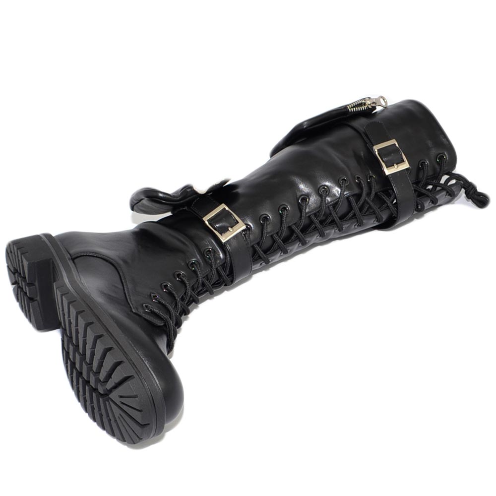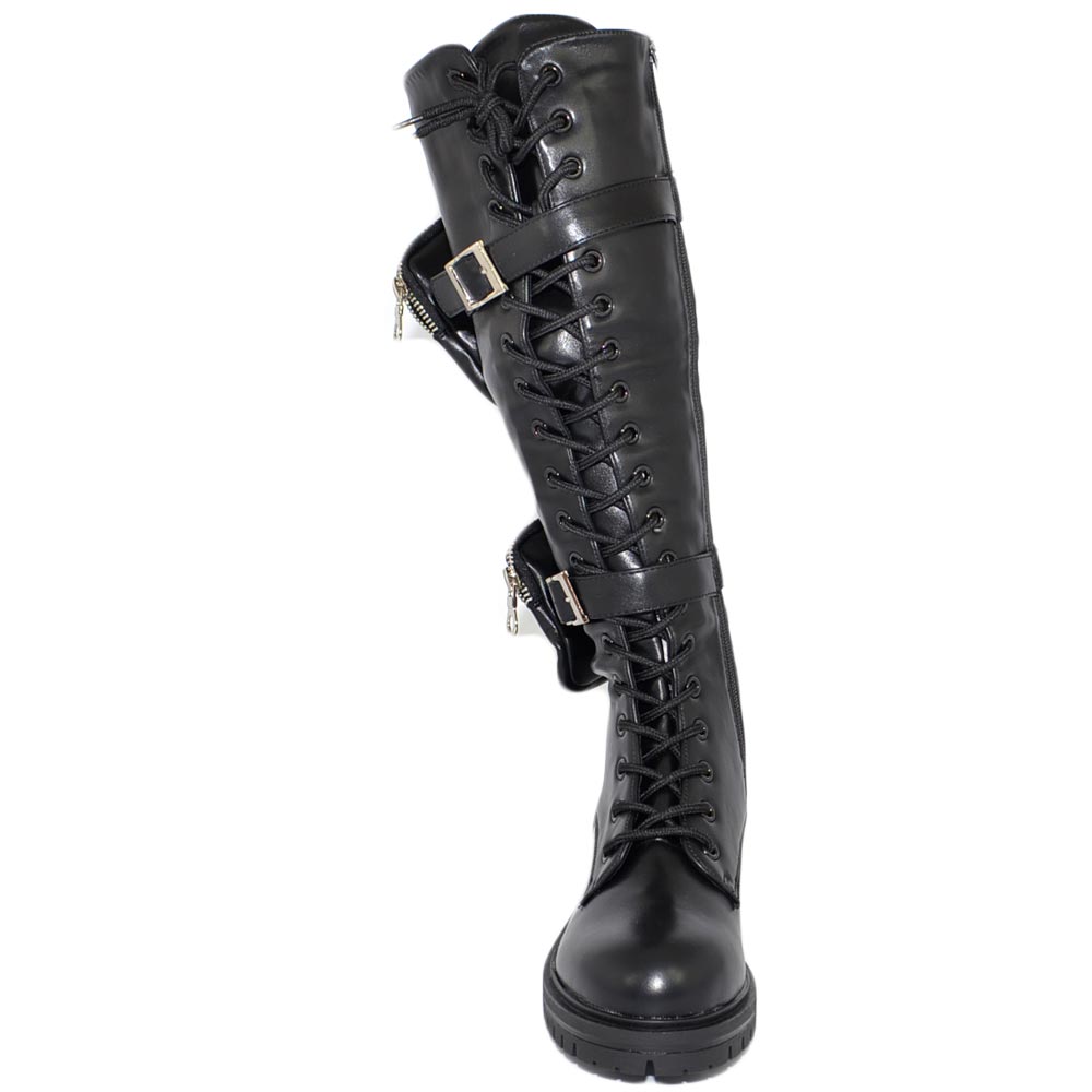 Stivali anfibi donna platform modello chiara doppio taschino zip altezza ginocchio moda street lacci lunghi regolabili