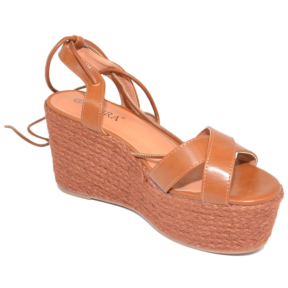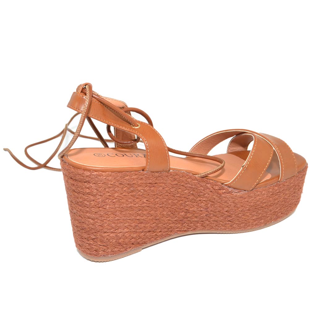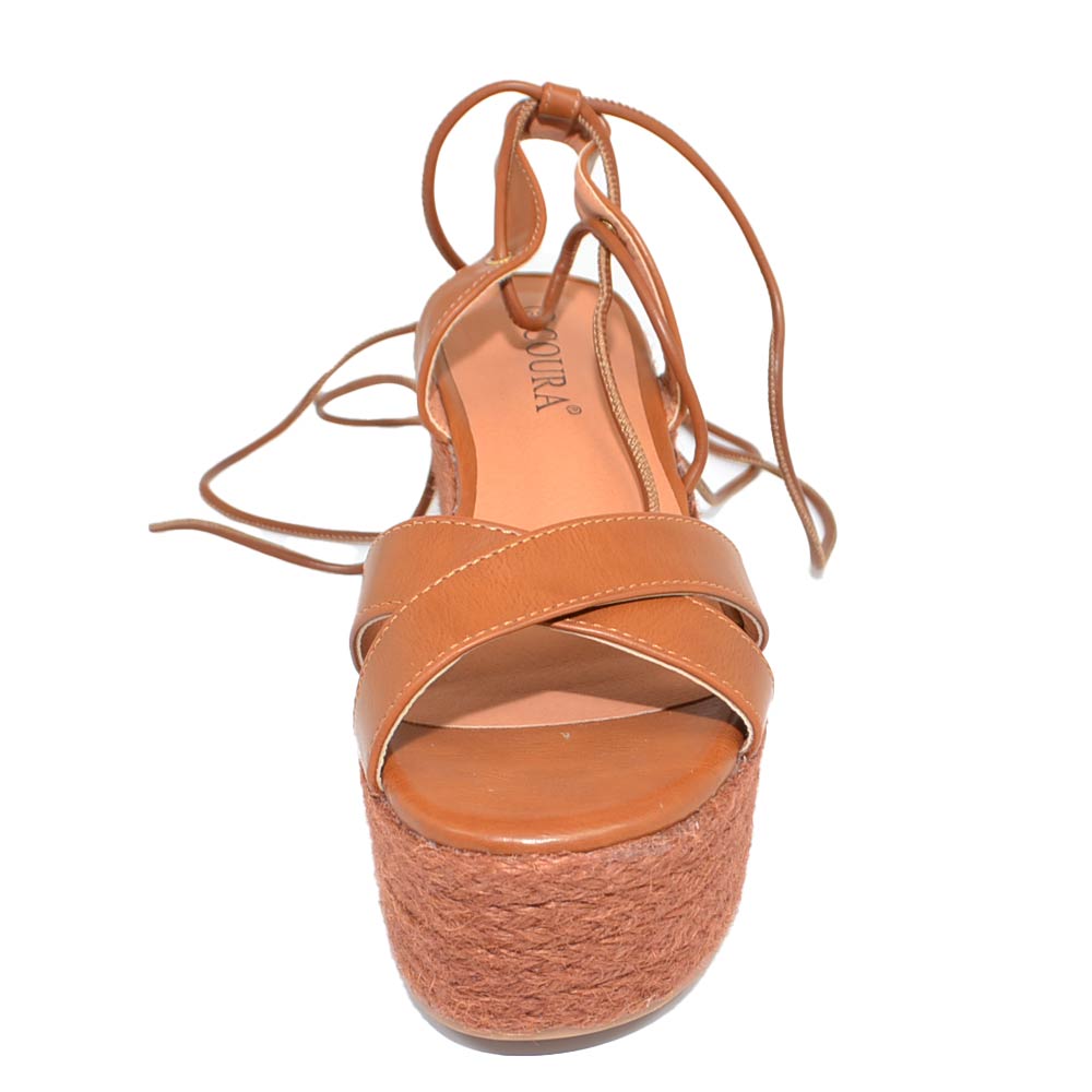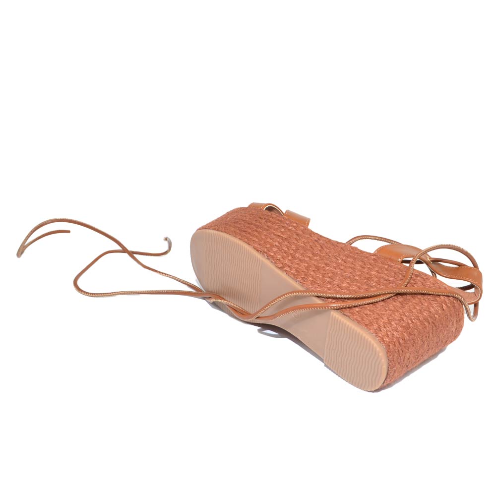 Zeppa donna cuoio con fascia geisha intrecciata e laccio alla schiava con fondo paglia moda estate donna Positano