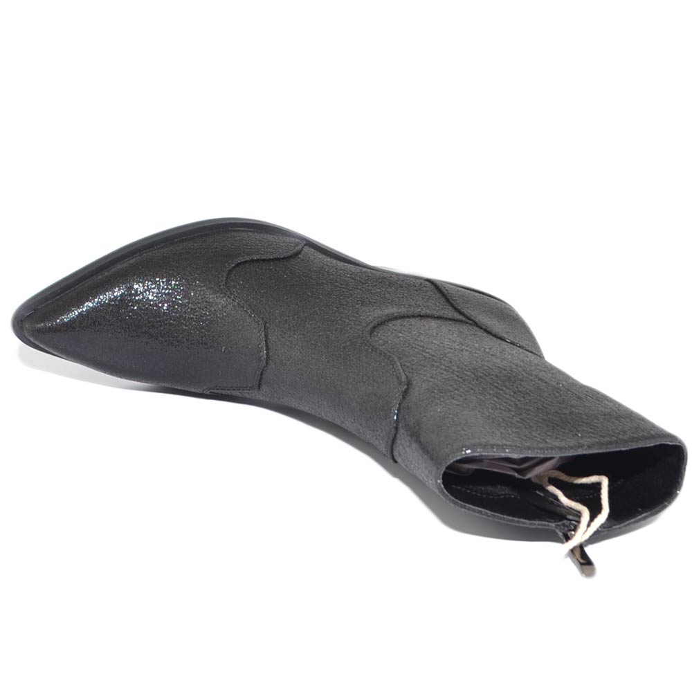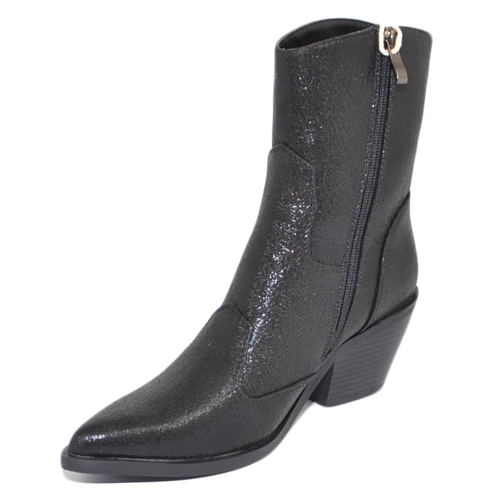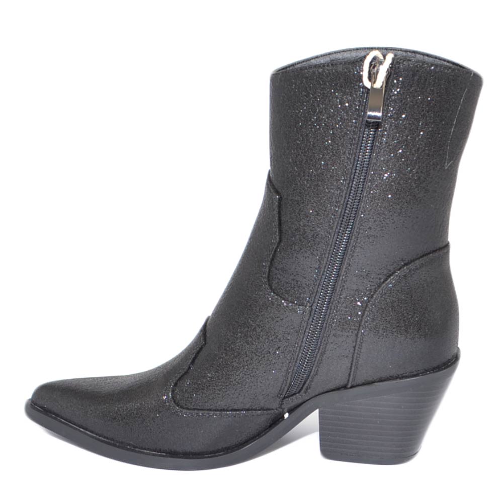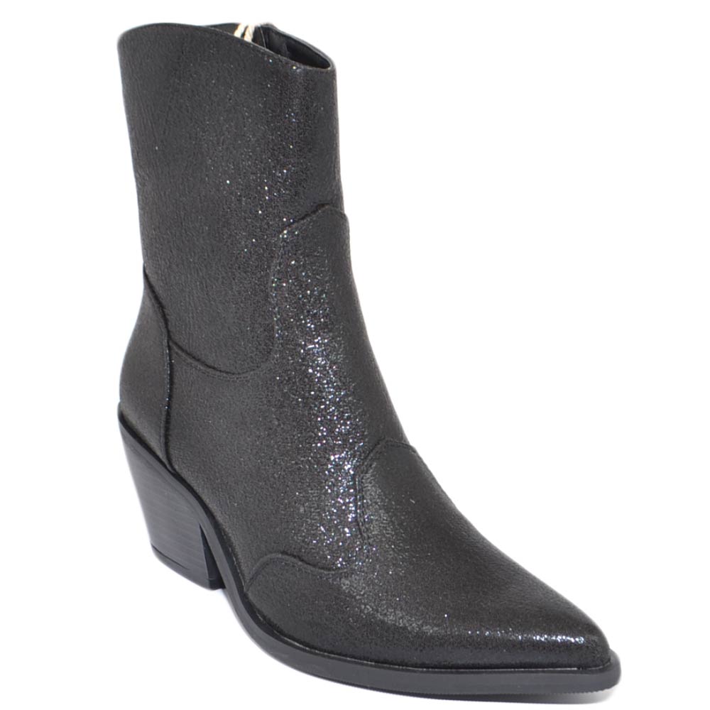 Tronchetto donna camperos stivaletto nero in lurex satinato con tacco western 5 cm comodo moda trend