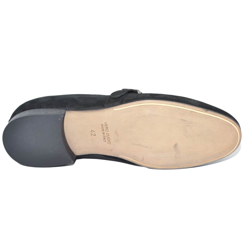 Scarpe uomo mocassino fibbia doppia nero spazzolato in vera pelle nappa fondo gomma alto 3 cm con cuciture elegante.