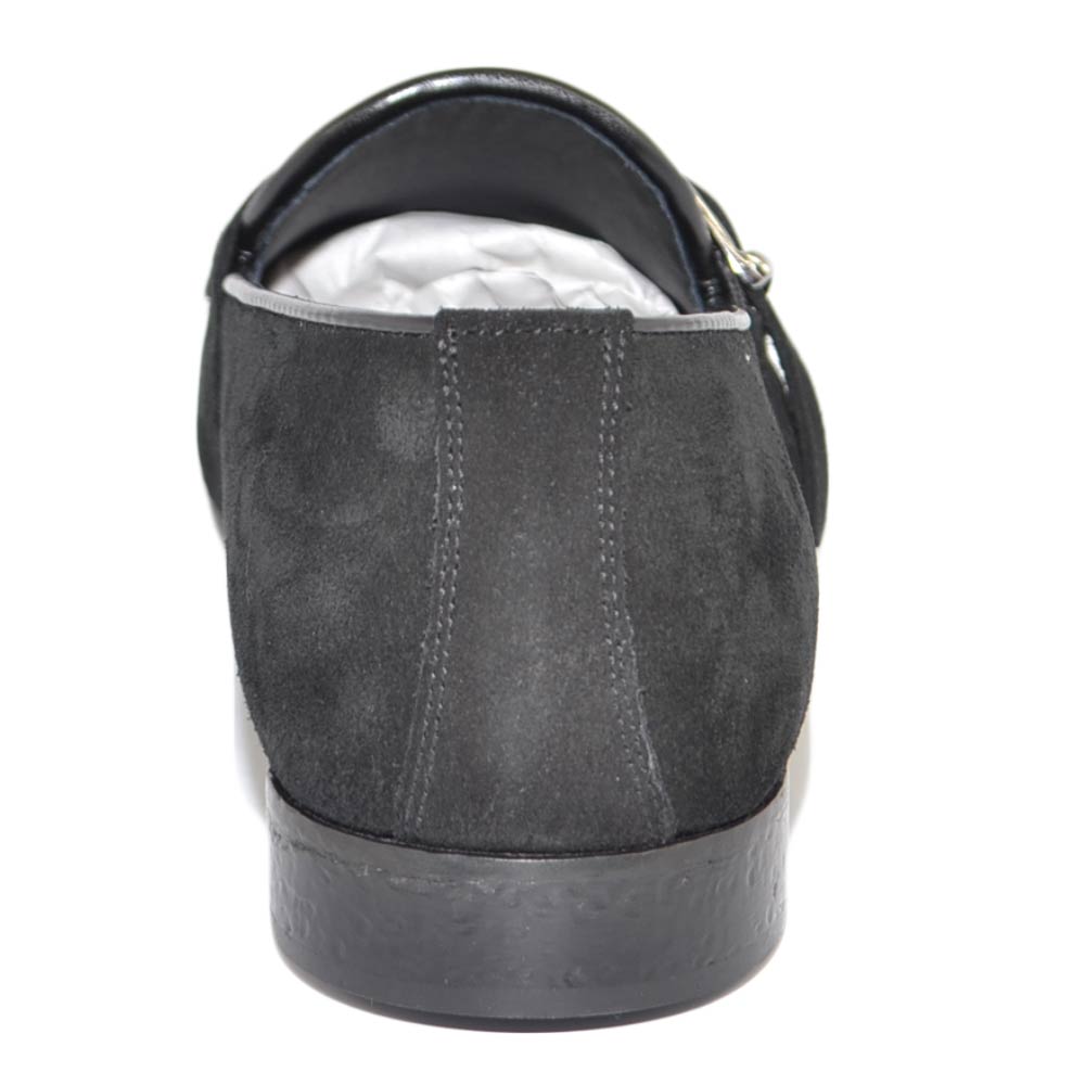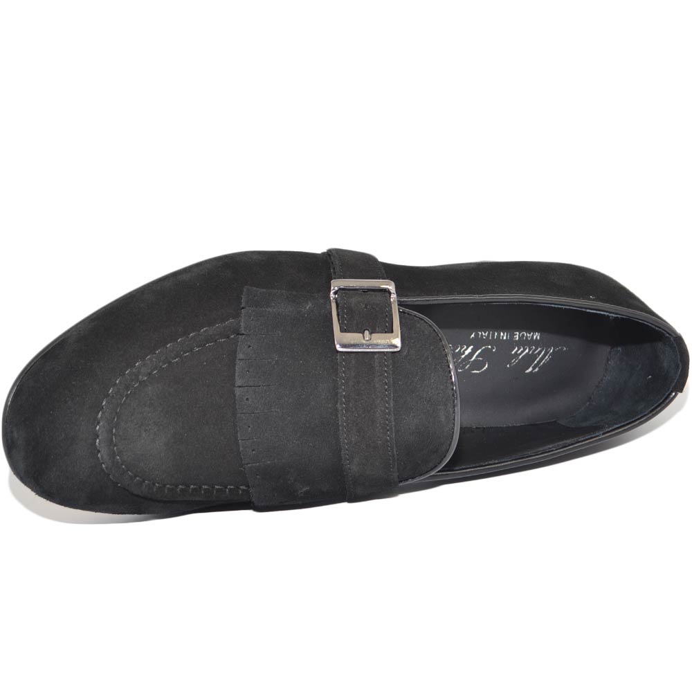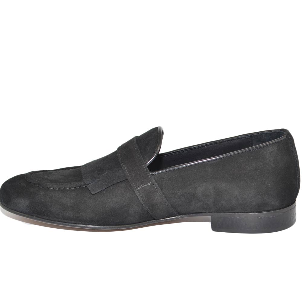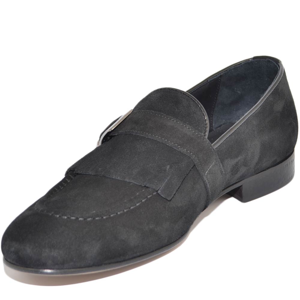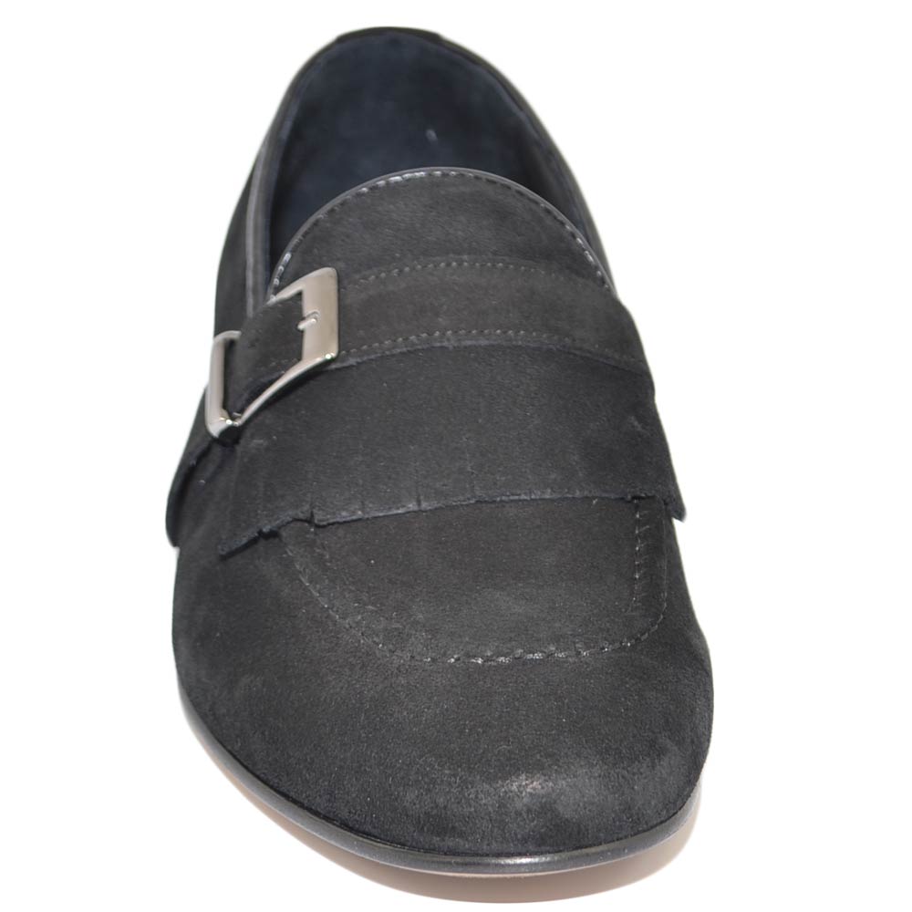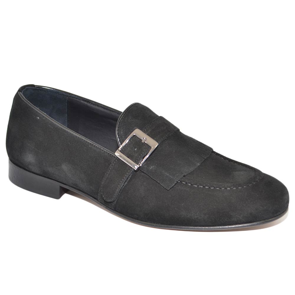 Mocassino derby uomo nero in vera pelle scamosciata con fibbia frange linea dandy vintage suola in vero cuoio contrasto
