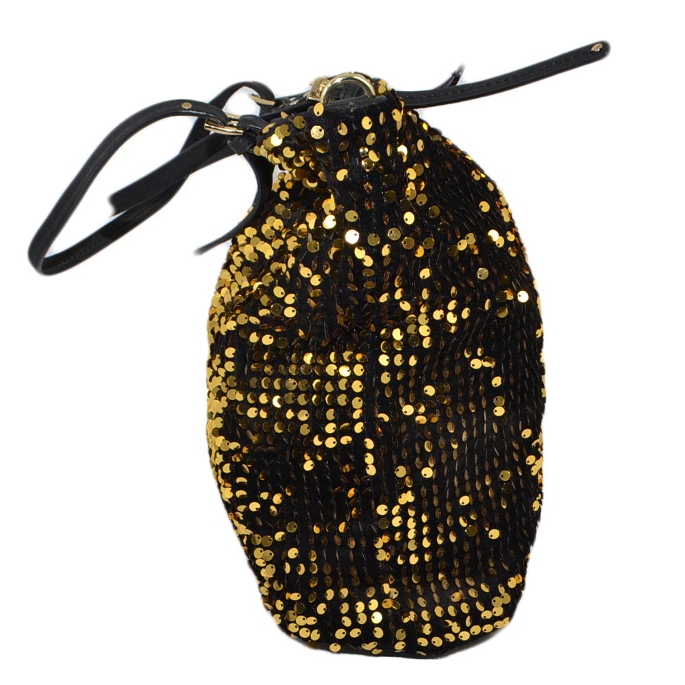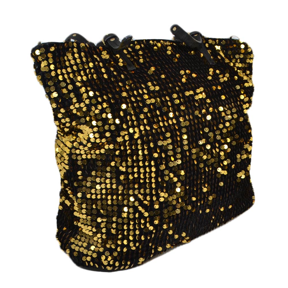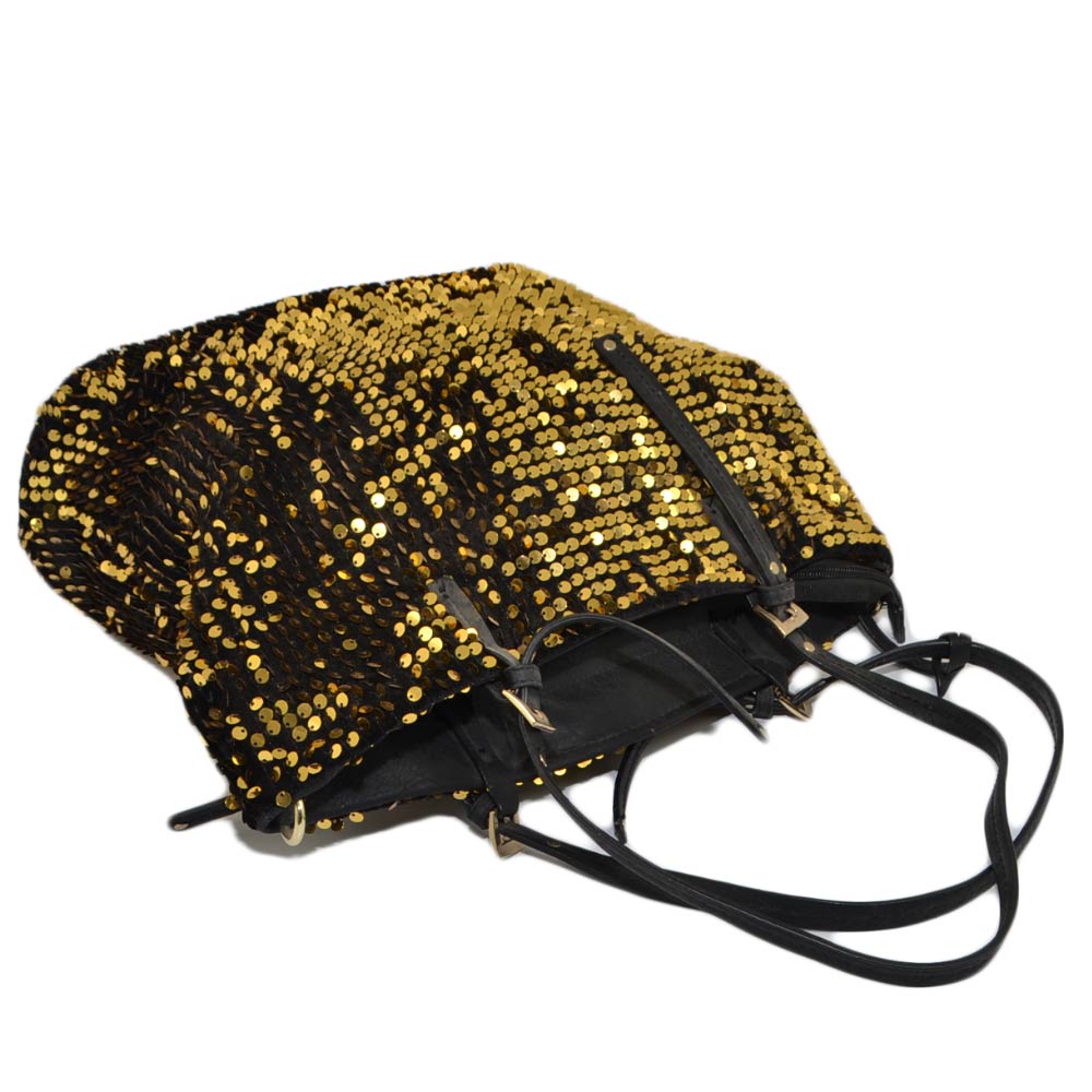 Borsa shopping nera con paillettes oro chiusura zip morbida comoda bagaglio a mano scompartimenti interni viaggio