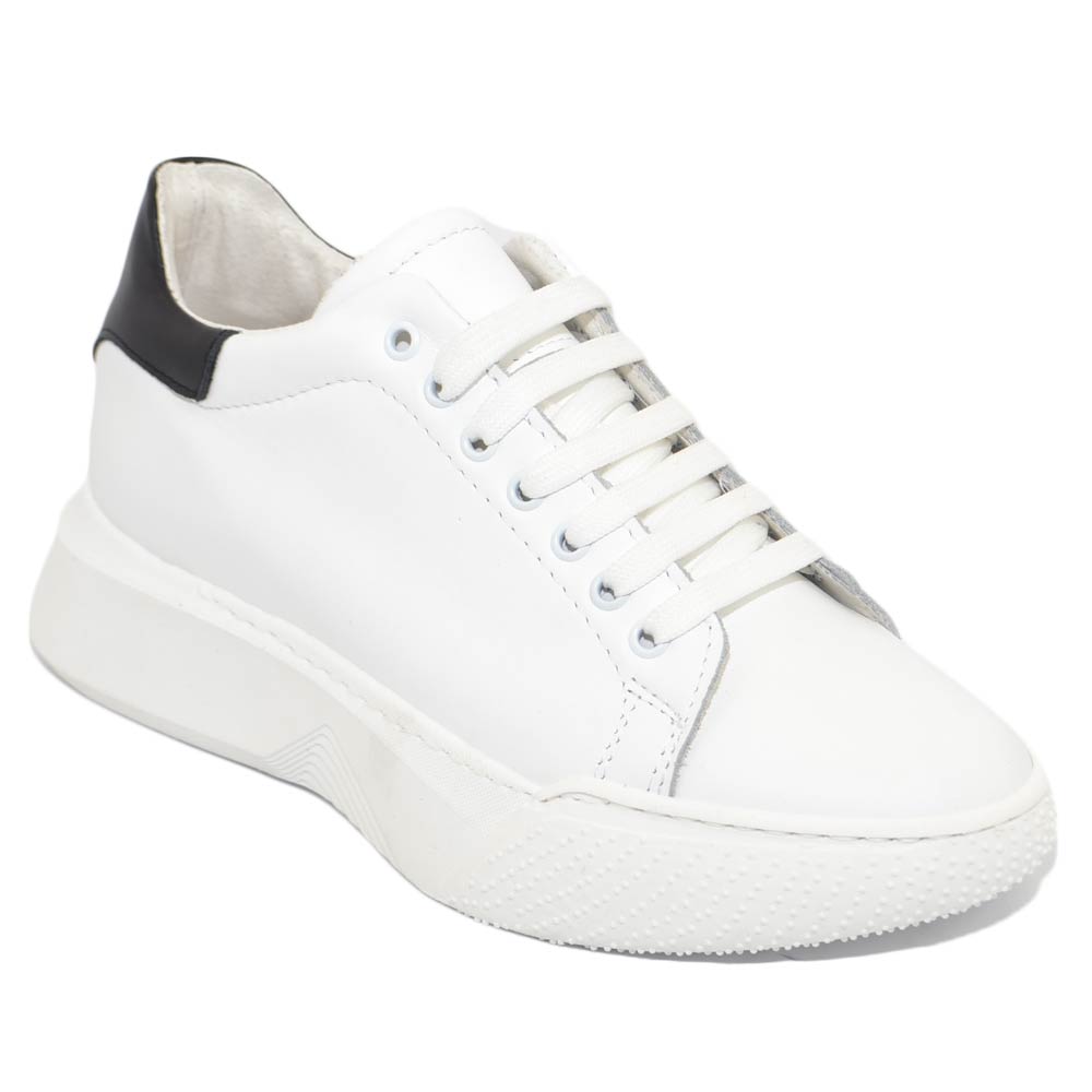 Sneakers uomo bianca in vera pelle bianca con riporto nero fondo alto asimmetrico Gels moda street made in italy ragazzo