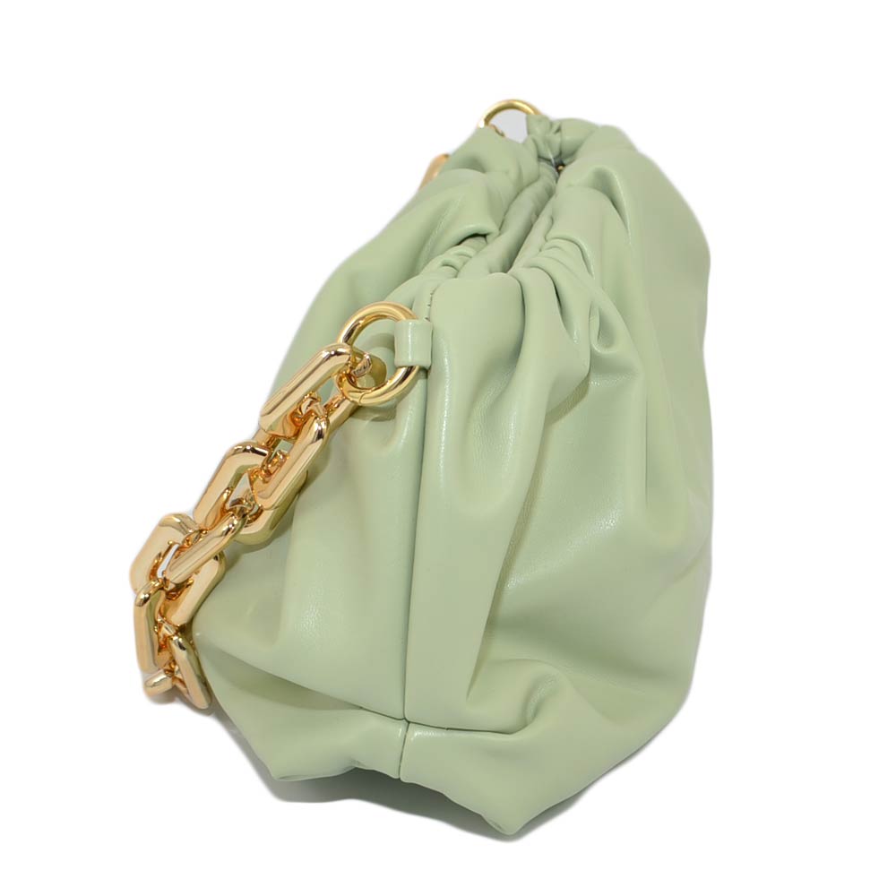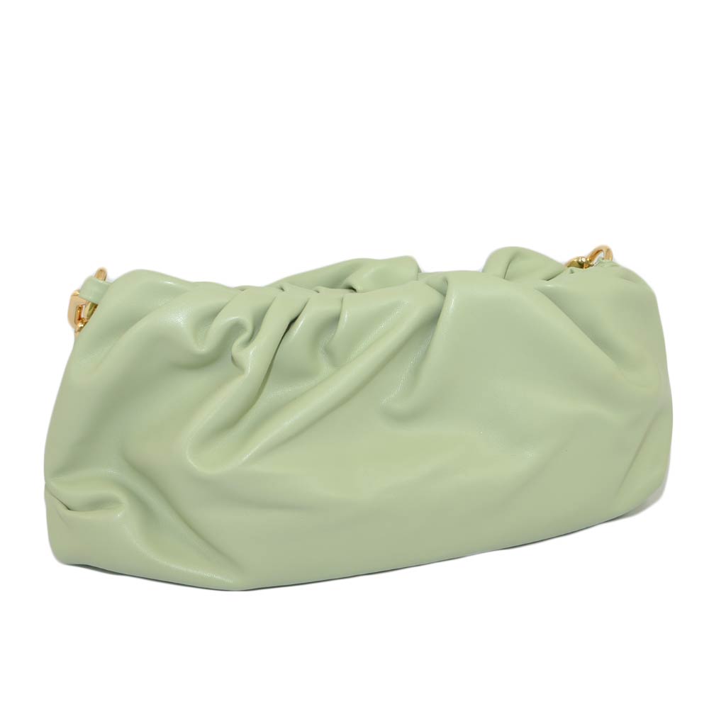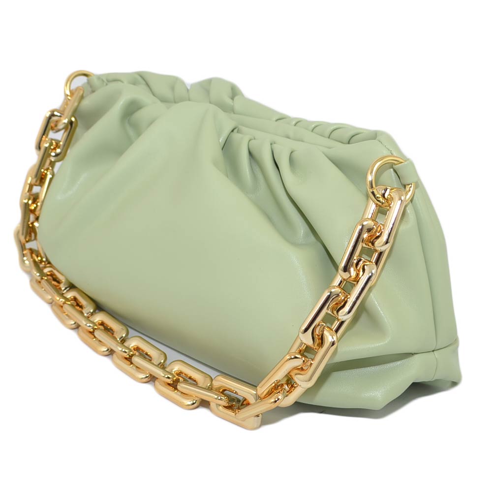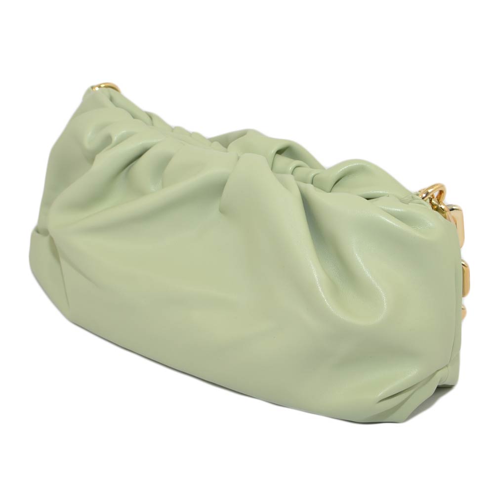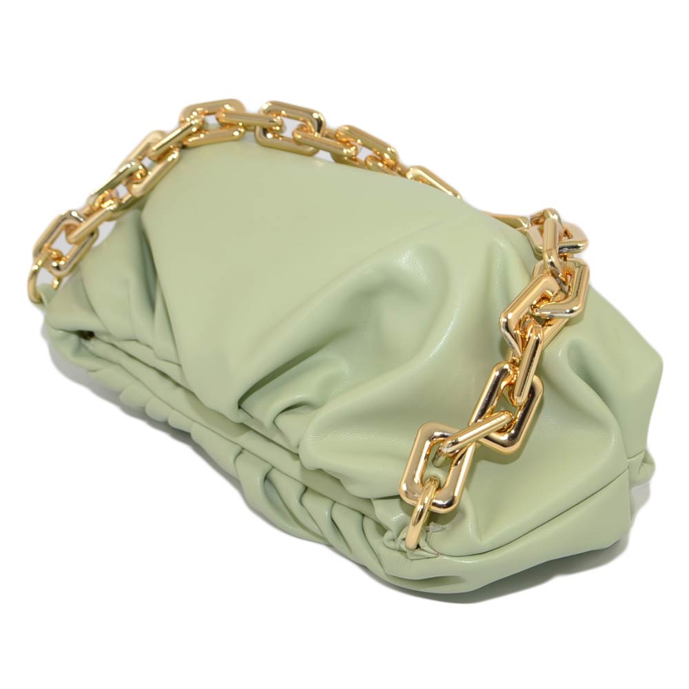 Borsa donna pochette latte e menta verde arricciata clutch a mano con catena grande oro tracolla pelle chiusura pluc