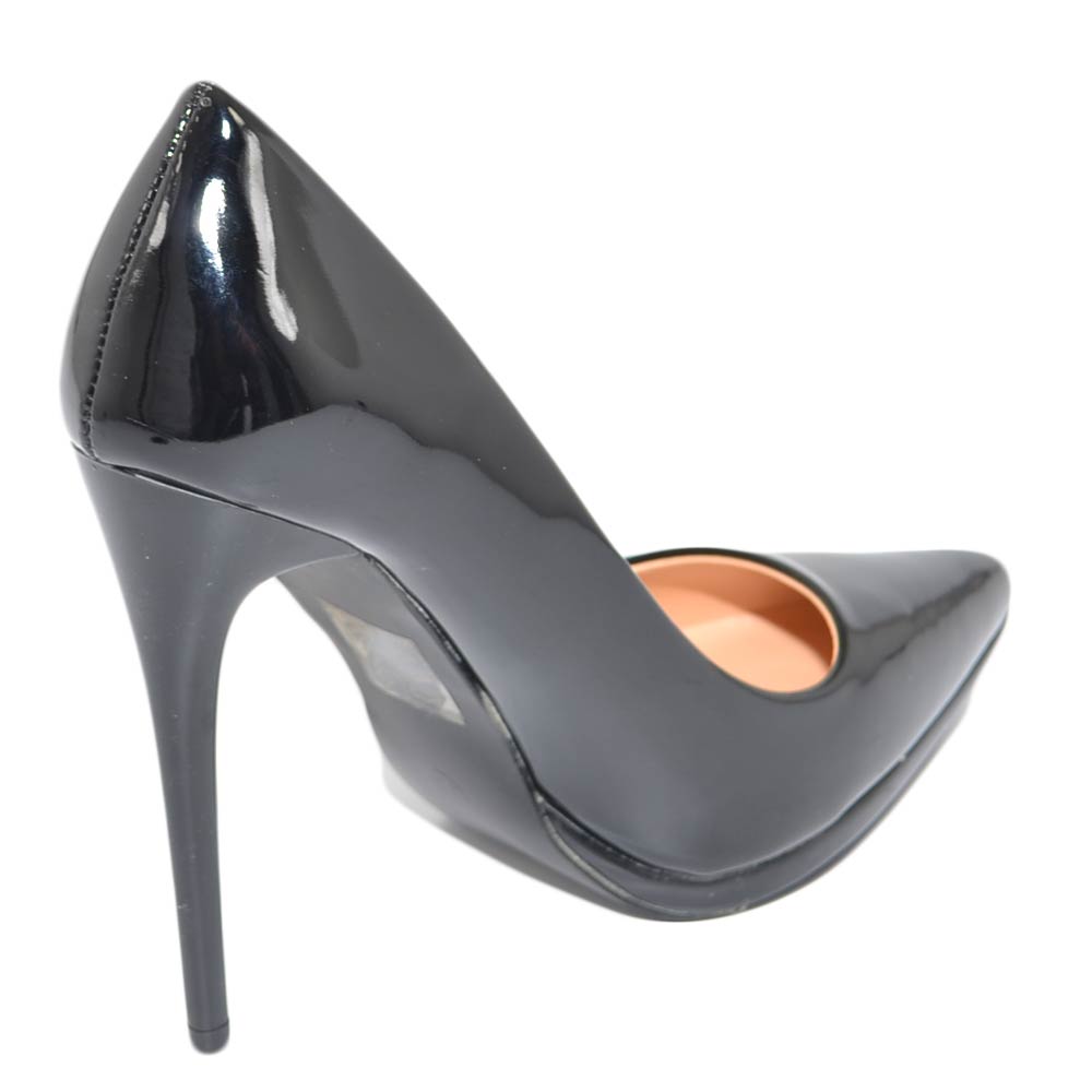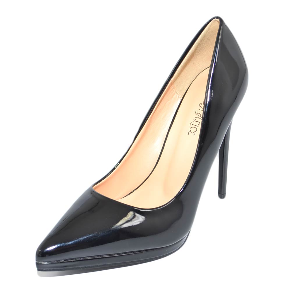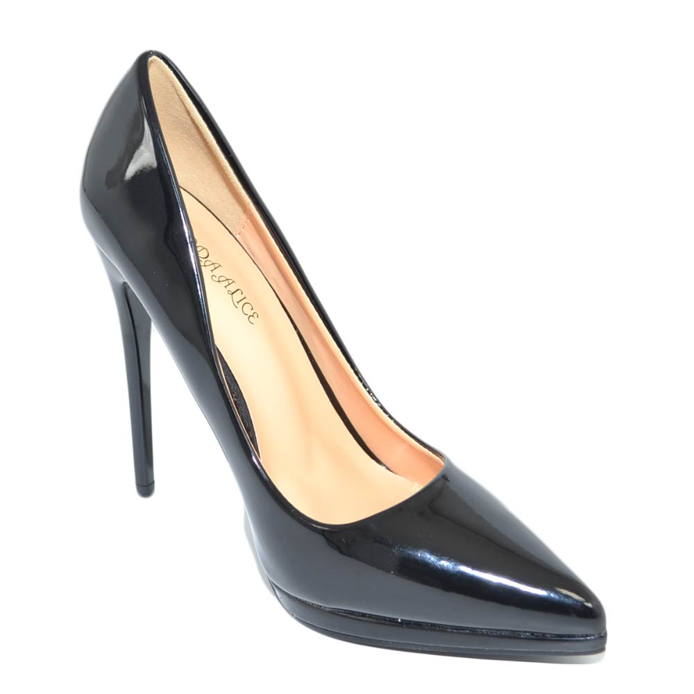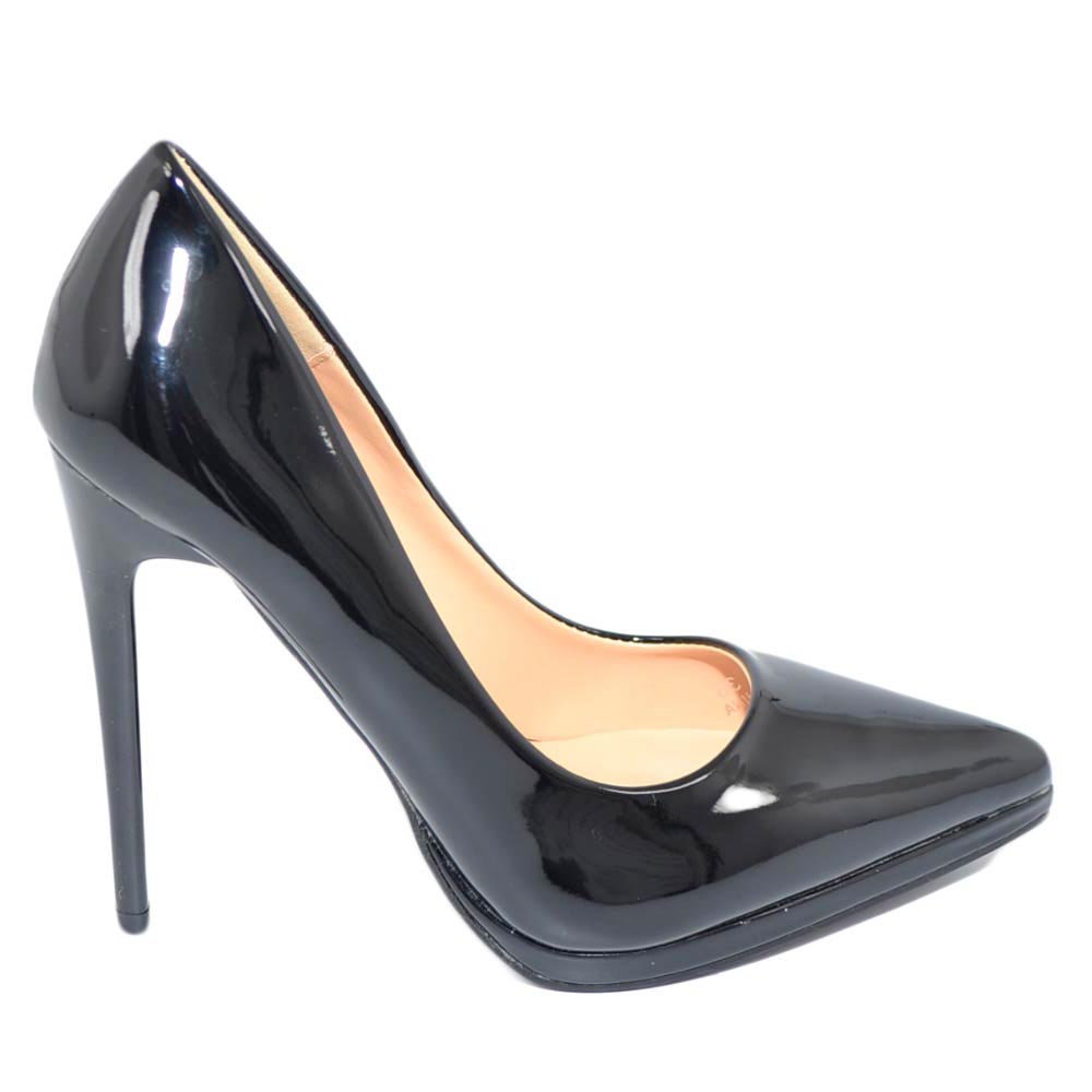 Decollete' donna a punta nero tacco a spillo 12 cm lucido vernice comode plateau scarpe per cerimonie eventi