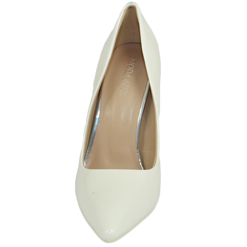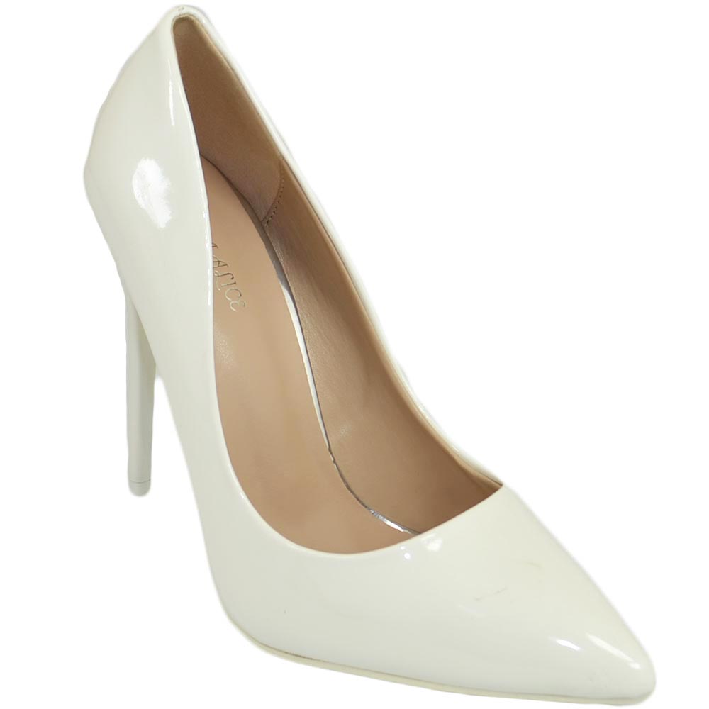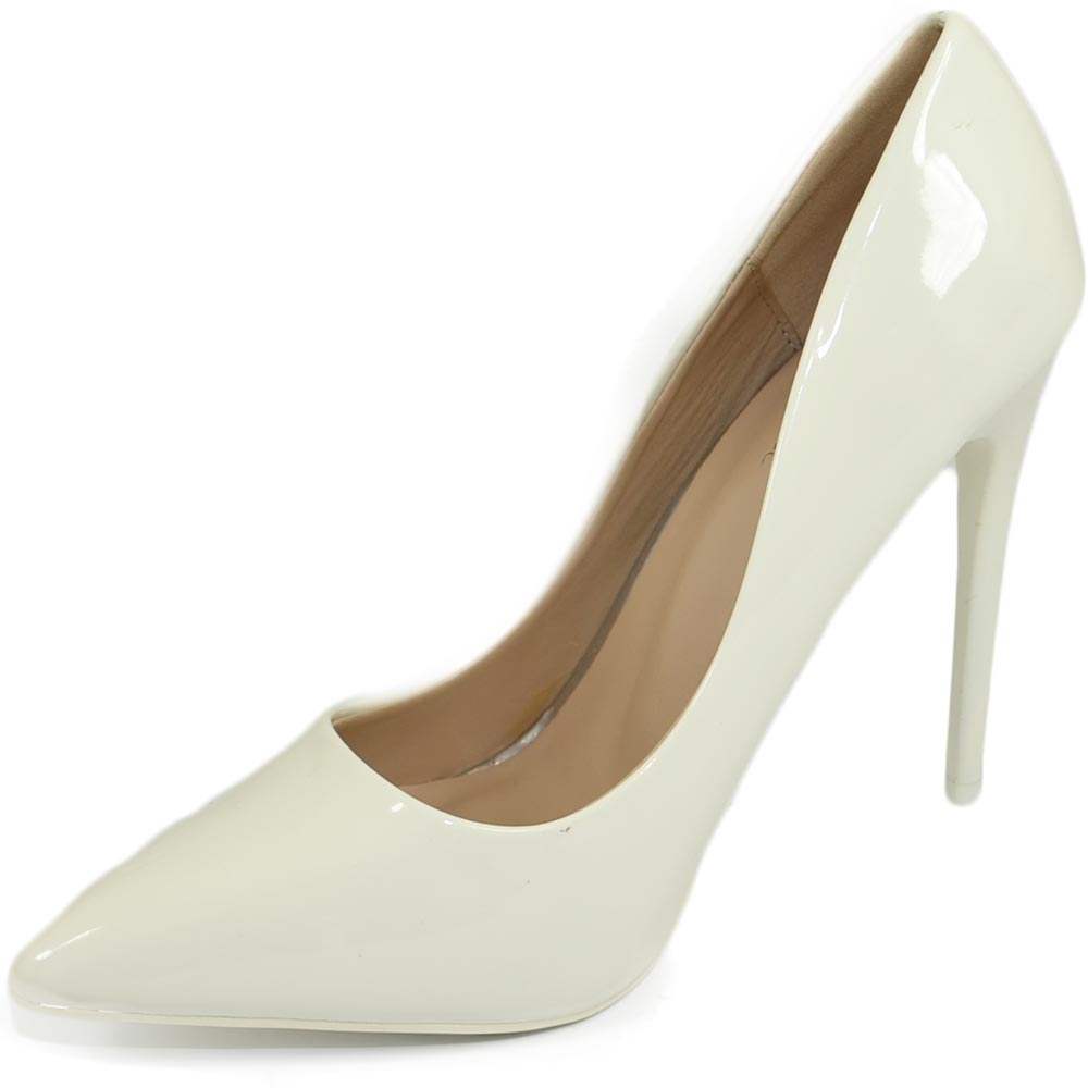 Decollete' donna a punta bianco tacco a spillo 12 cm vernice comode lucido scarpe per cerimonie eventi sposa matrimonio