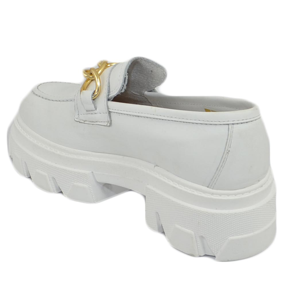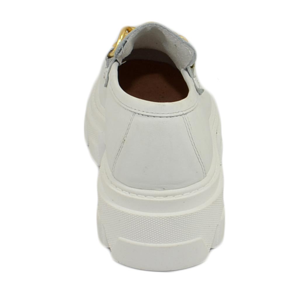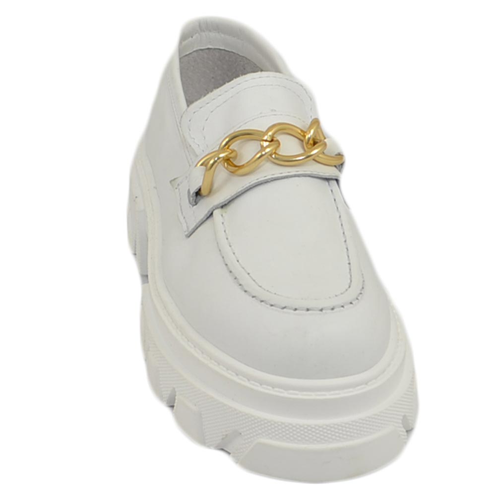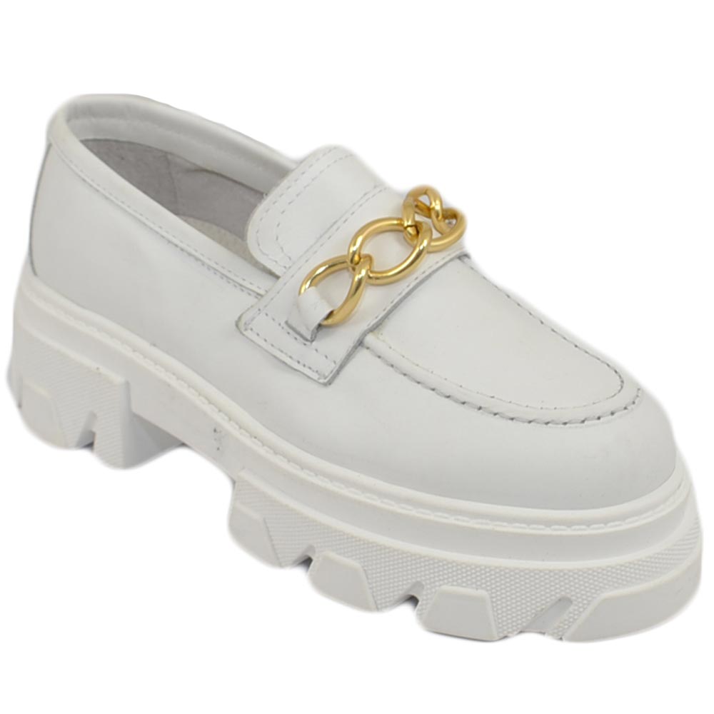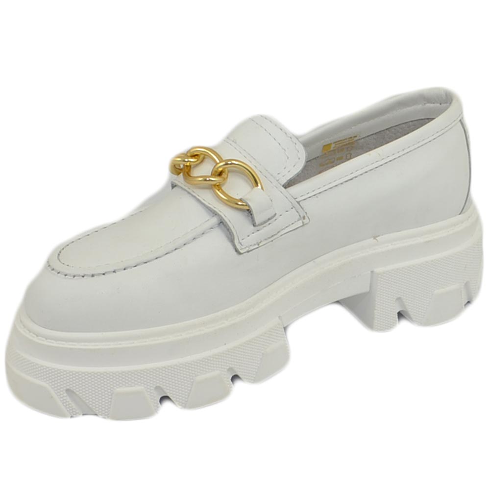 Mocassini donna combat college bianc con catena fondo platform in gomma light in vera pelle Made in Italy moda tendenza