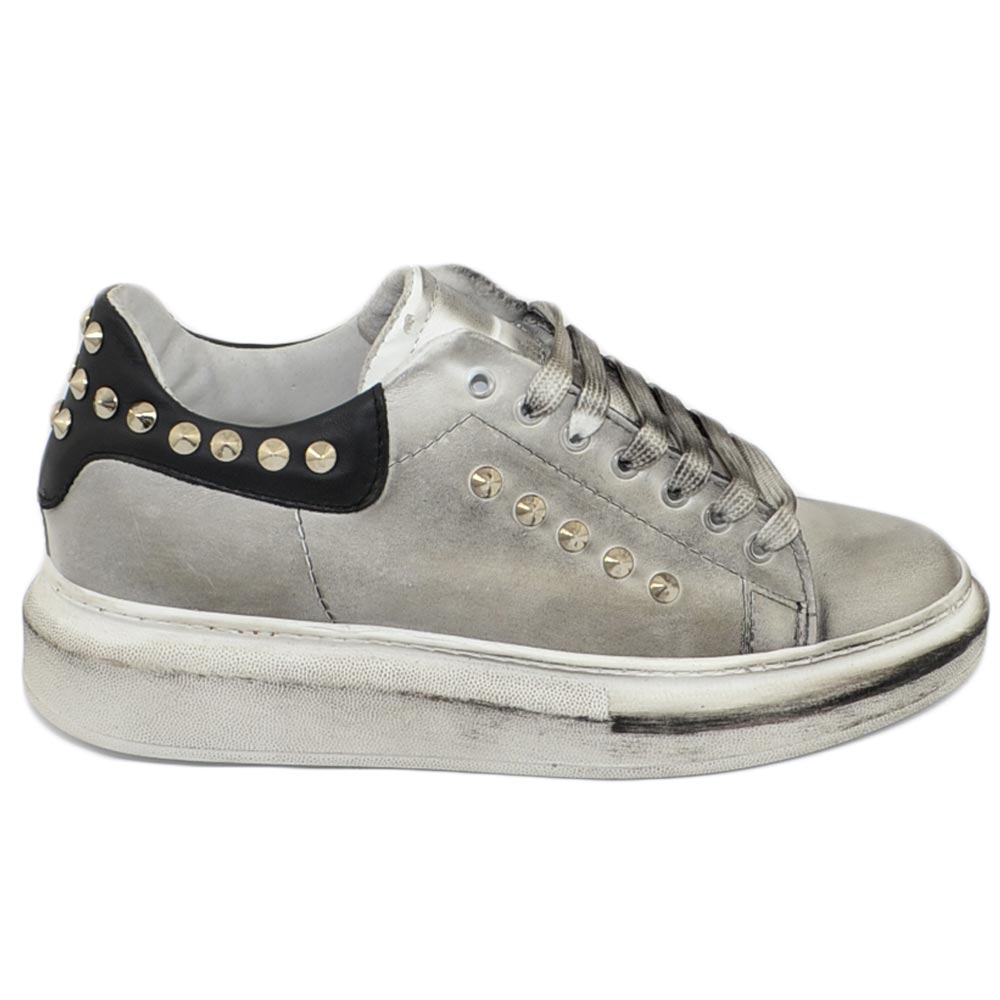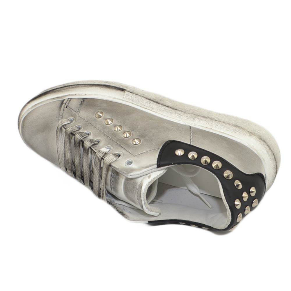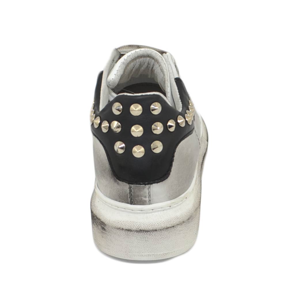 Sneakers uomo bianca in vera pelle effetto sporco con borchie retro e laterali fortino nero fondo Kevin moda uomo street
