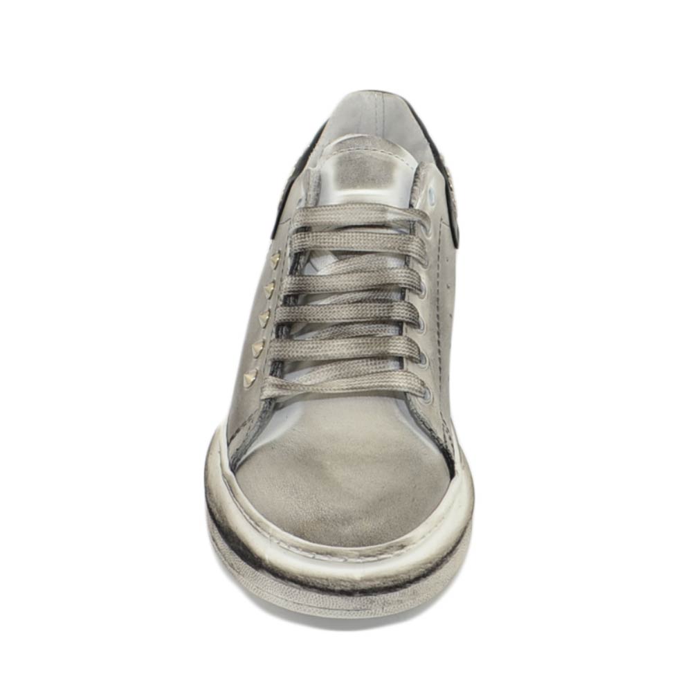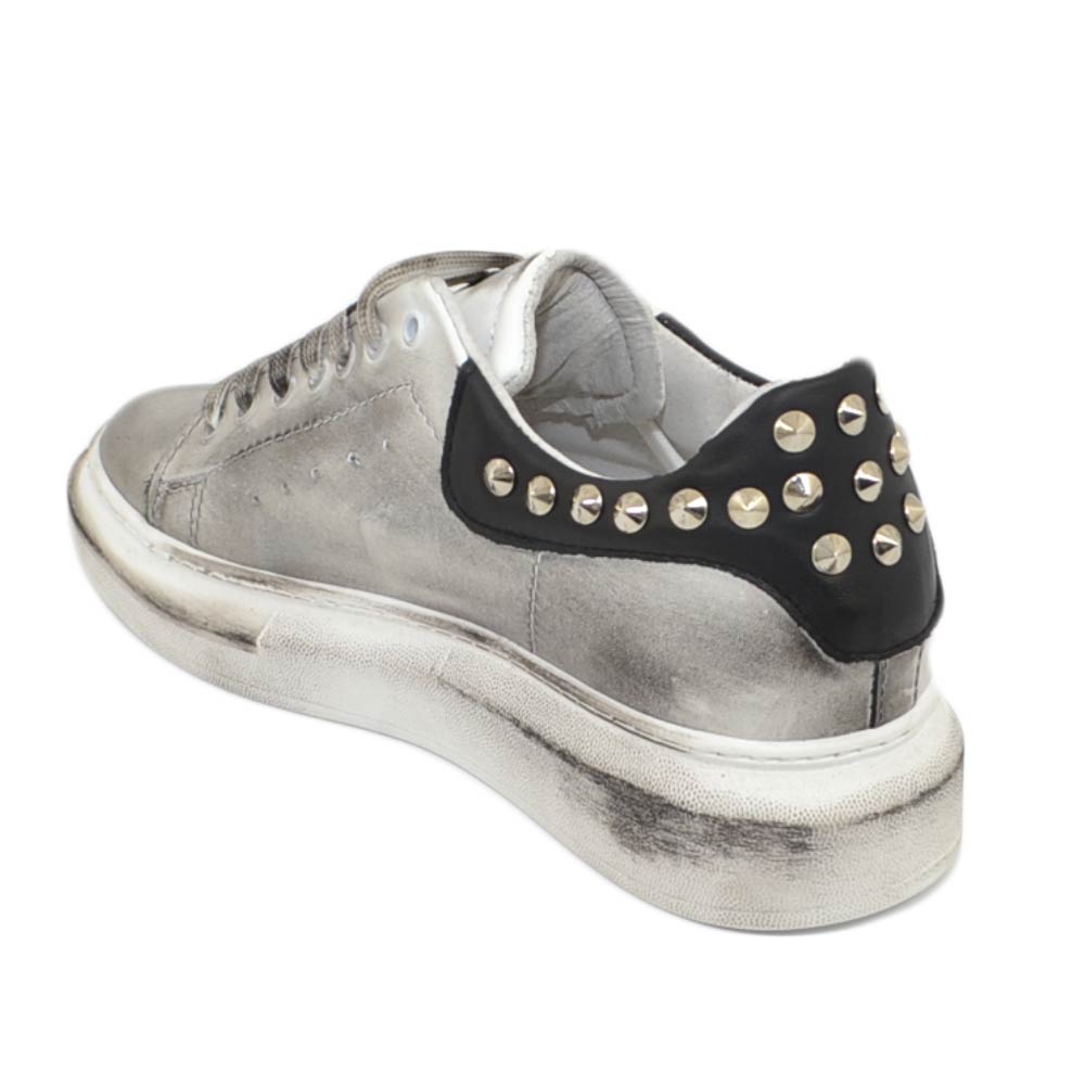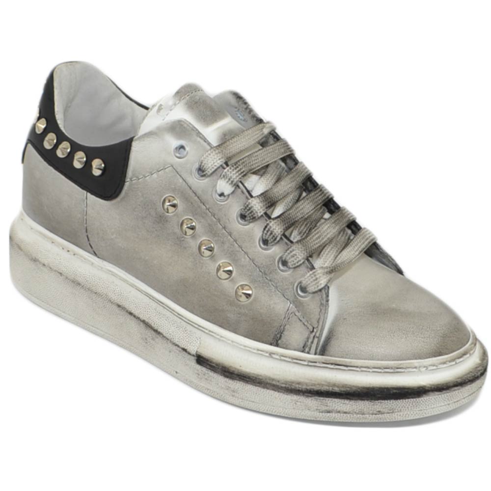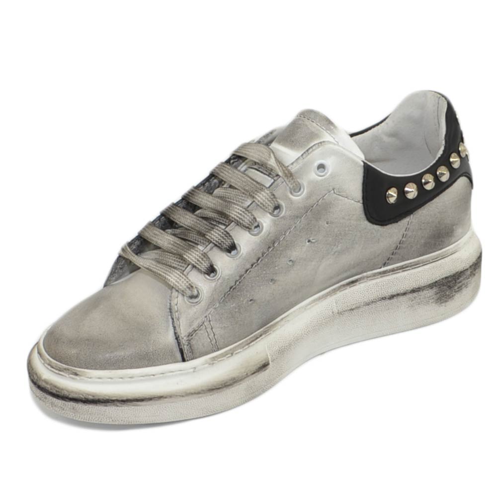 Sneakers uomo bianca in vera pelle effetto sporco con borchie retro e laterali fortino nero fondo Kevin moda uomo street