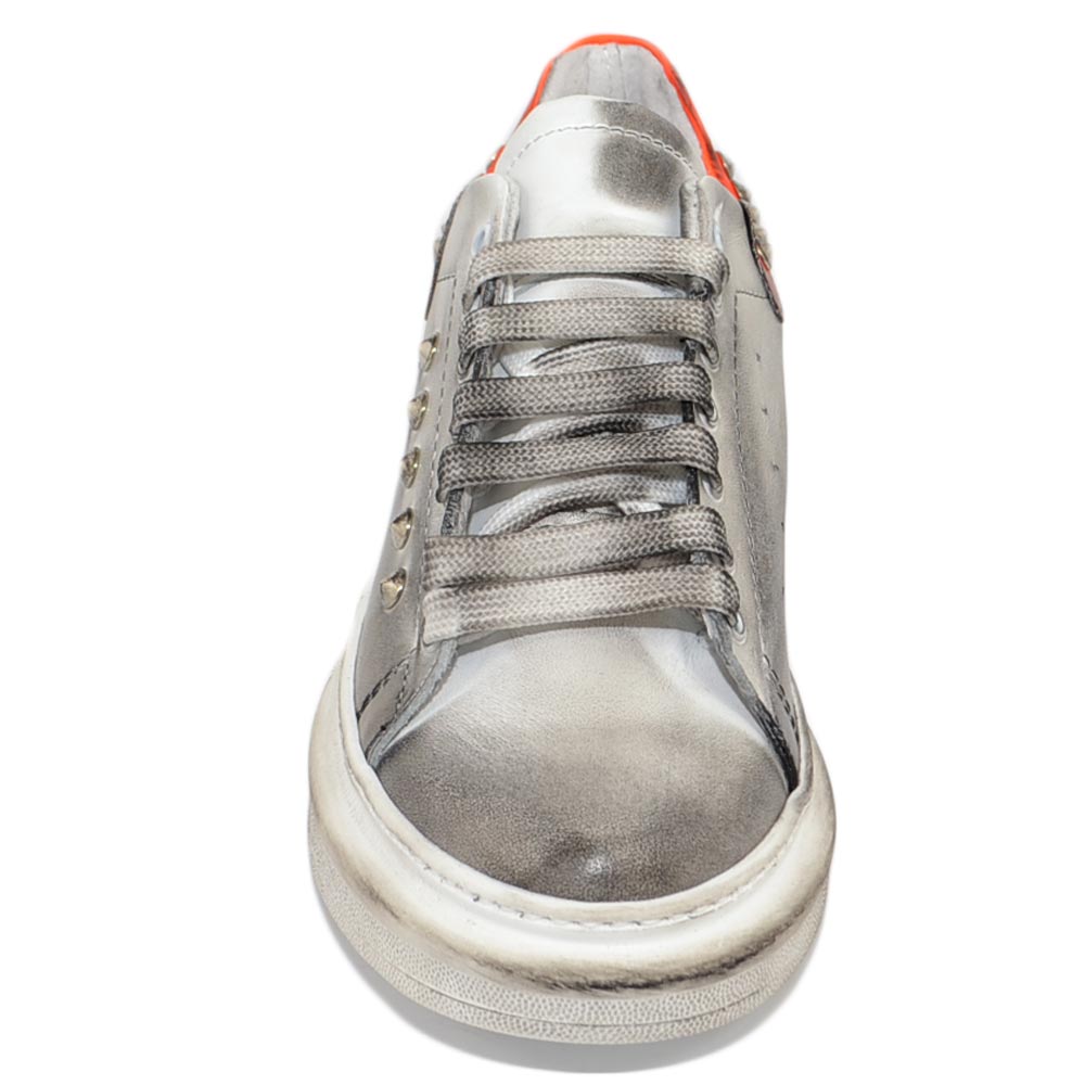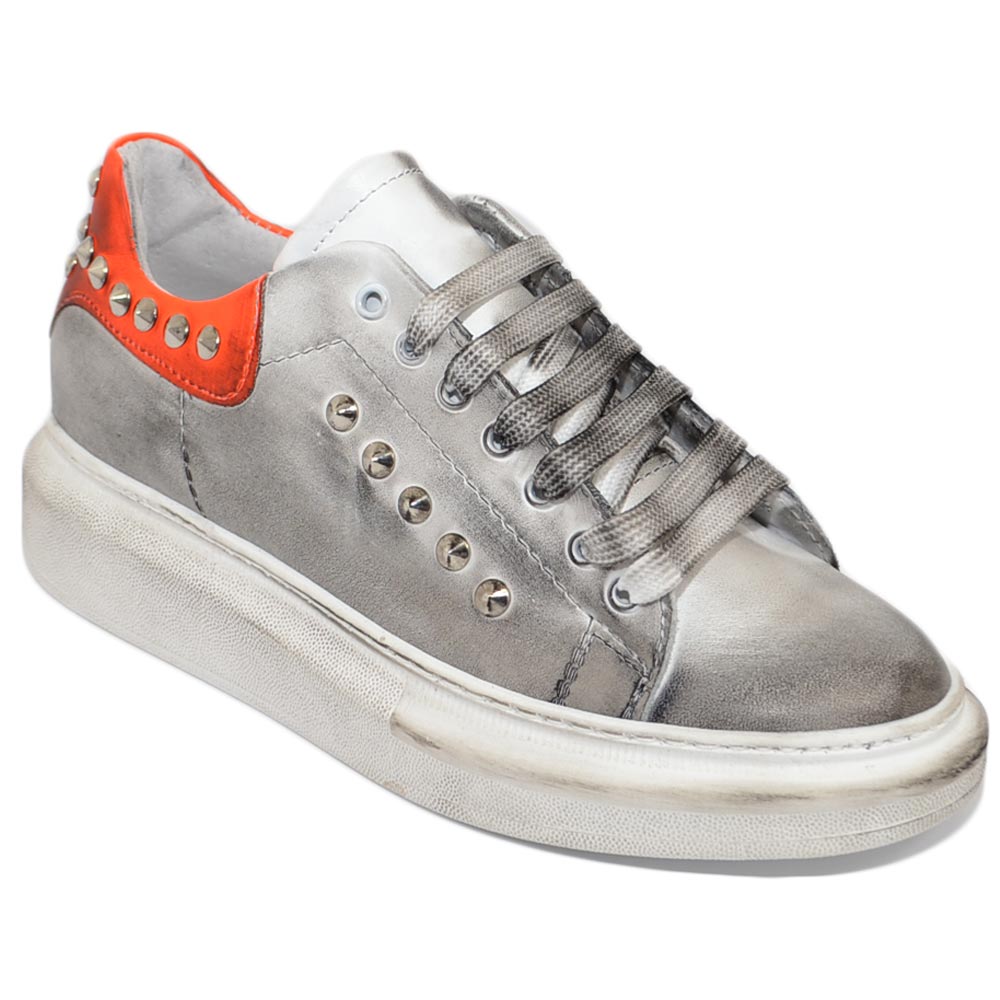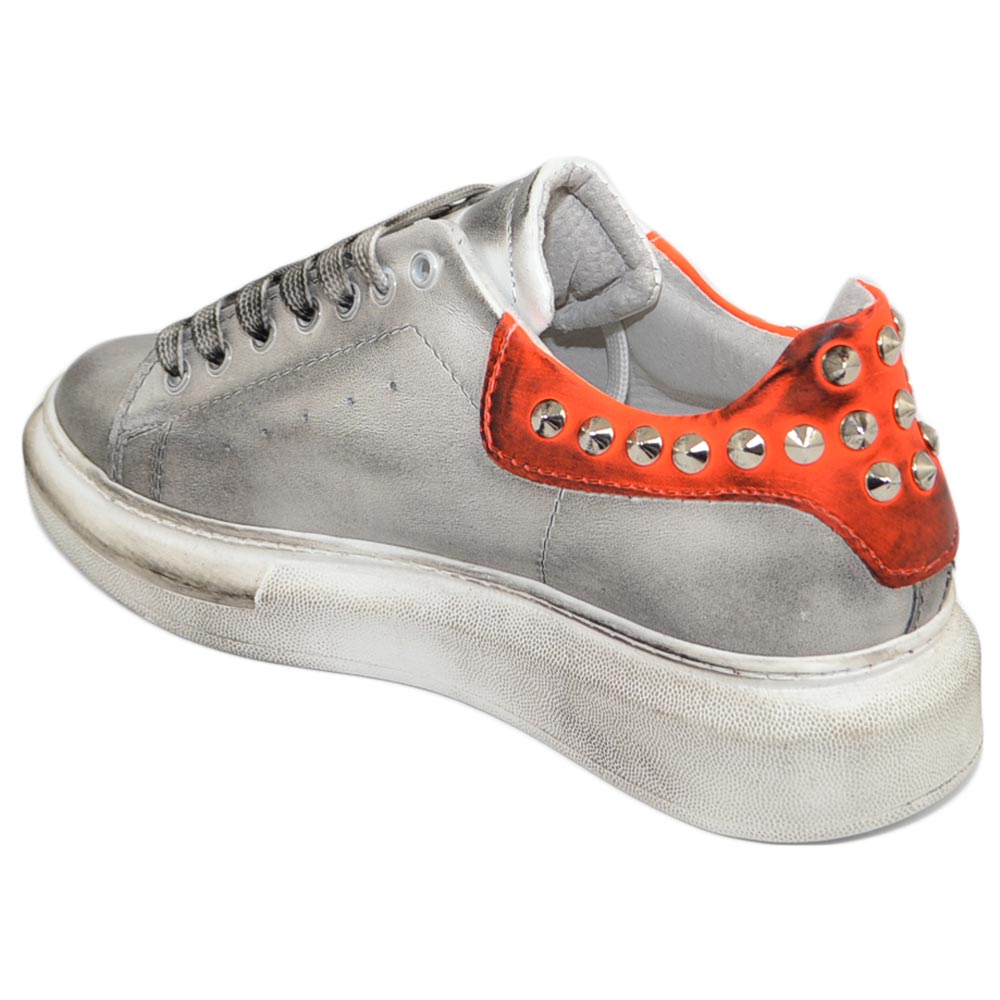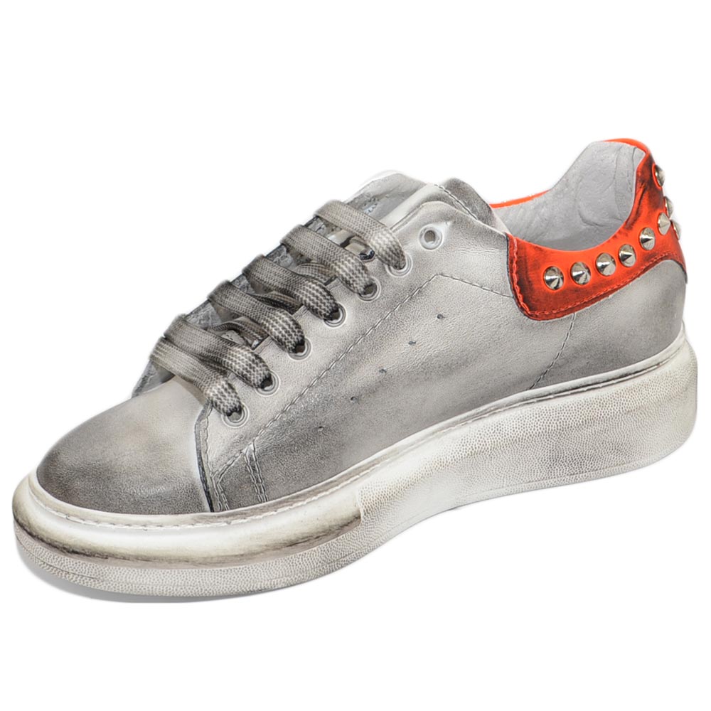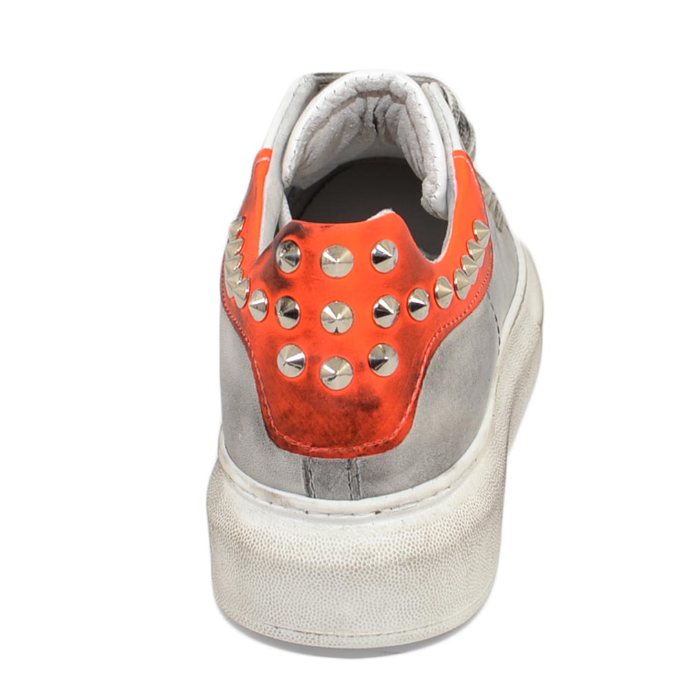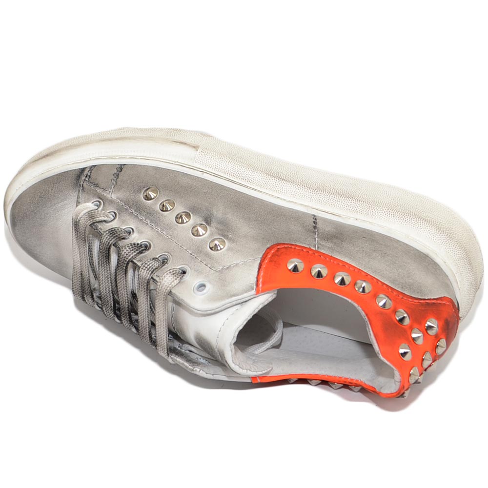 Sneakers uomo bianca in vera pelle effetto sporco borchie retro laterali fortino arancio fondo kevin moda uomo street