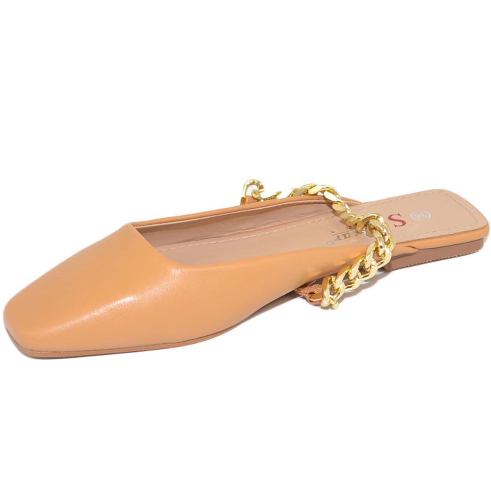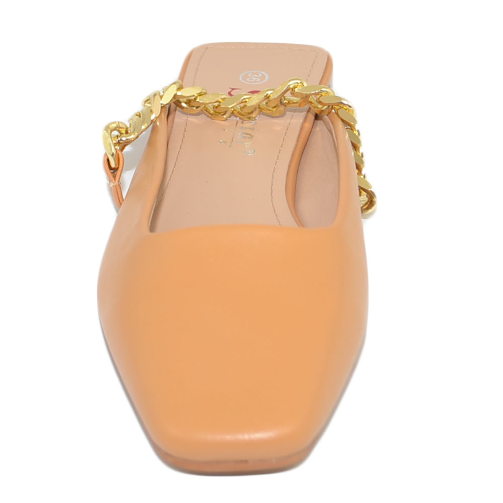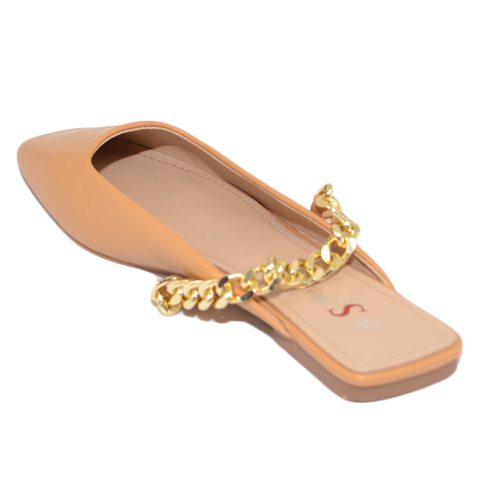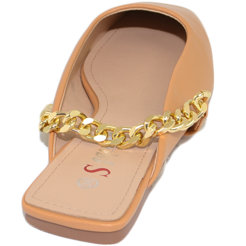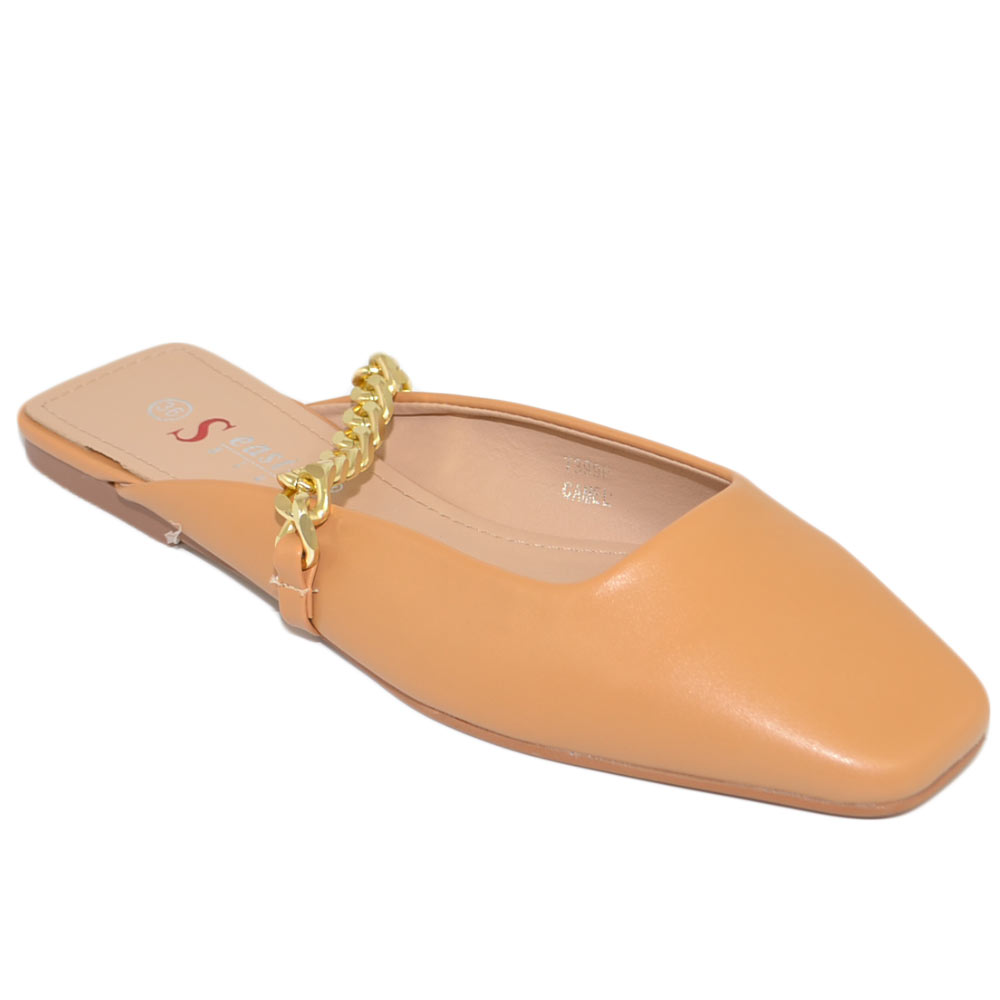 Scarpe donna mules ballerine mocassino cuoio raso terra tallone scoperto con catena oro sul dorso moda luxury