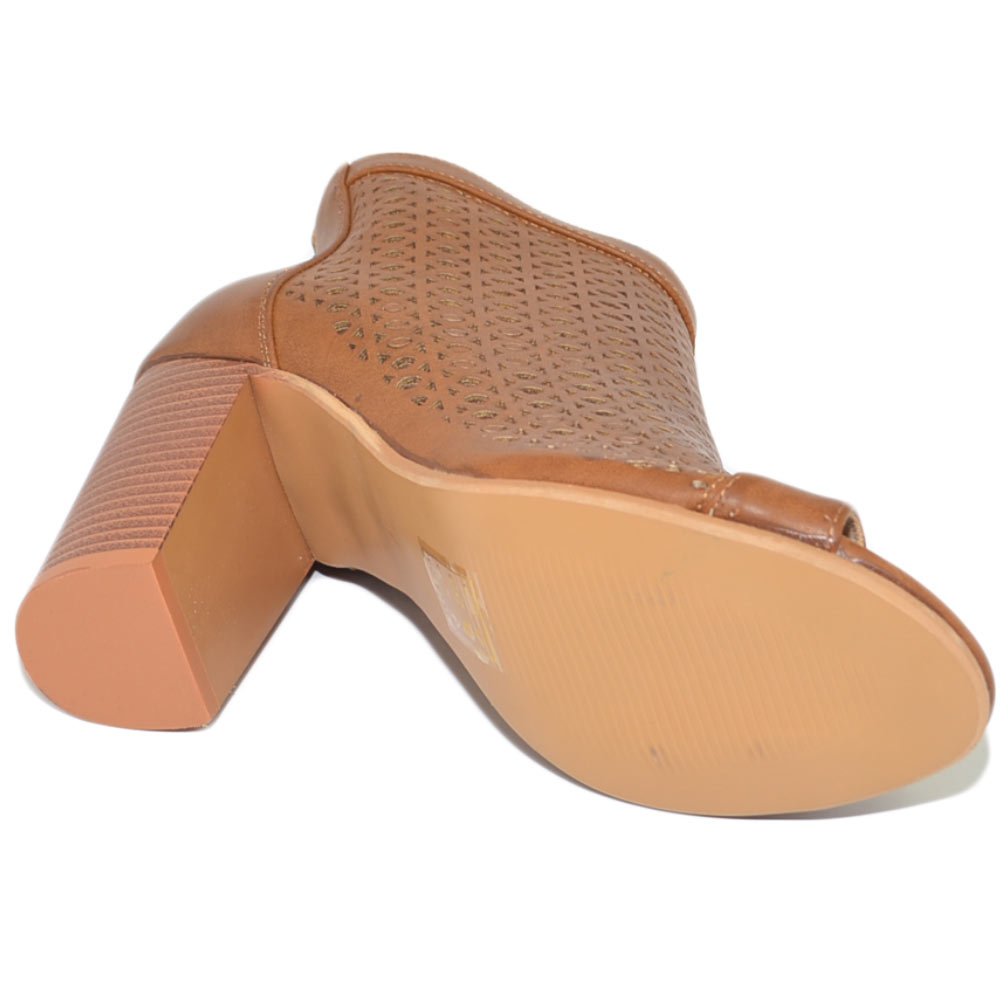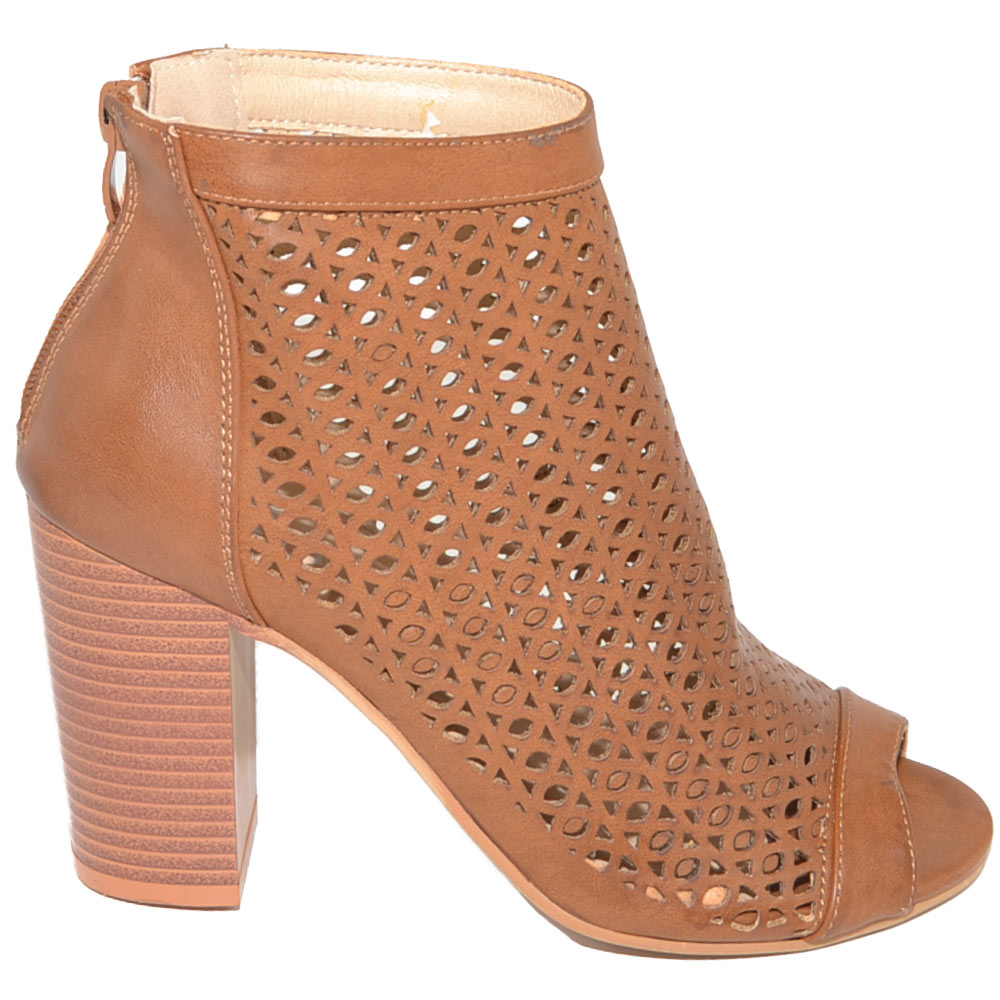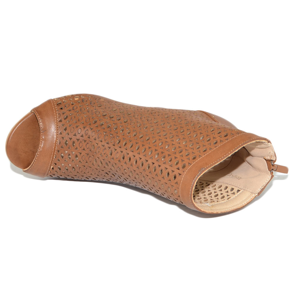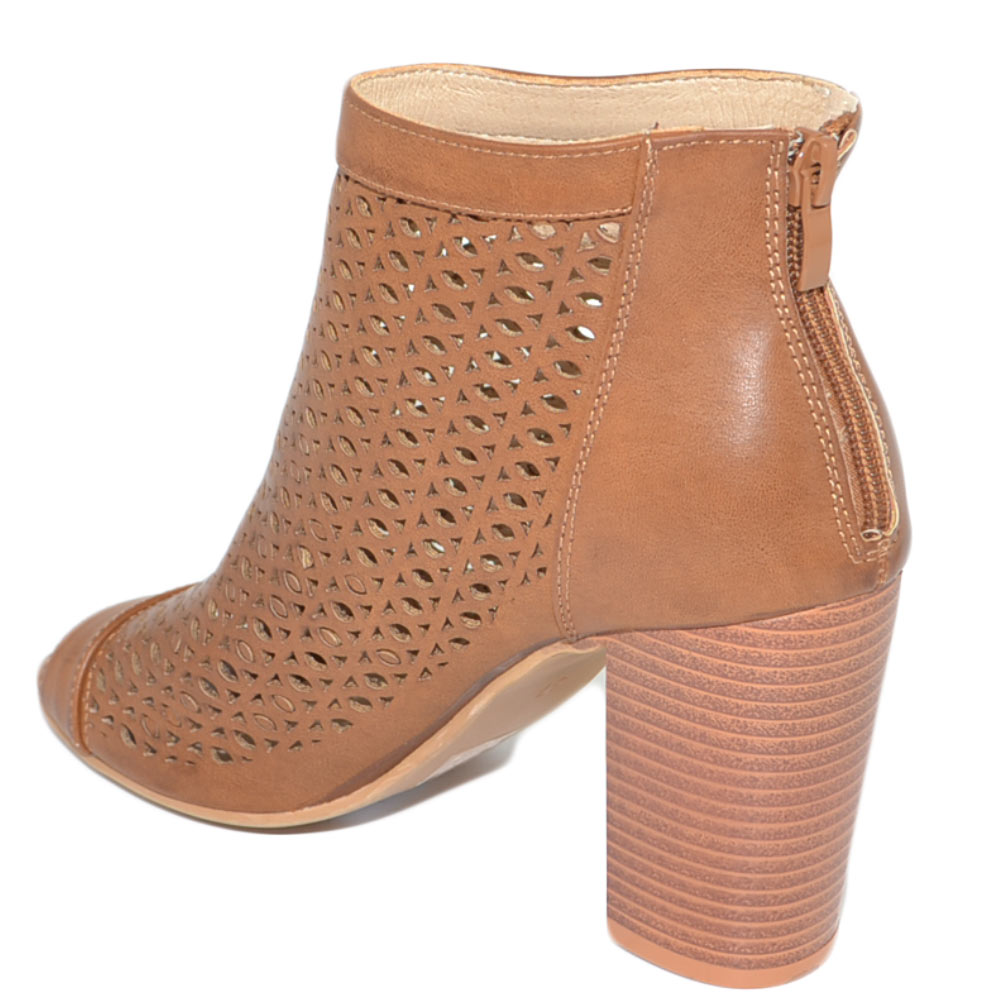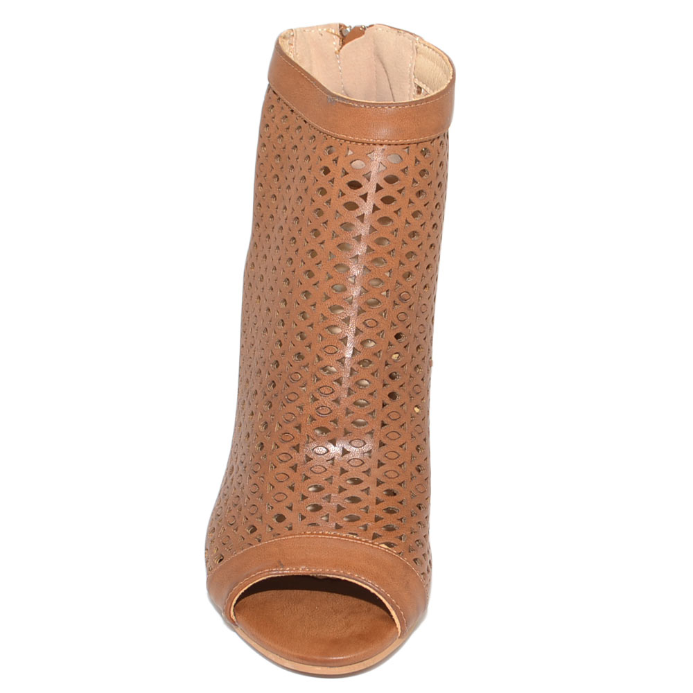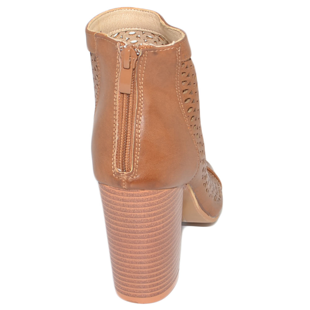Tronchetto donna estivo alla caviglia cuoio con tacco largo comodo traforato spuntato con zip