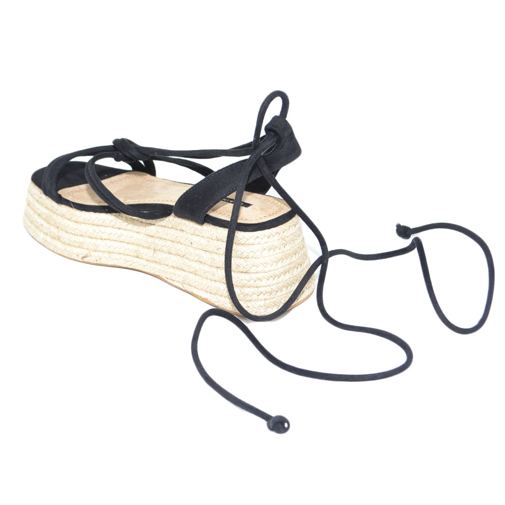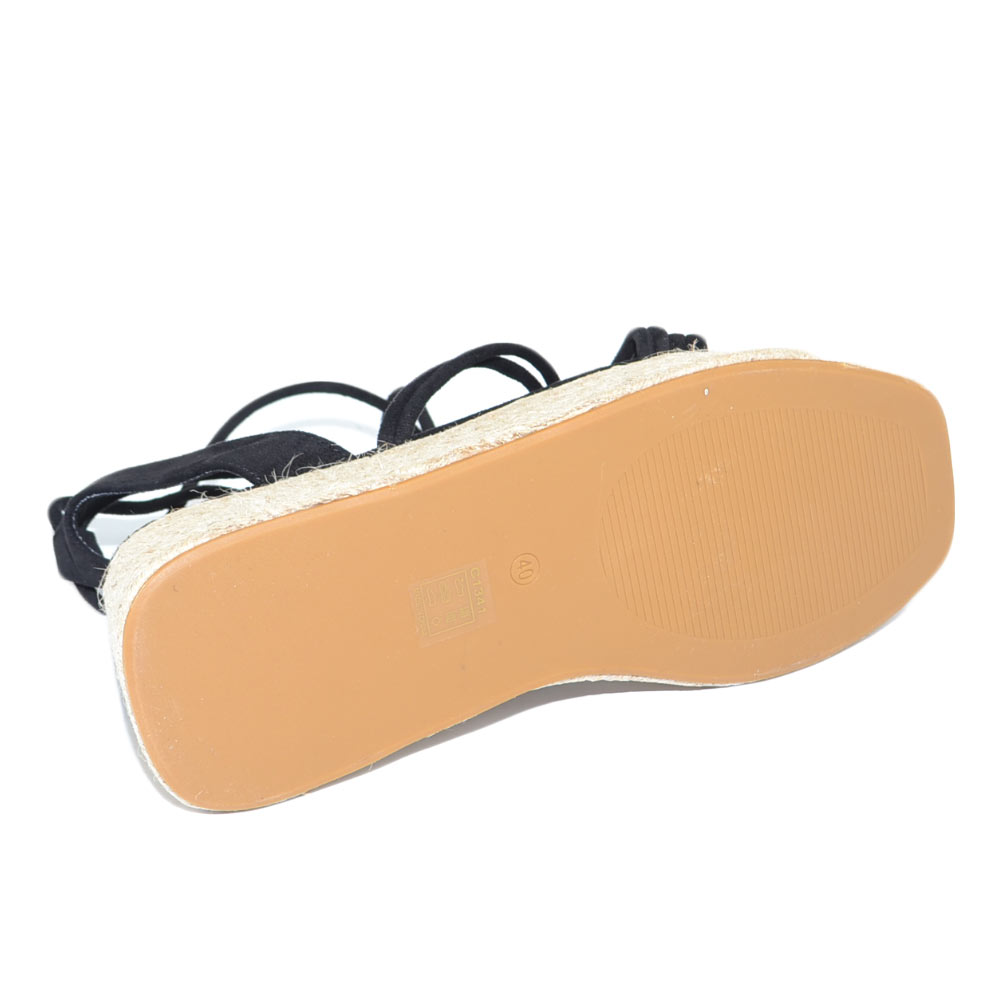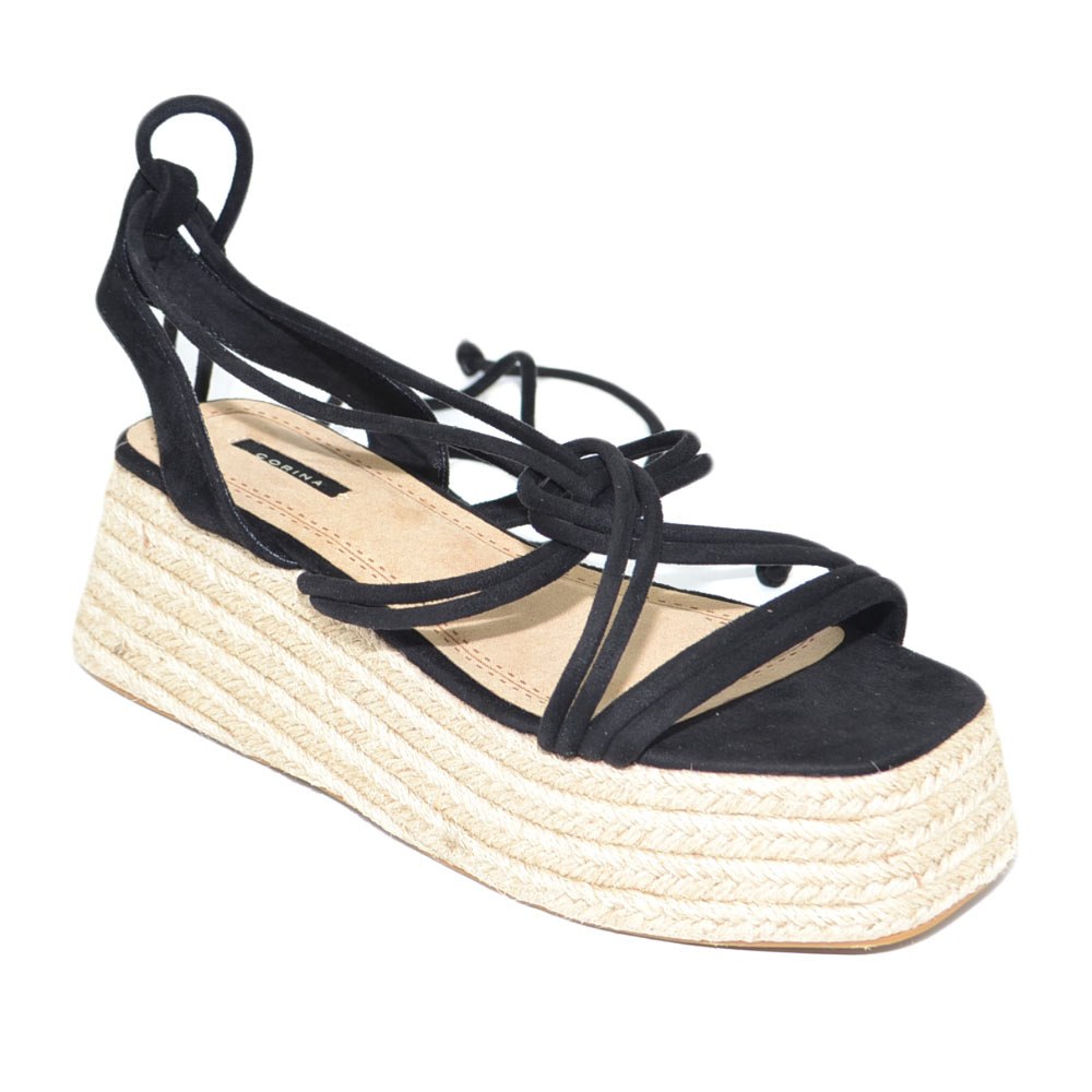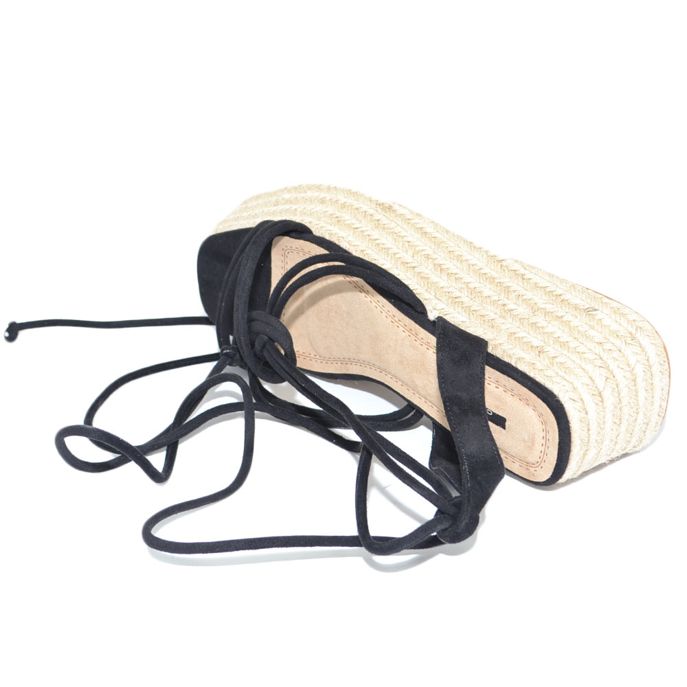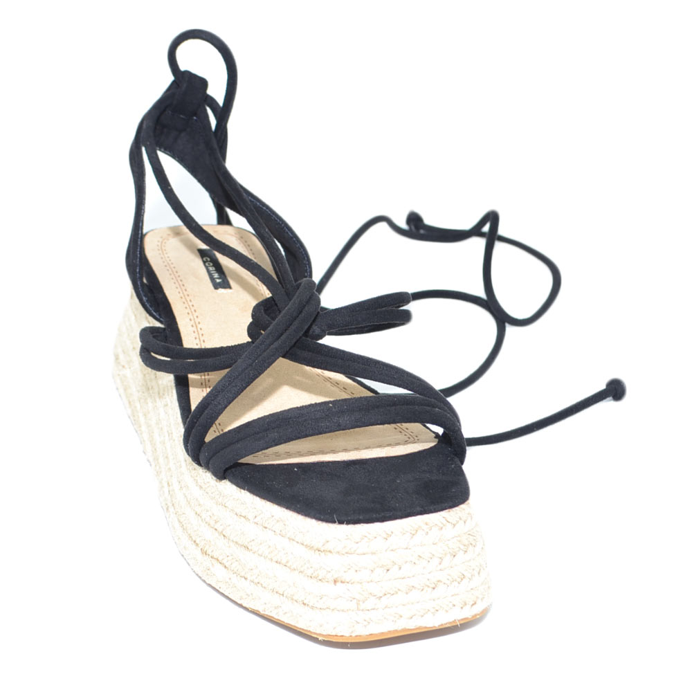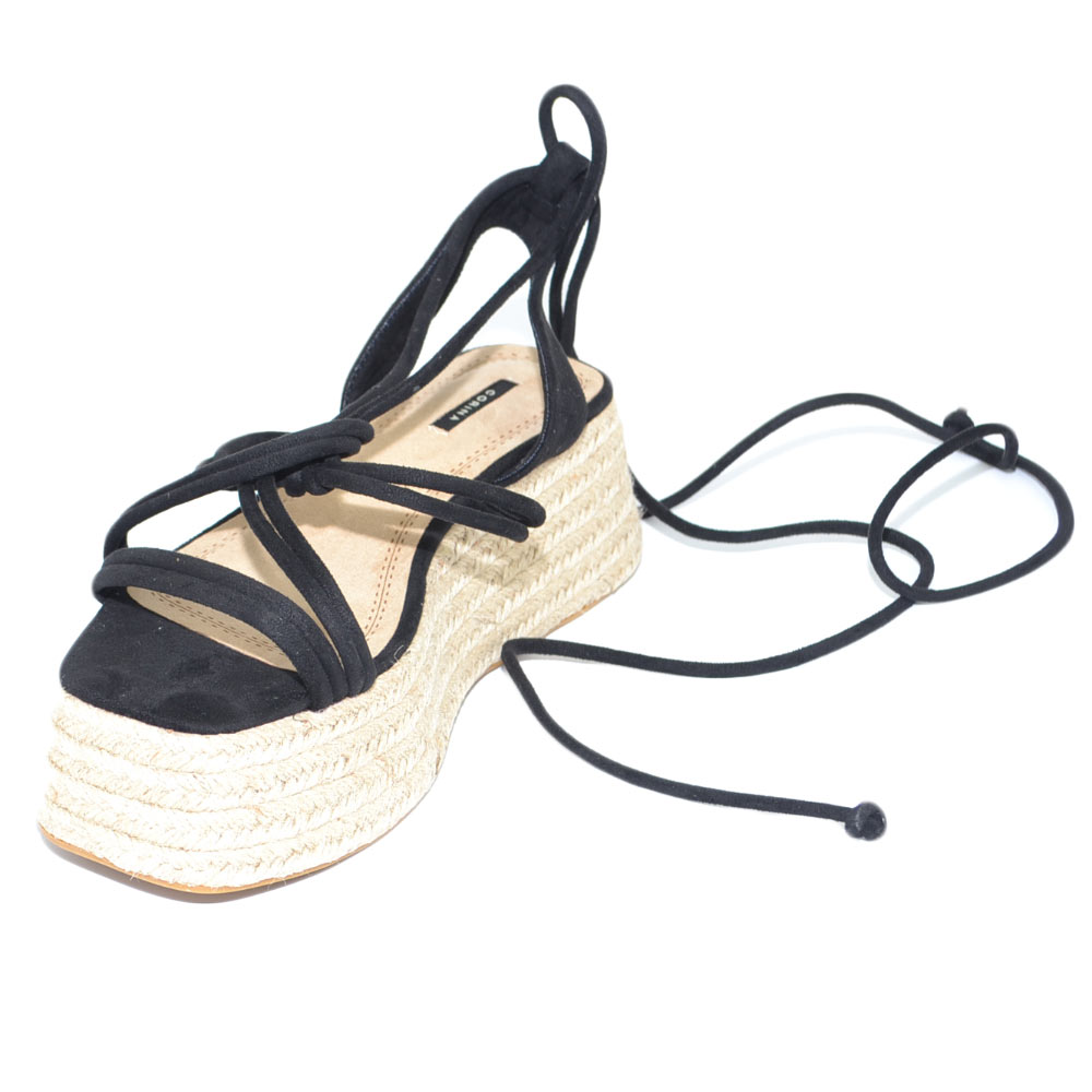 Zeppa donna nera con morbidi lacci intrecciata alla schiava con fondo paglia asimmetrico platform comb moda estate donna