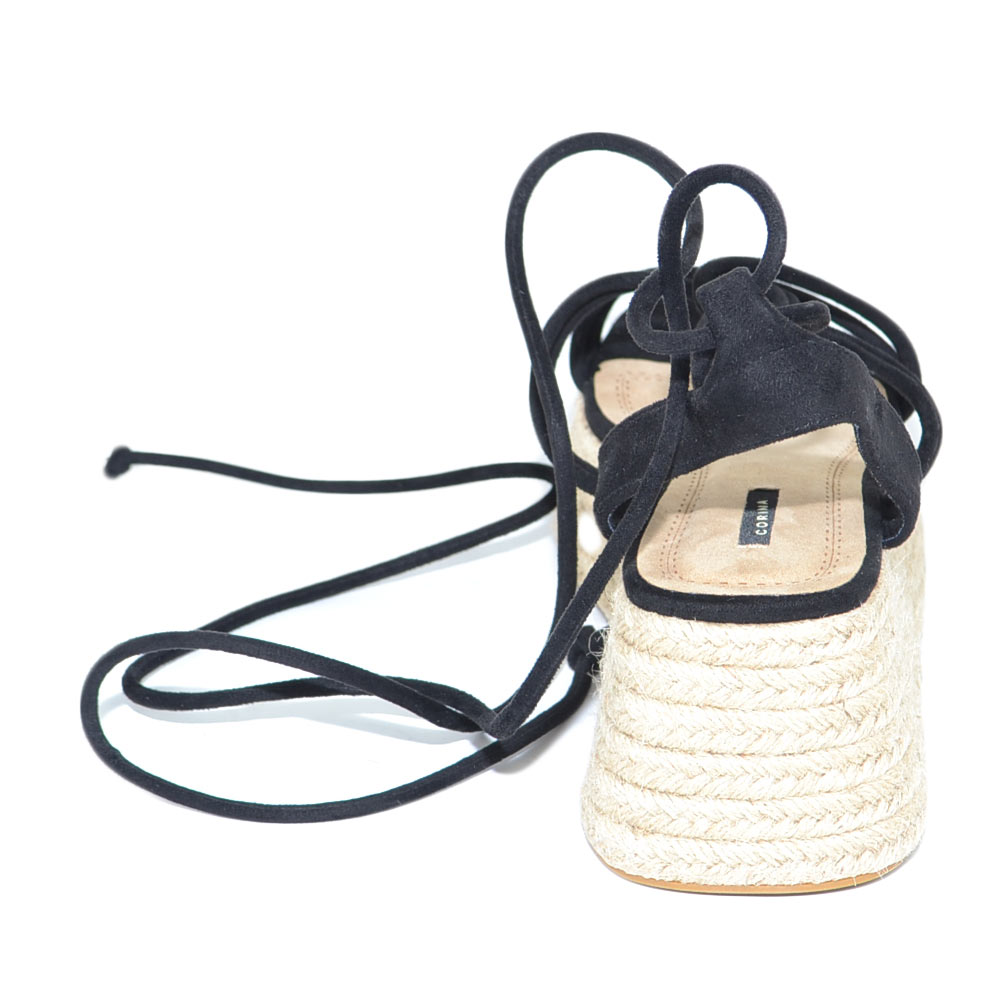 L'interno e il sottopiede sono in comodo tessuto, la suola è in corda alta 5 cm, la chiusura con cinturini regolabile alla caviglia avvolgendo alla schiava. Un sandalo alla moda e confortevole, bello per le estati della donna trendy e femminile.