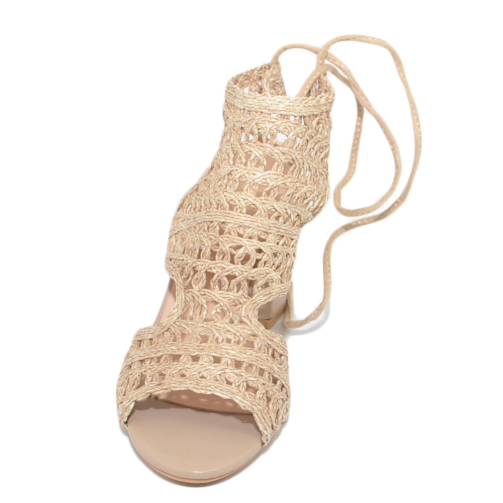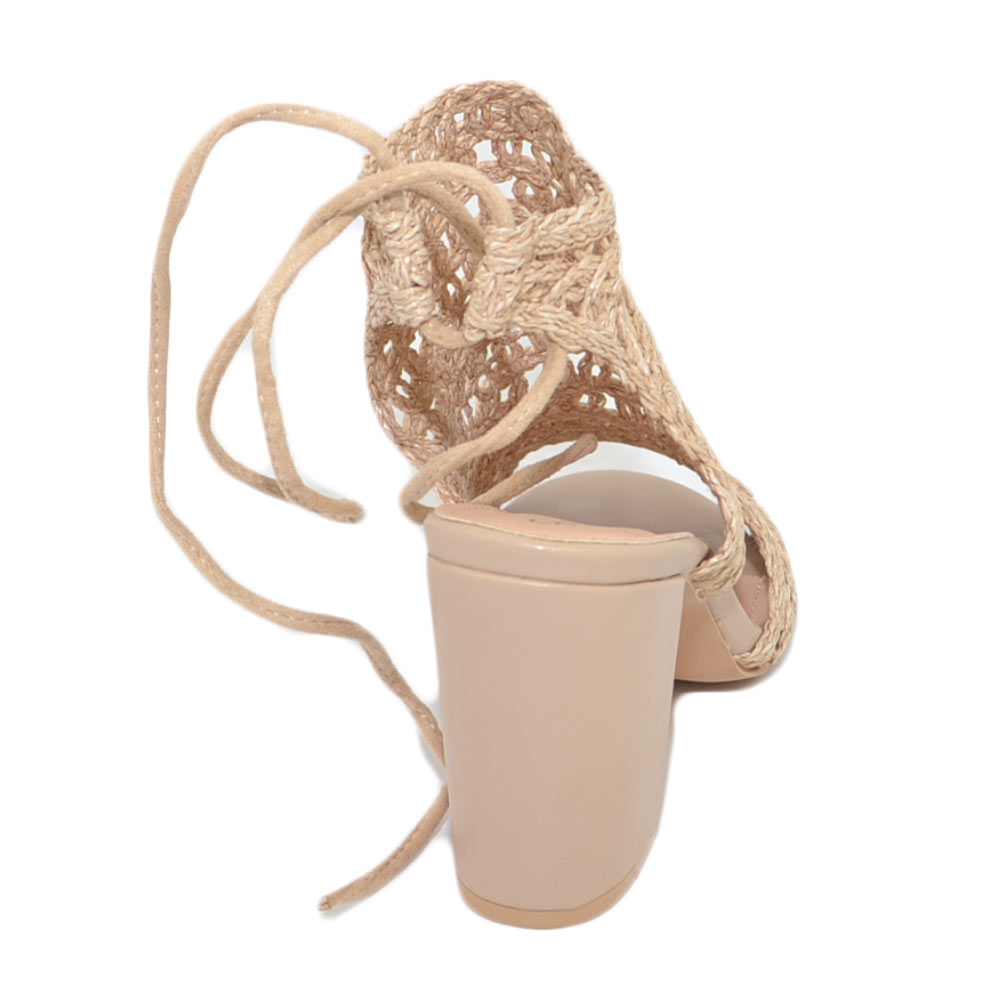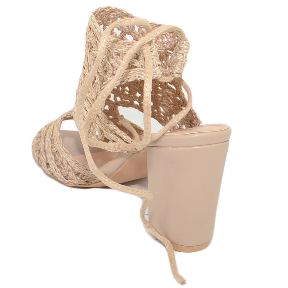 Scarpe donna tronchetto estivo comodo beige tacco largo 5 cm allacciatura retro forato uncinetto lacci spuntato