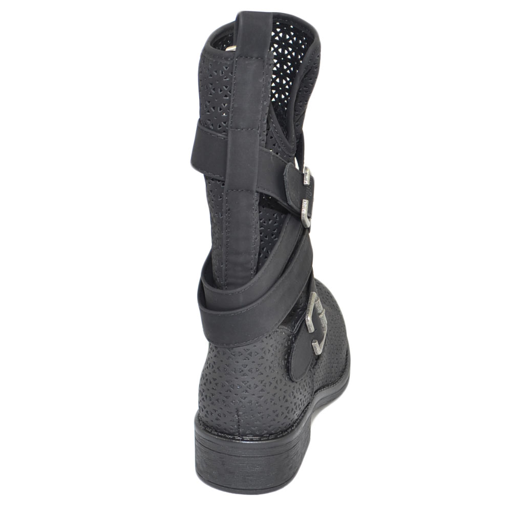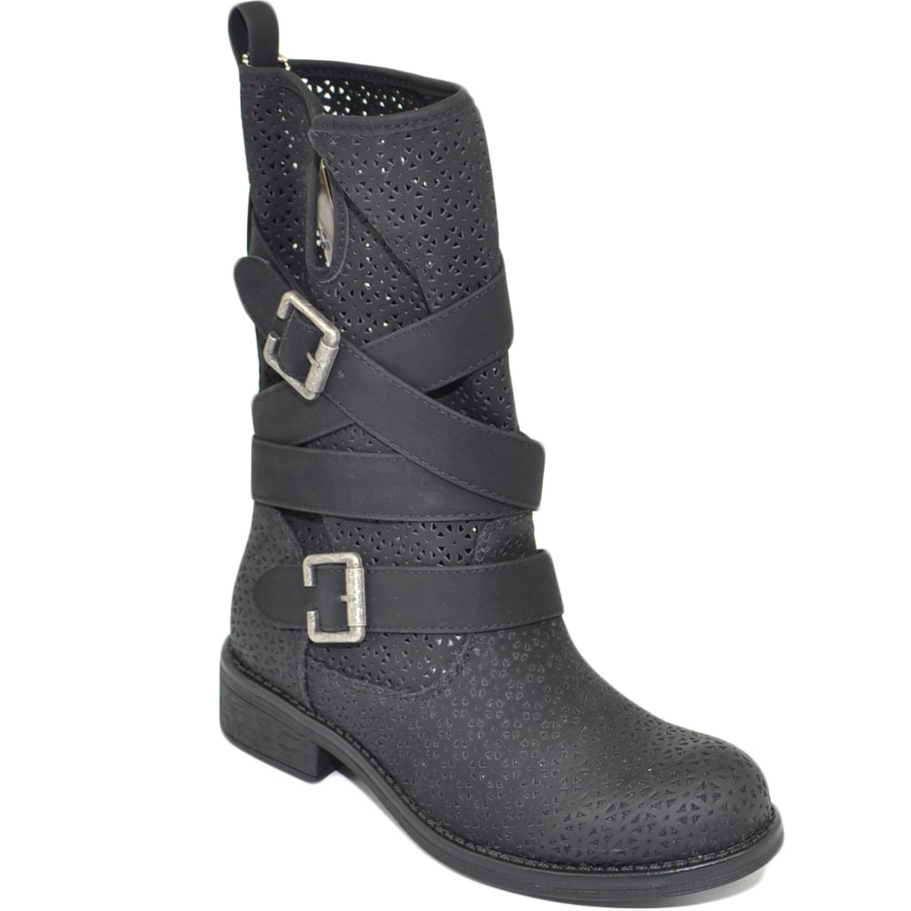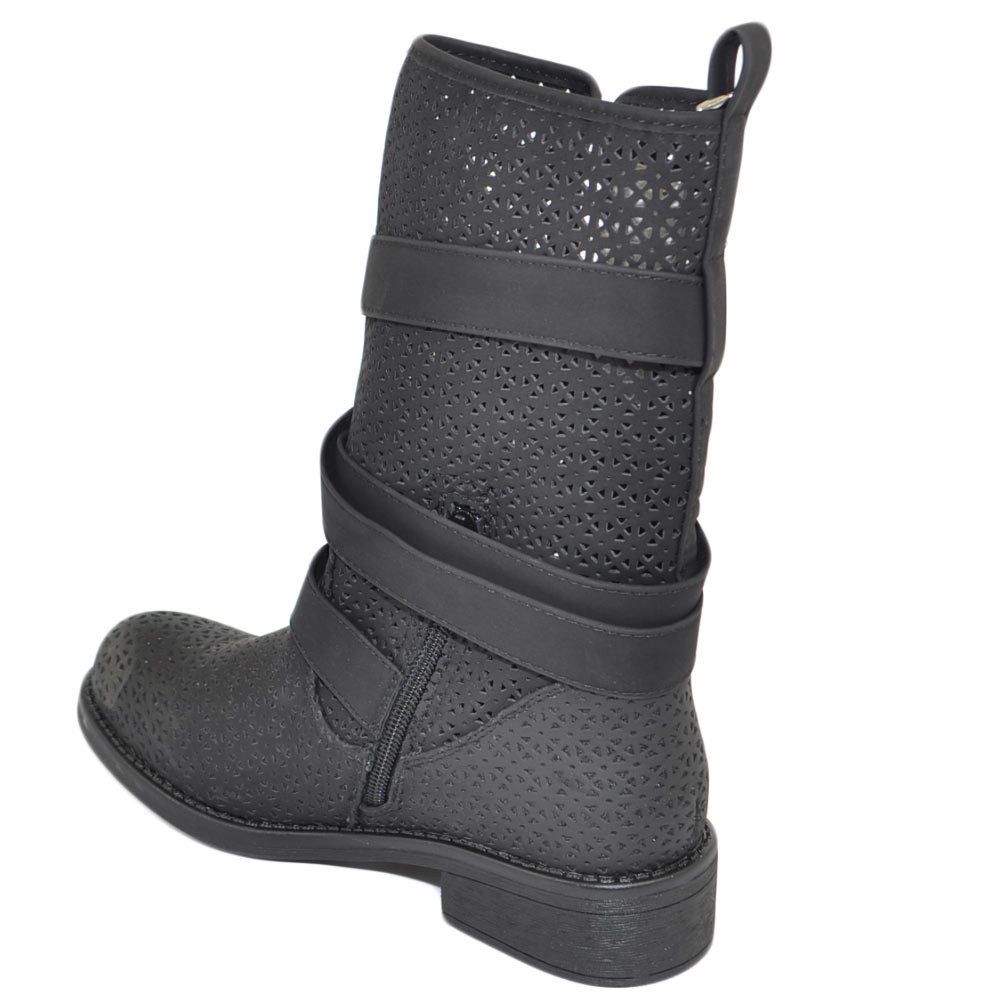 Stivali donna biker estivi nero gambale forato altezza meta' polpaccio comodo con zip e doppia fibbia casual moda fresco