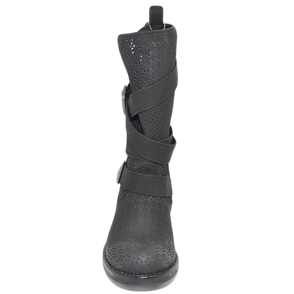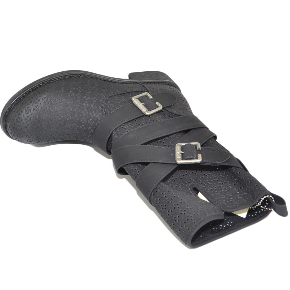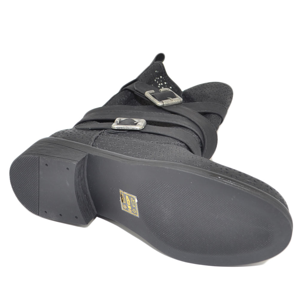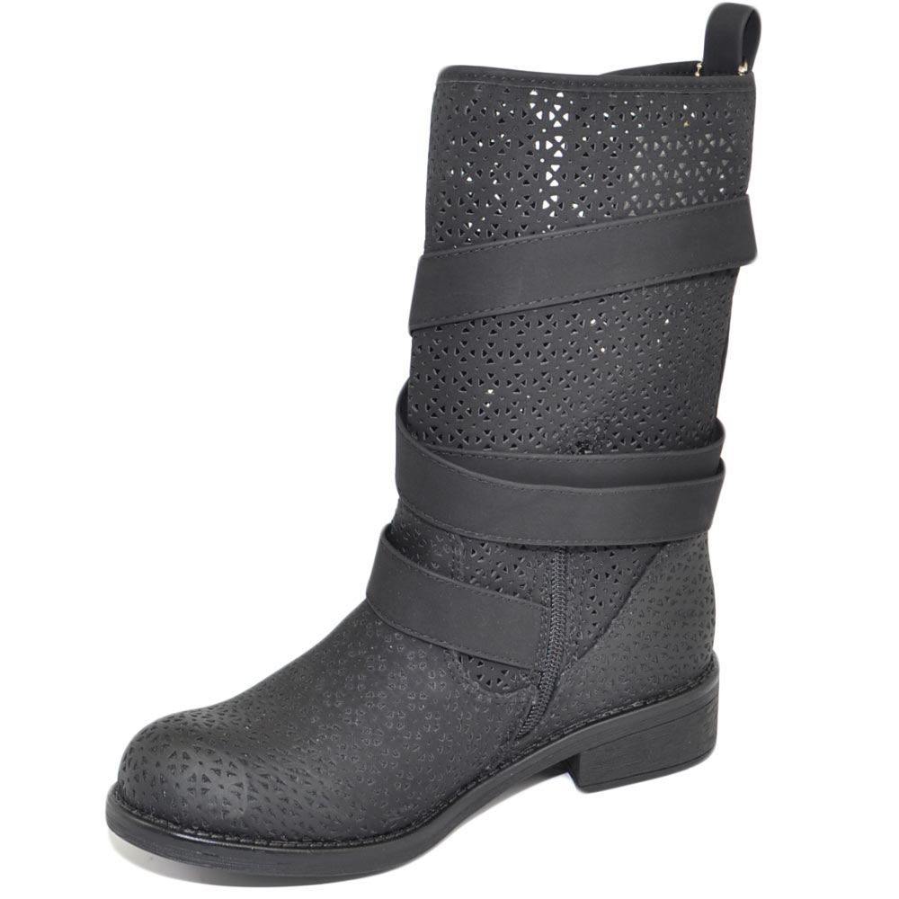 Stivali donna biker estivi nero gambale forato altezza meta' polpaccio comodo con zip e doppia fibbia casual moda fresco