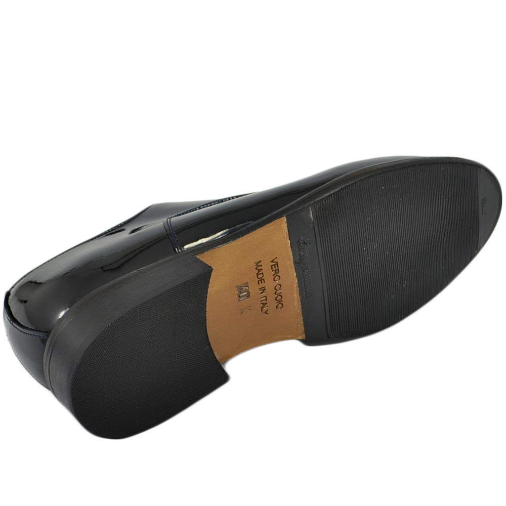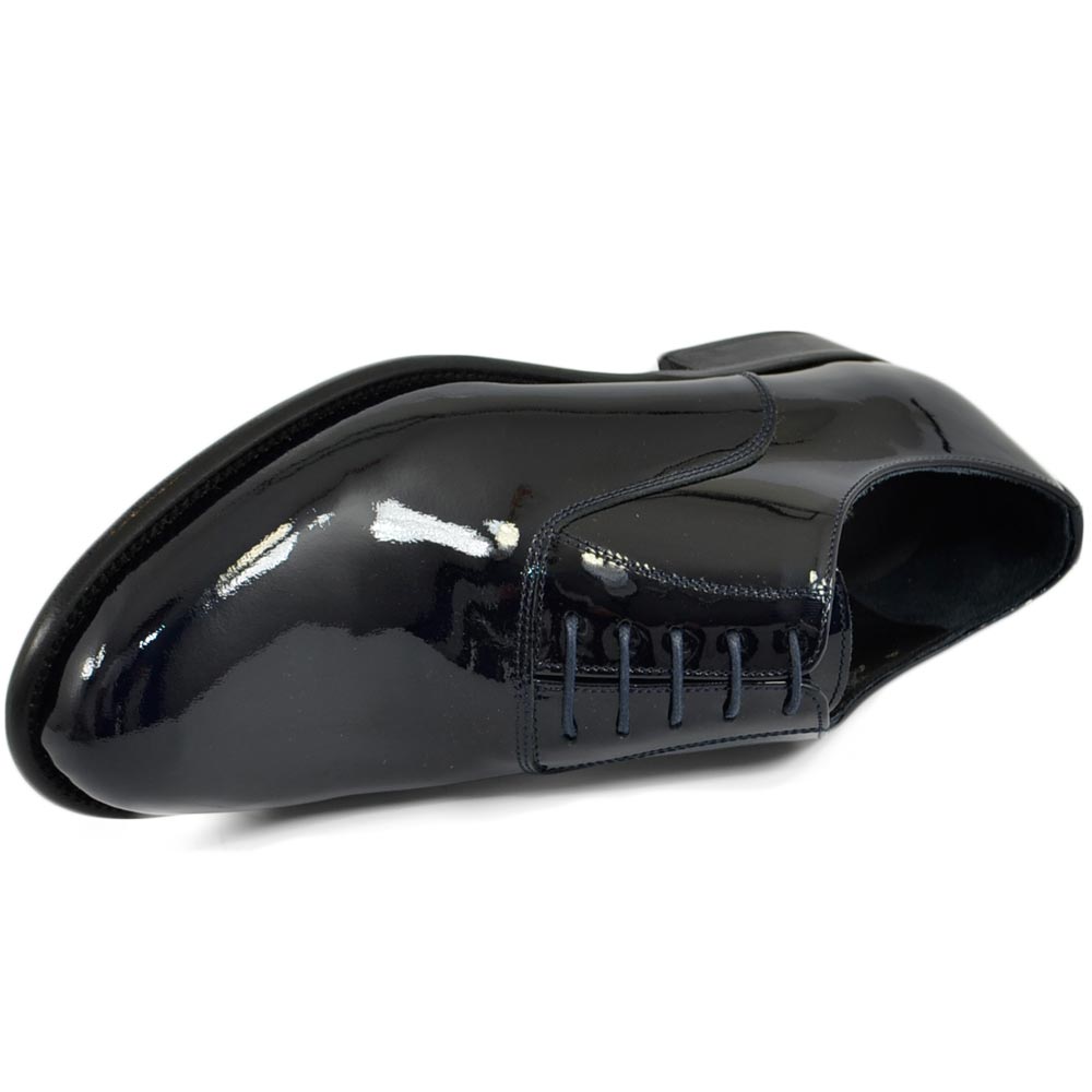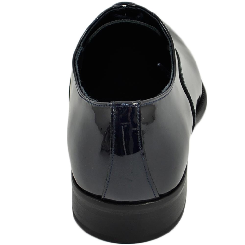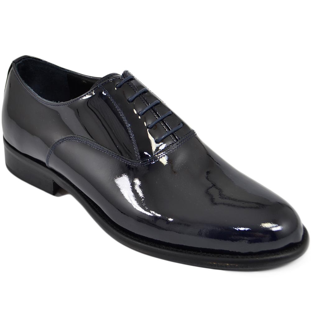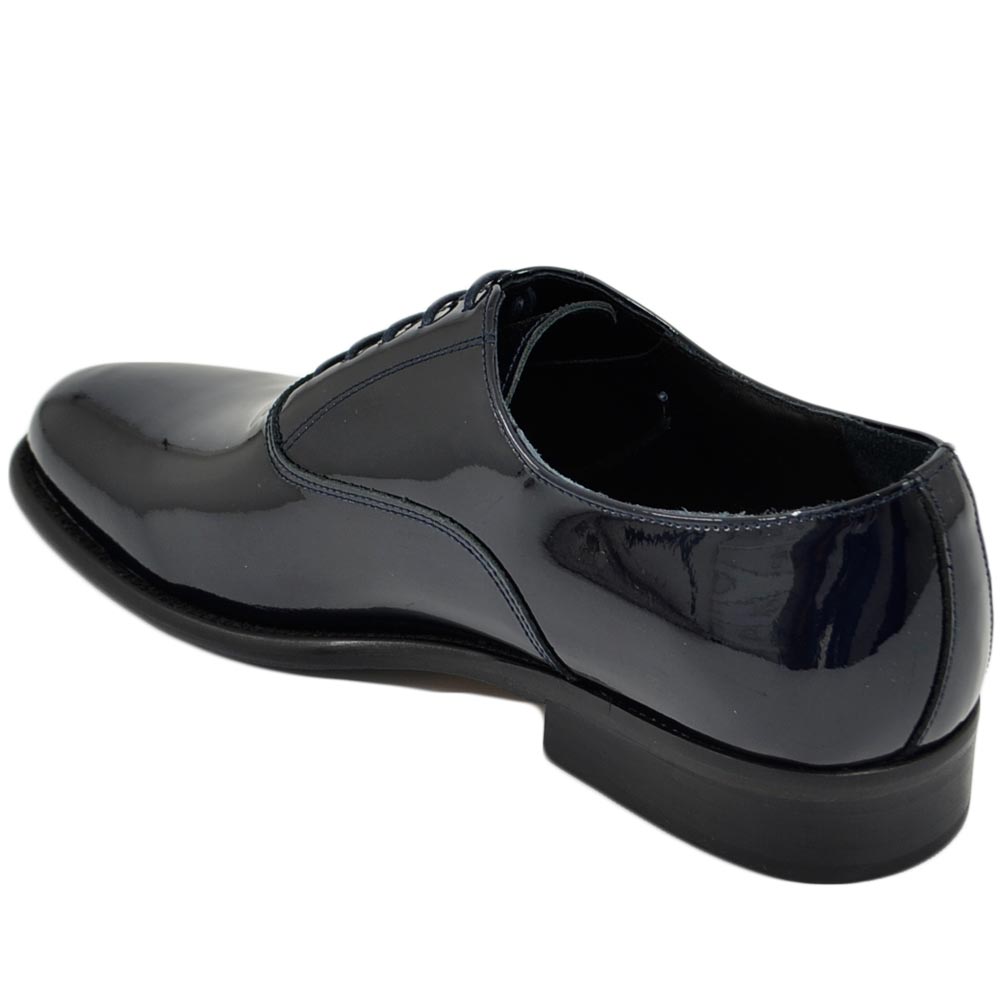 La scarpa da uomo con tomaia interamente in vera pelle vernice blu scuro tinta unita con fodera in pelle e avampiede in cuoio è un modello classico della moda maschile. La stringatura tradizionale e la suola in cuoio resistente ed elegante con tacco basso restituiscono una calzatura ideale per il quotidiano ed estremamente confortevole. Una stringata francese di qualità per l'uomo che ama vestire con classe nel tempo libero e a lavoro.