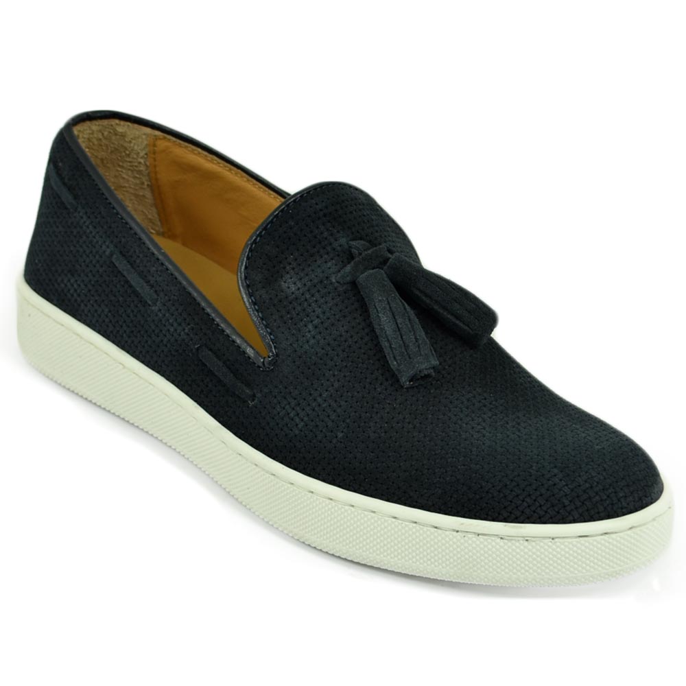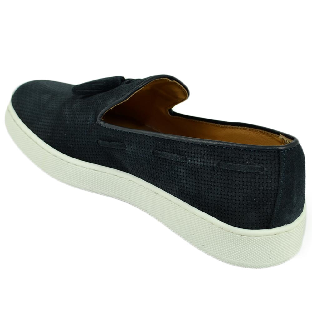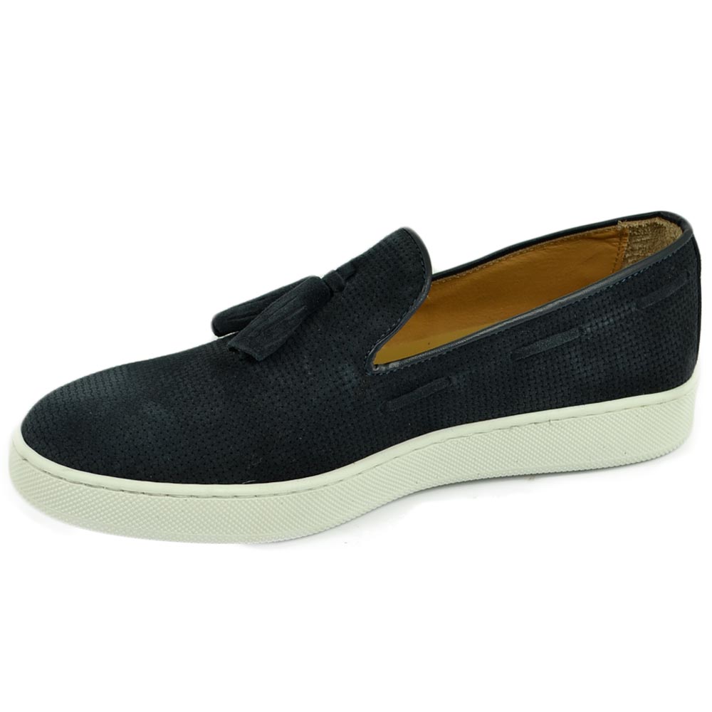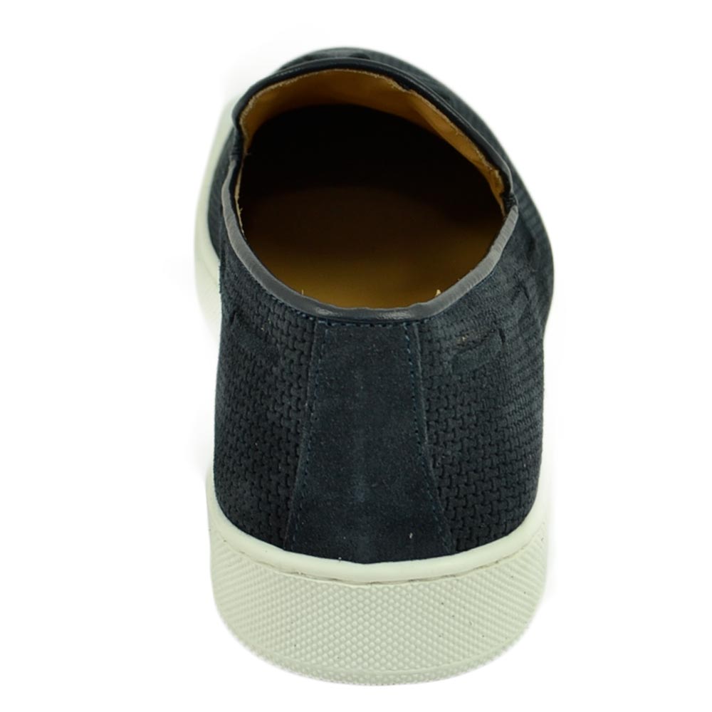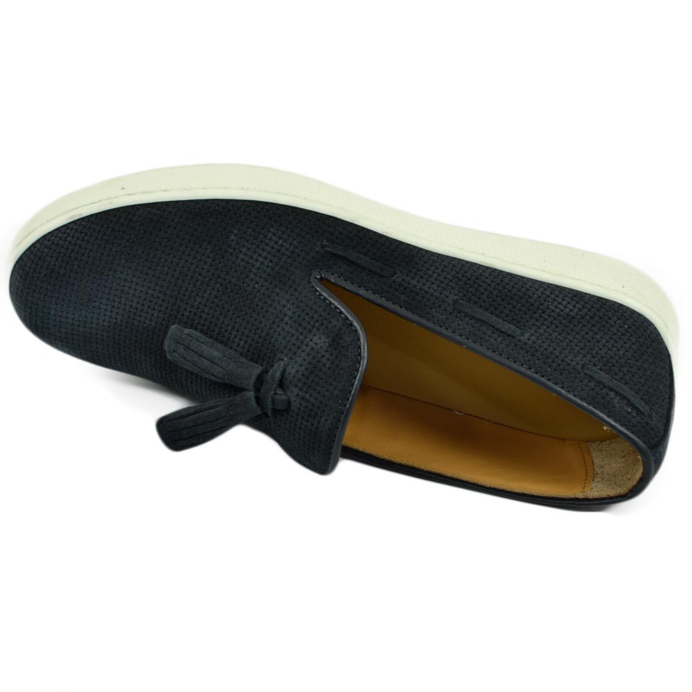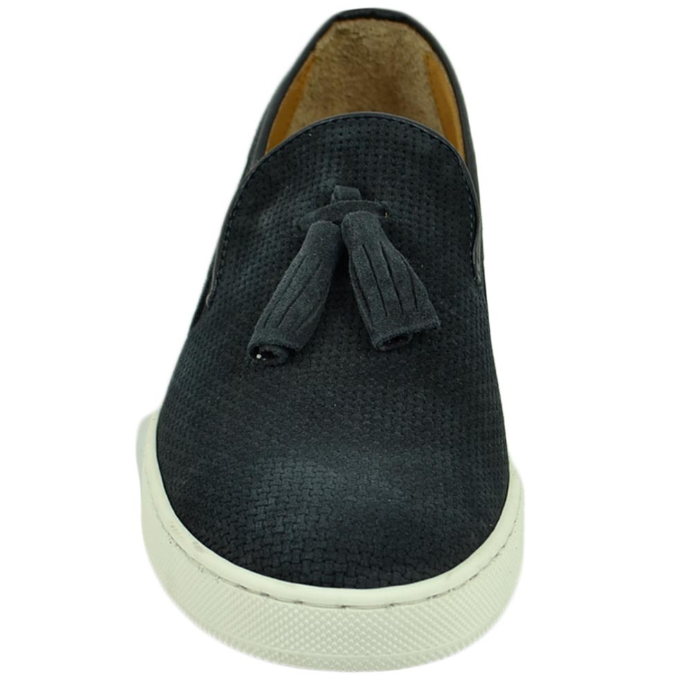 Mocassini uomo slip on classico sportivo in vera pellecamoscio intrecciato blu cuciture bon bon fondo bianco alto
