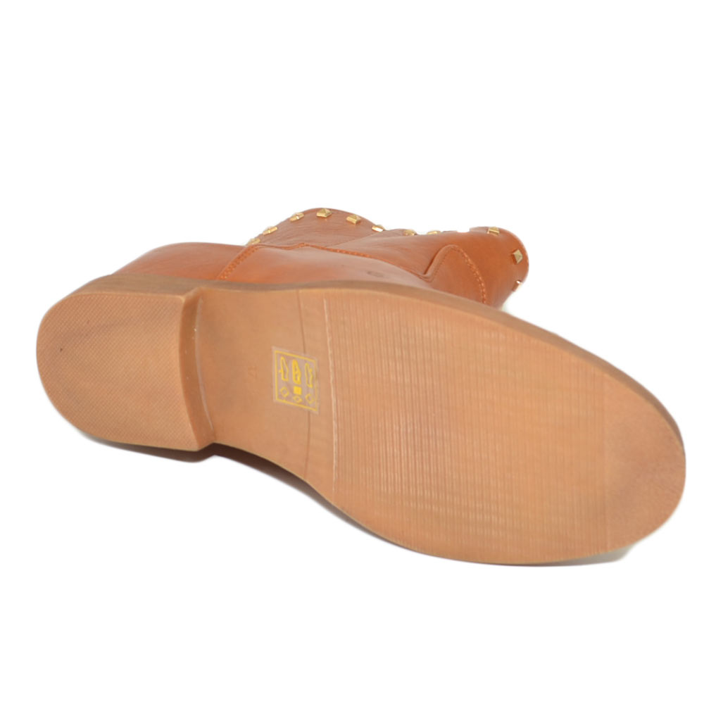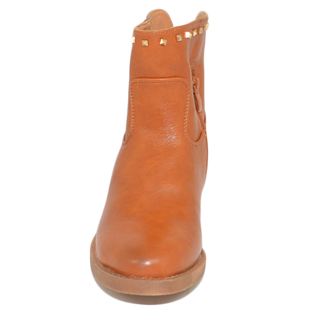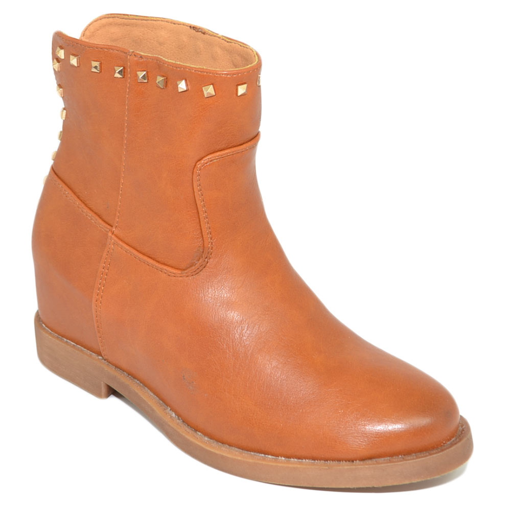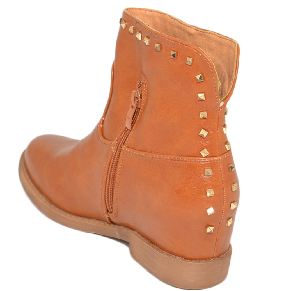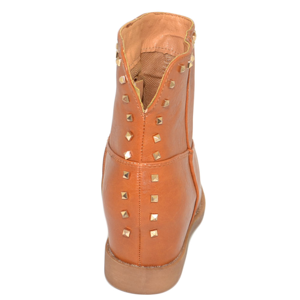 Stivaletto donna cuoio zeppa para interna modello biker punta tonda alla caviglia con scollo v zip e borchie comodo