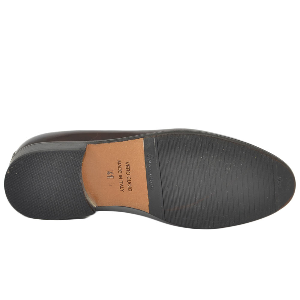 La scarpa da uomo con tomaia in pelle morbida abrasivata foderata in tessuto e pelle è un modello classico della moda maschile. College slip on liscio in pelle con la suola in vero cuoio con tacco basso antiscivolo e isolante restituiscono un design squisitamente elegante perfetto per il business e per l'uomo che ama i completi classici. Un mocassino fine di qualità per una calzata più confortevole adatta all'uomo che ama vestire con classe lo stile italiano.