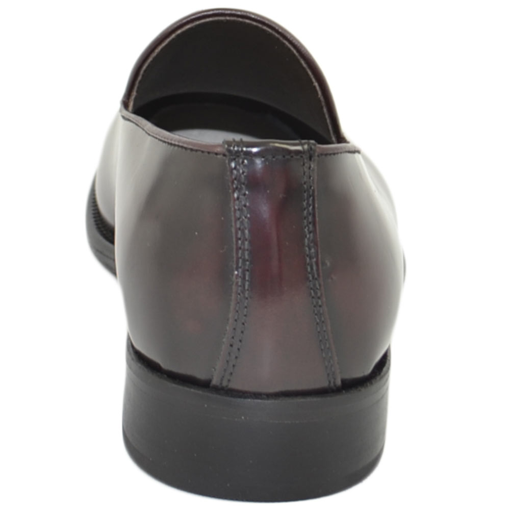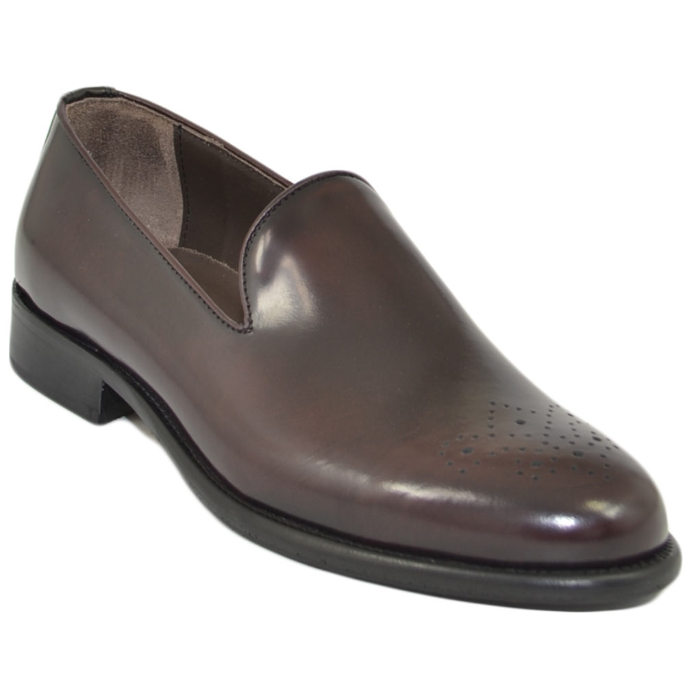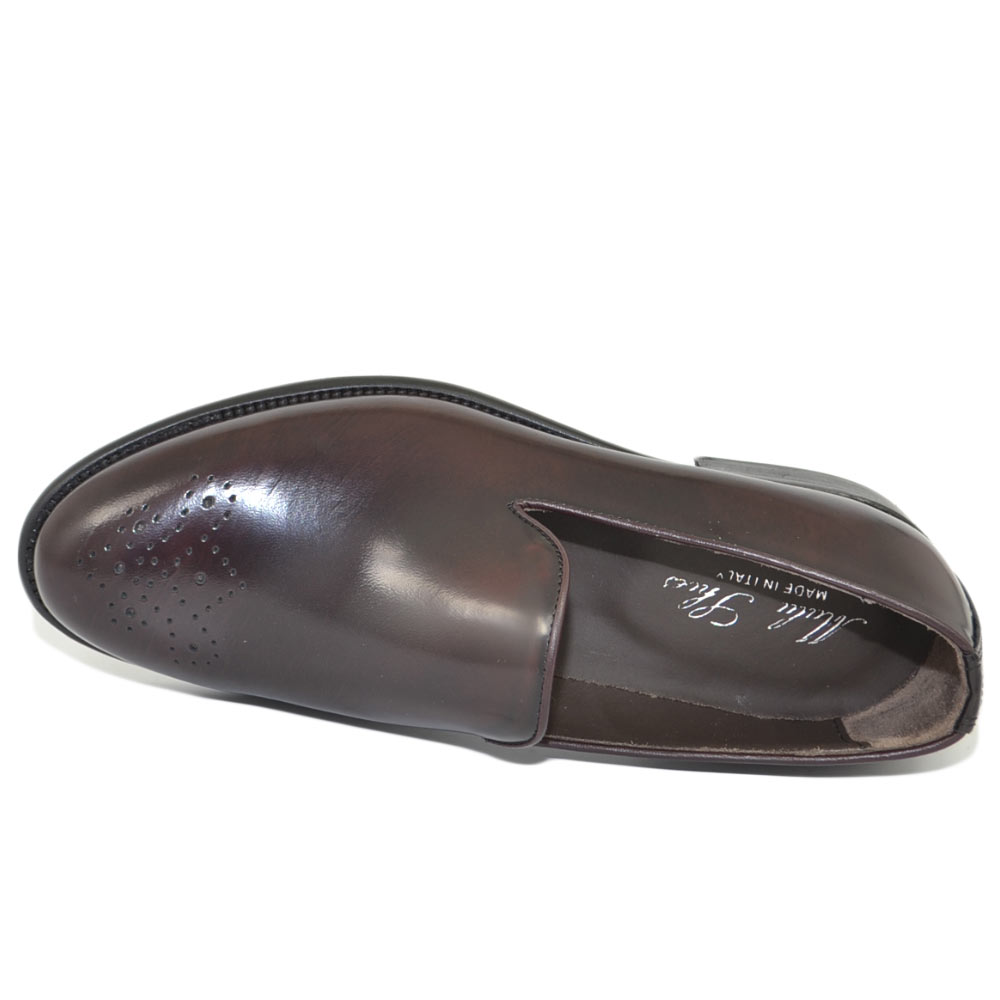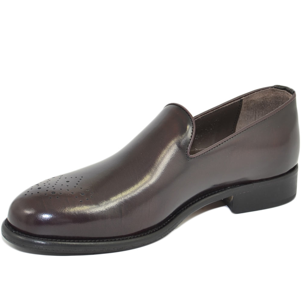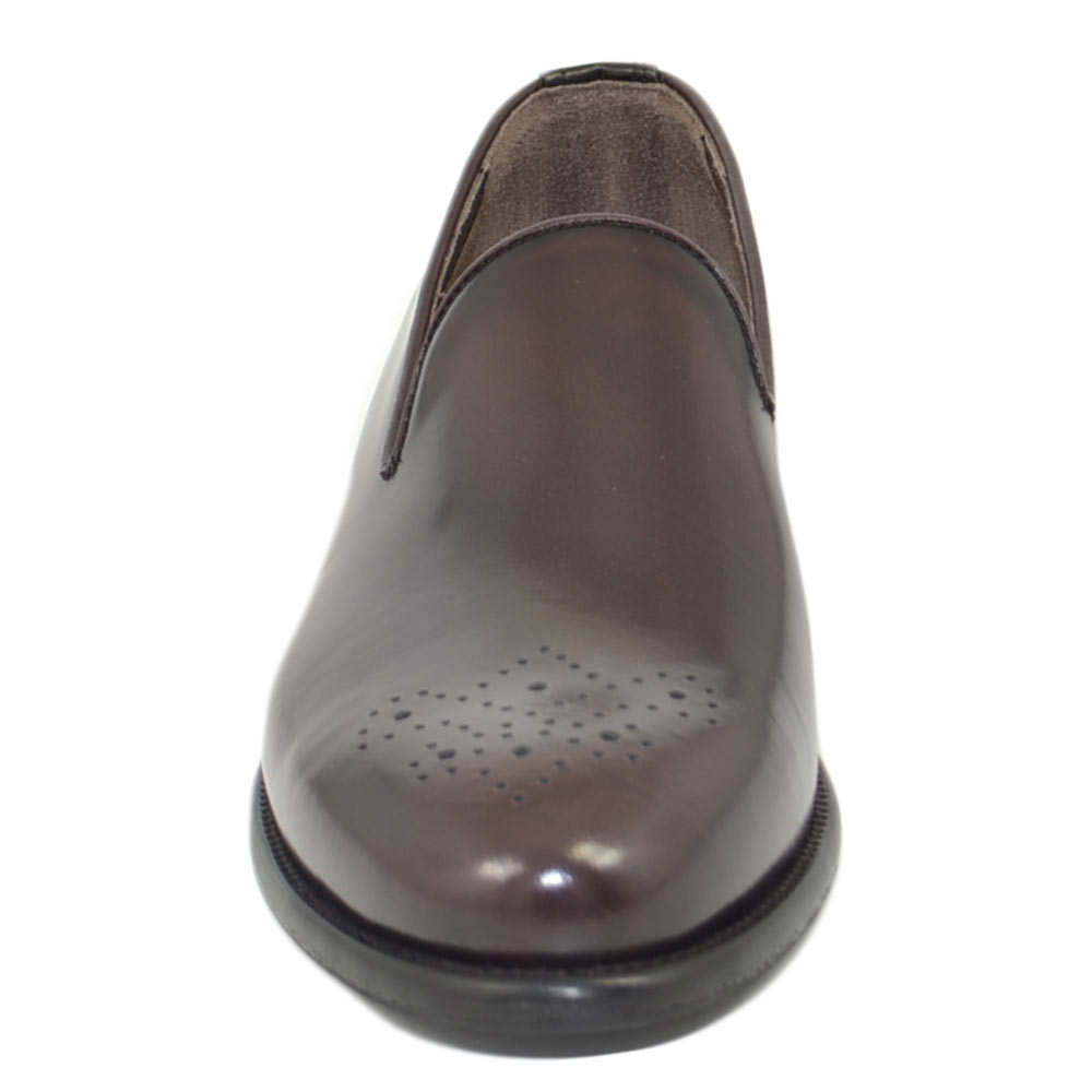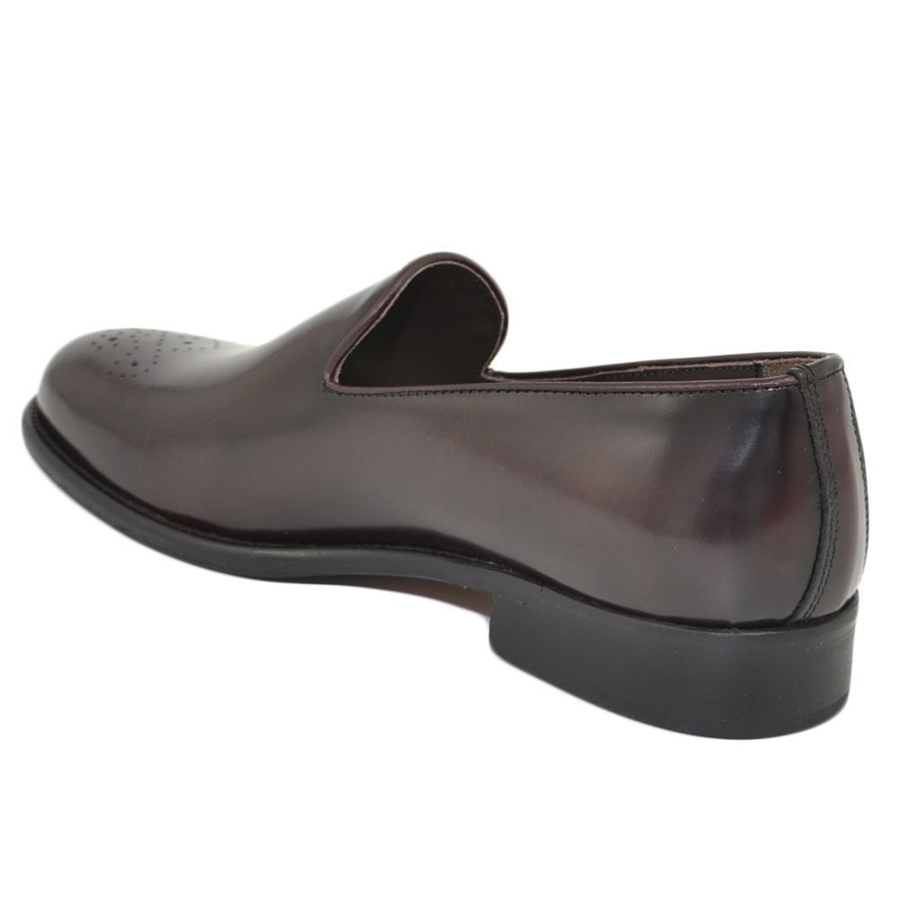 Mocassino uomo liscio classico vera pelle abrasivata bordeaux ricamo punta fondo cuoio artigianale fatti mano in italia