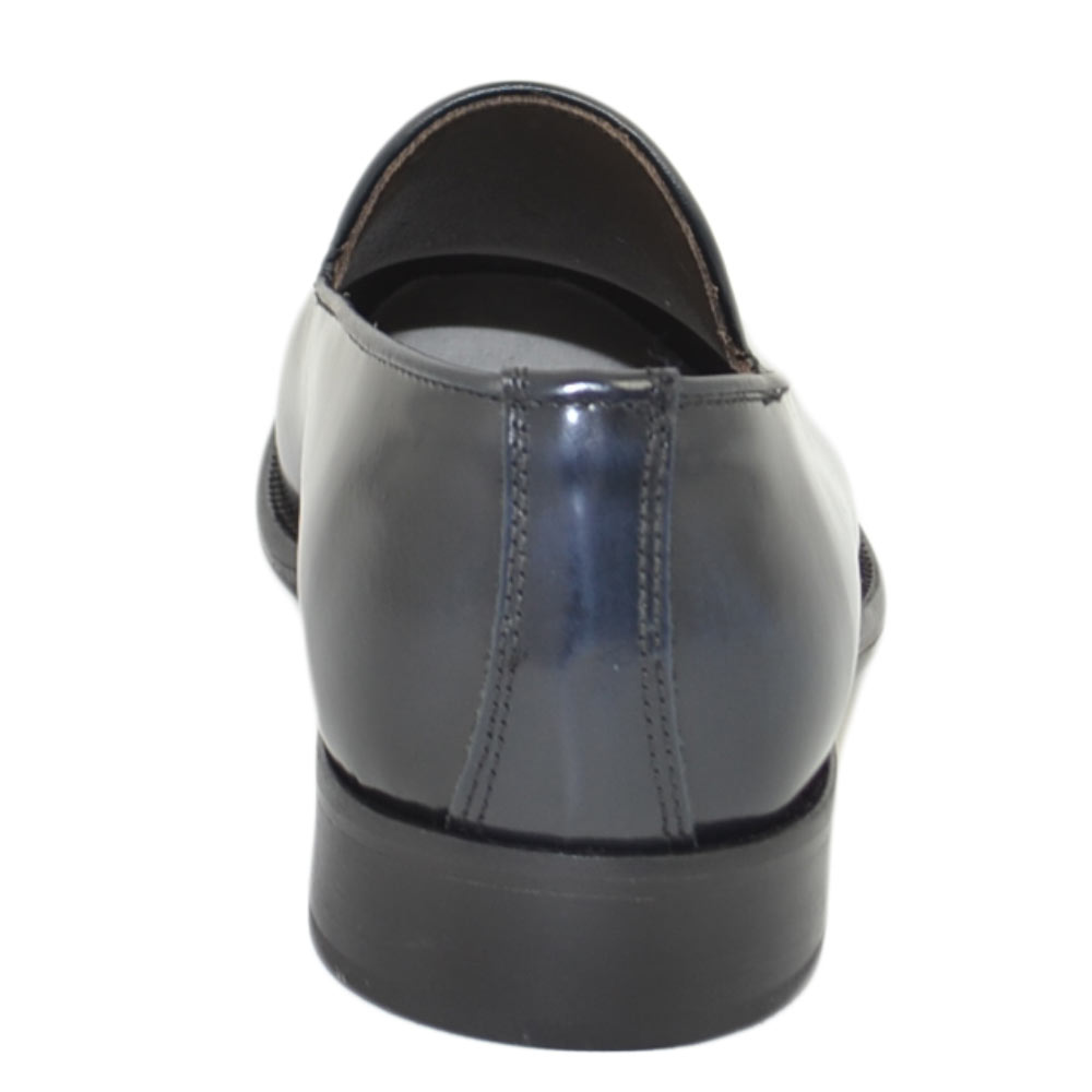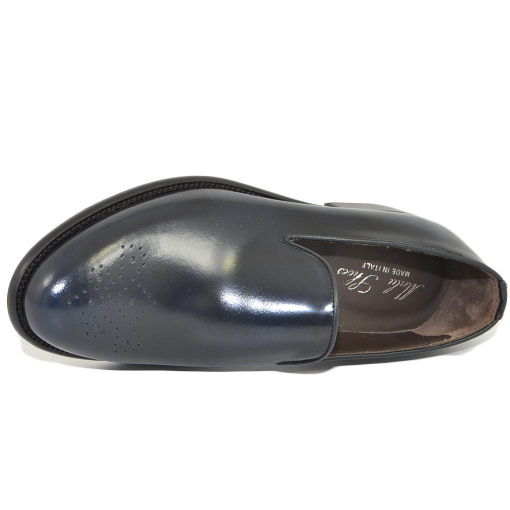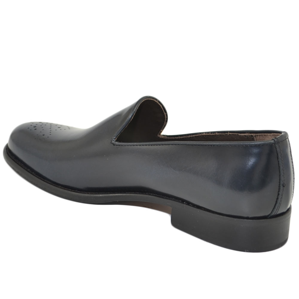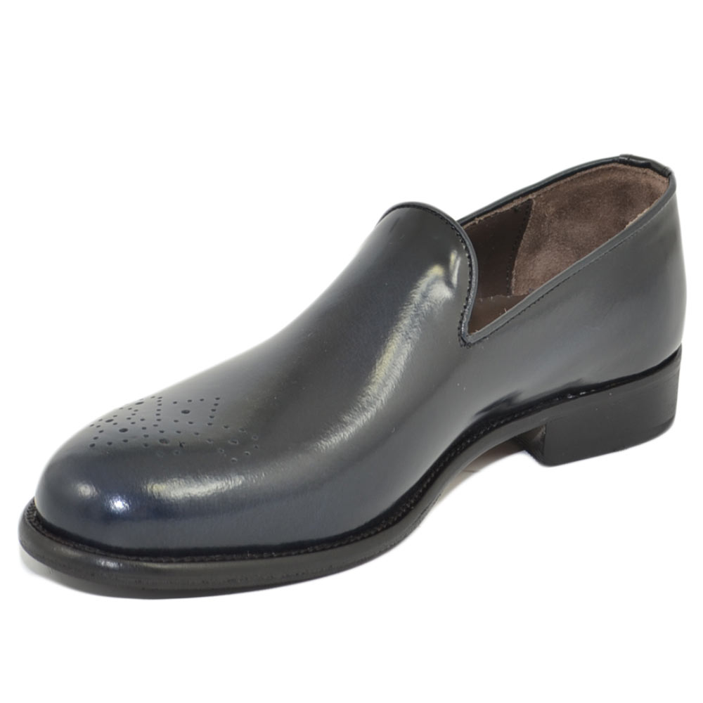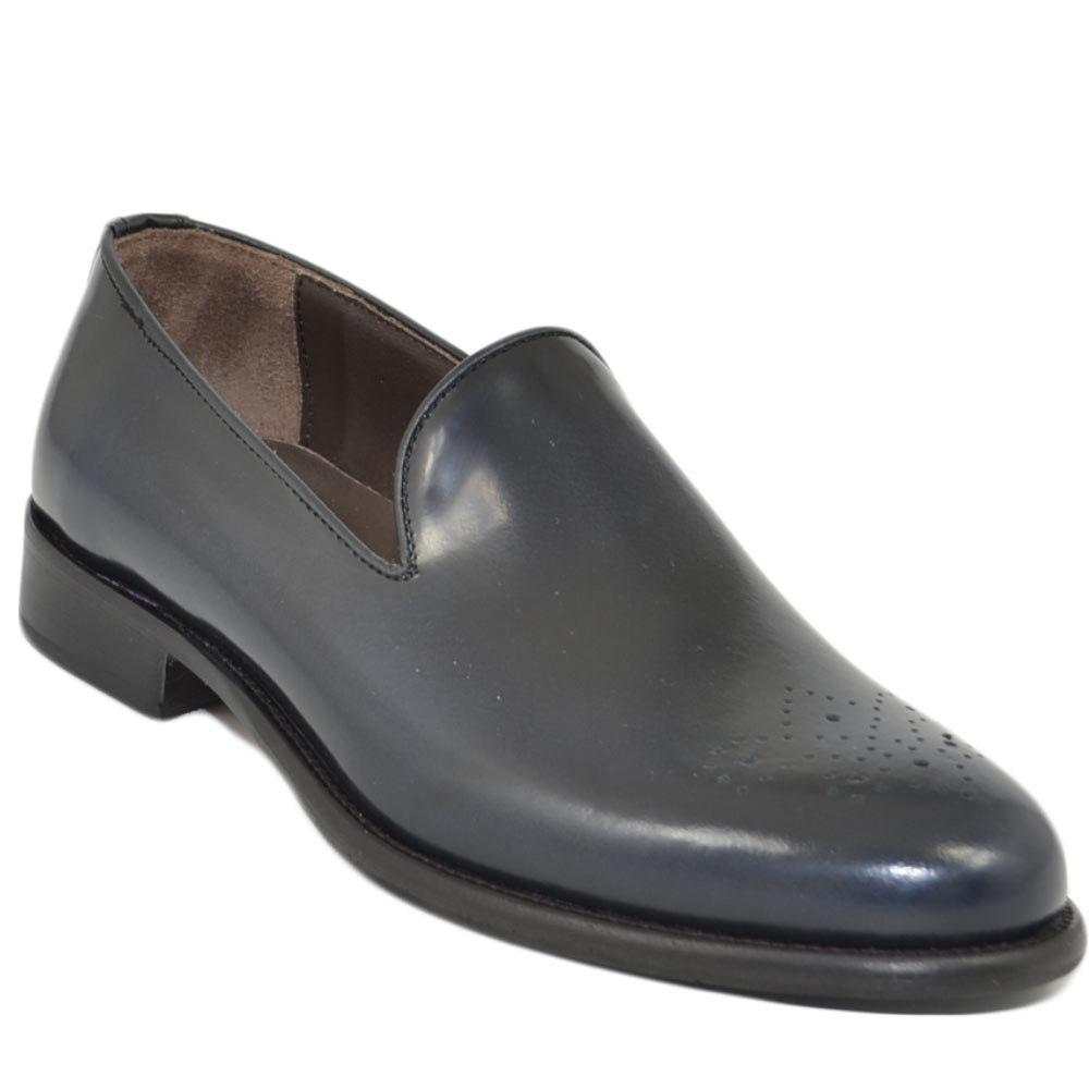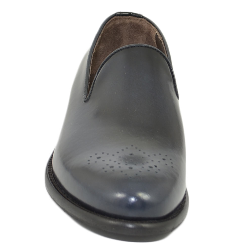 Mocassino uomo liscio classico vera pelle abrasivata blu ricamo punta fondo cuoio artigianale fatti a mano in italia