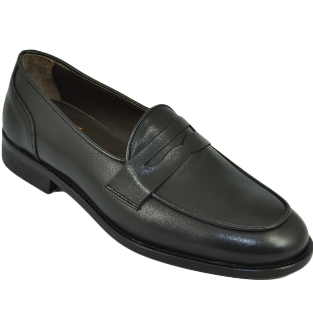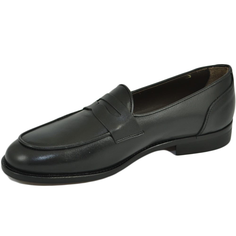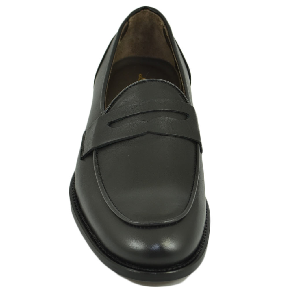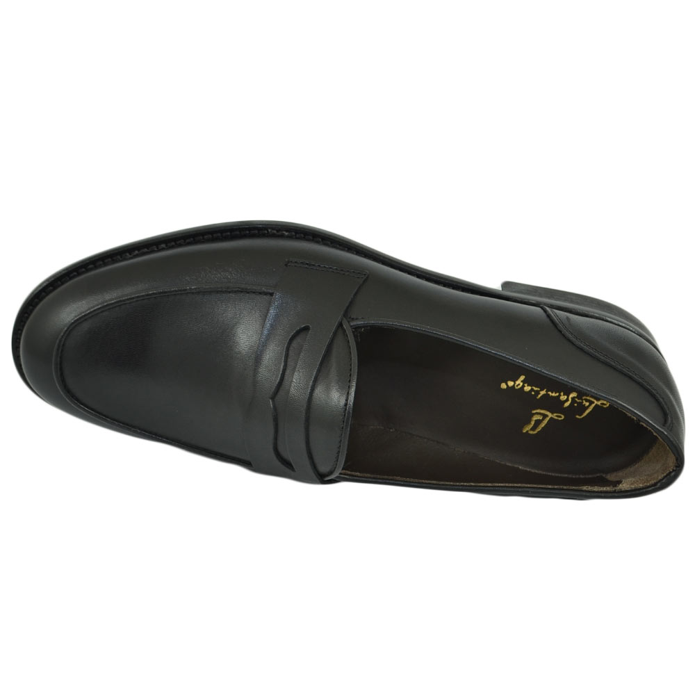 Mocassini LS Luisantiago in vera pelle di nappa nero con fondo cuoio ovalino e riferimenti college rivisitati dandy