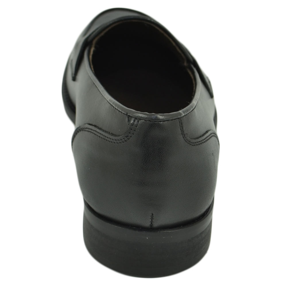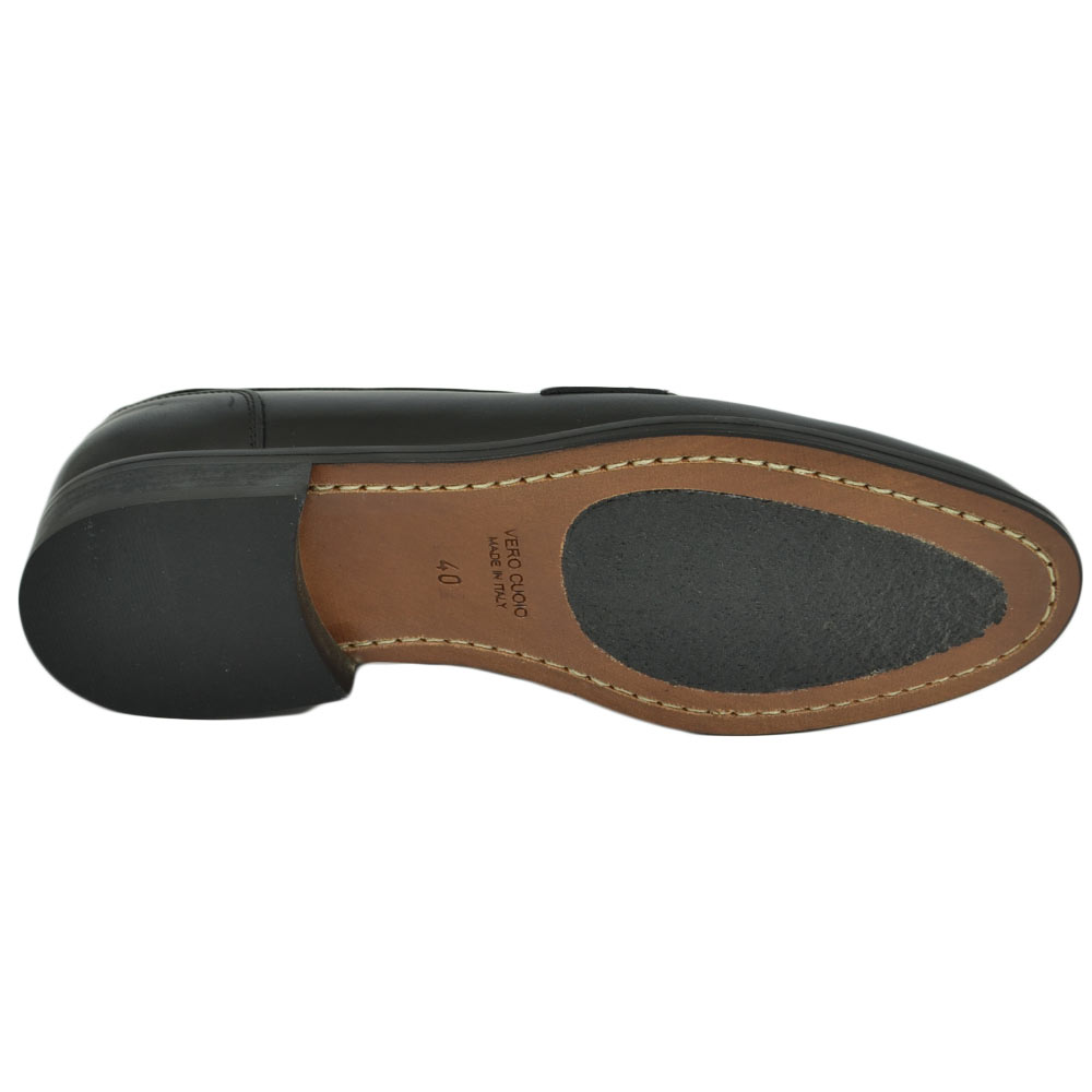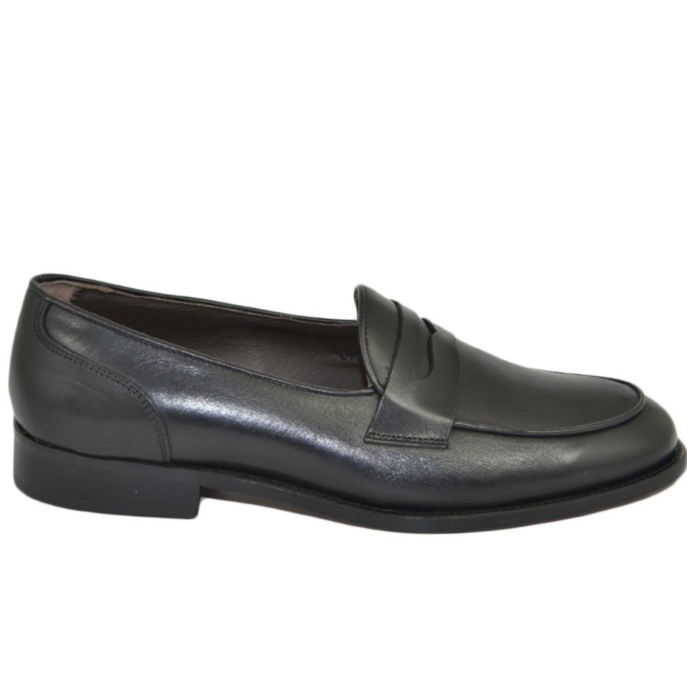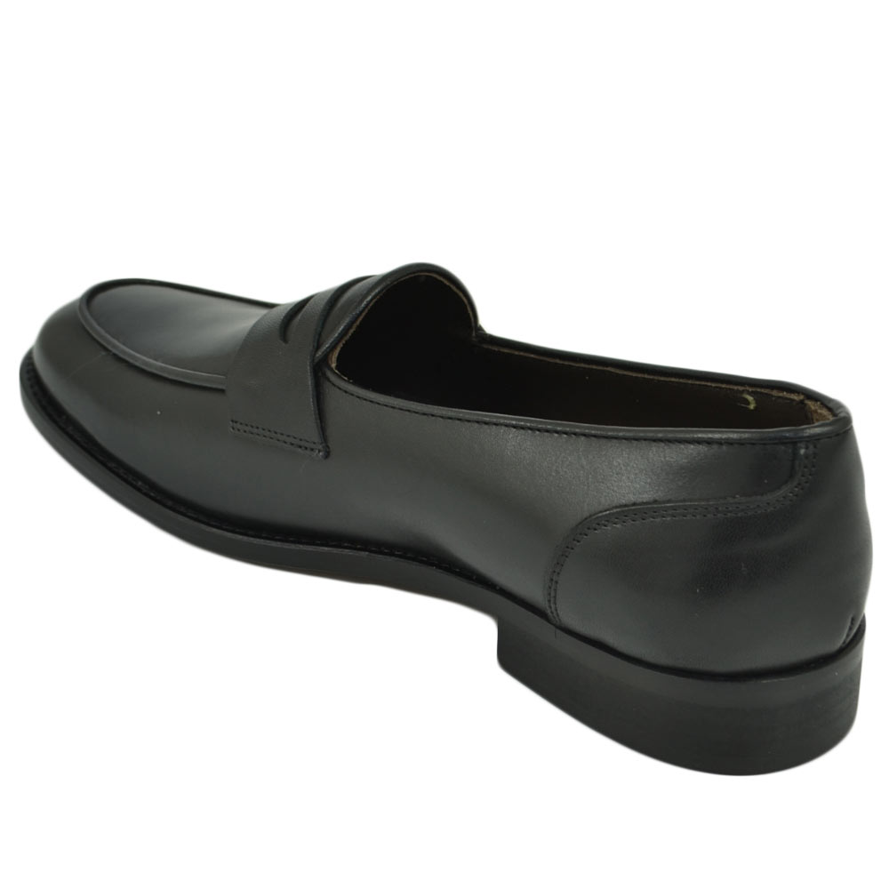 Mocassini LS Luisantiago in vera pelle di nappa nero con fondo cuoio ovalino e riferimenti college rivisitati dandy