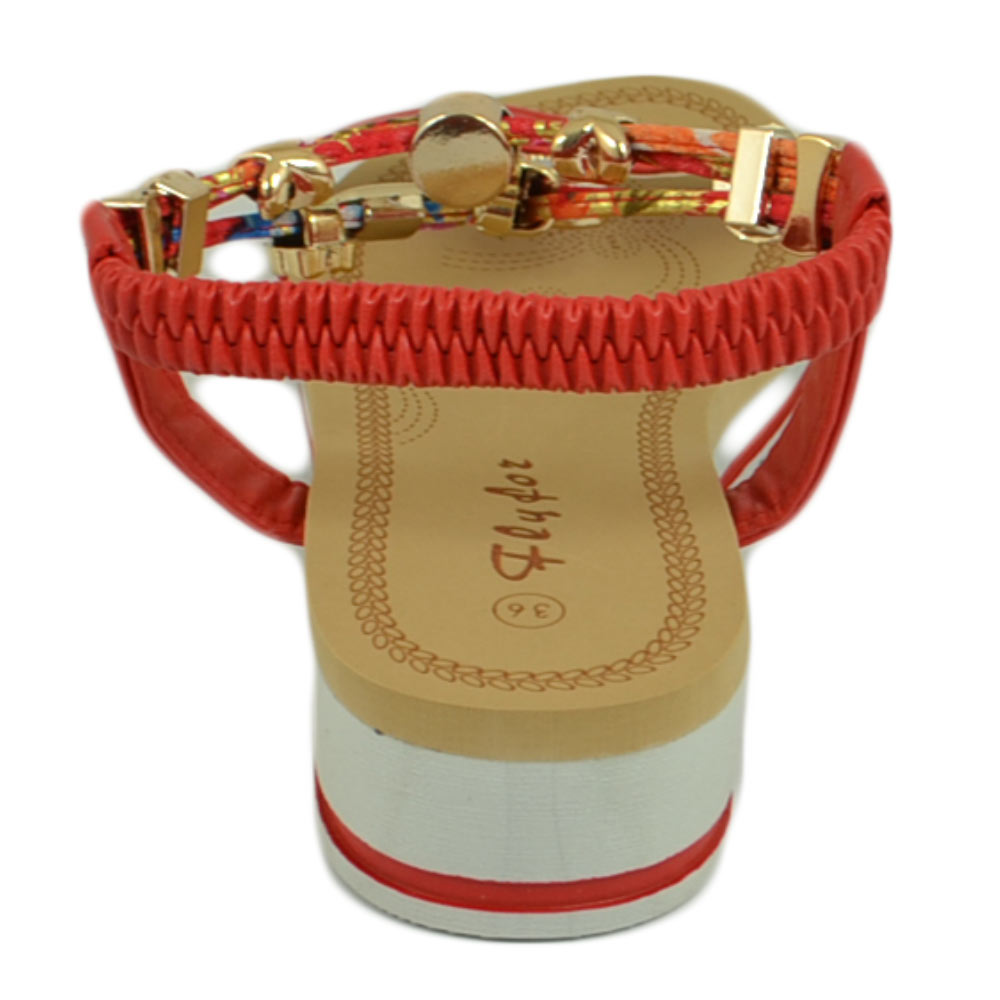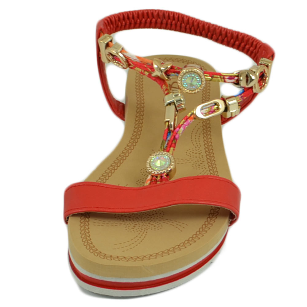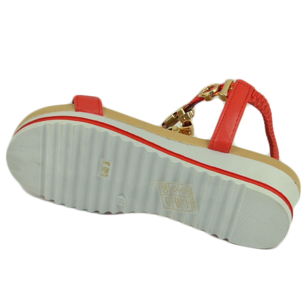 Sandalo gioiello fascetta rosso con applicazioni oro donna basso zeppa gomma antiscivolo cinturino elastico comodo