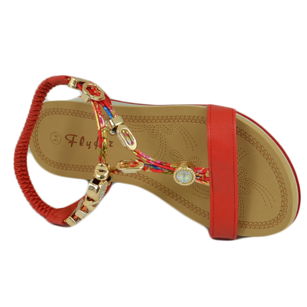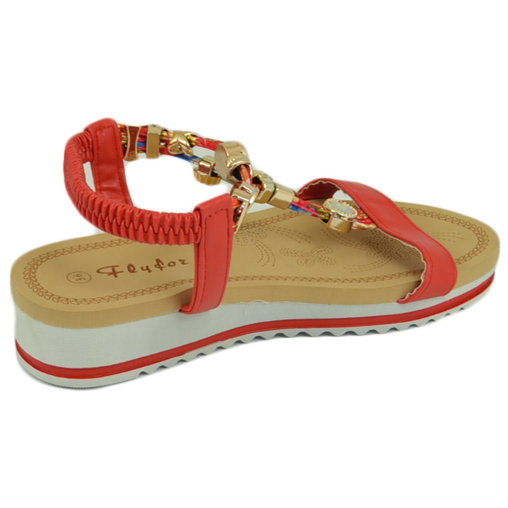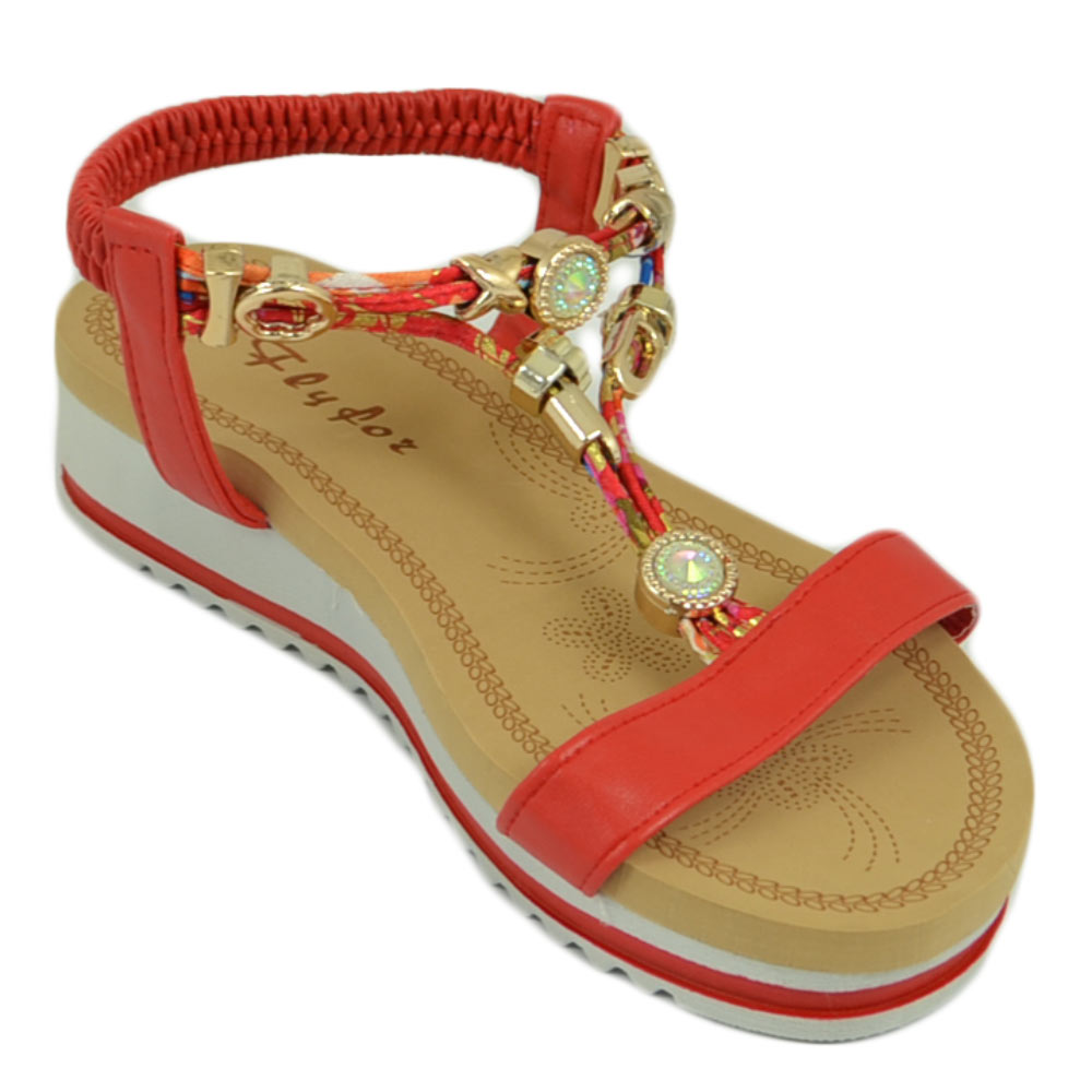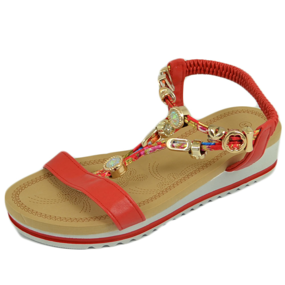 Sandalo gioiello fascetta rosso con applicazioni oro donna basso zeppa gomma antiscivolo cinturino elastico comodo
