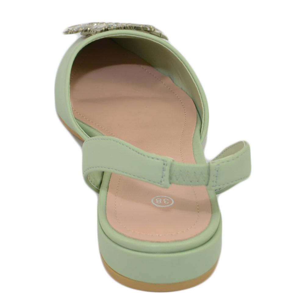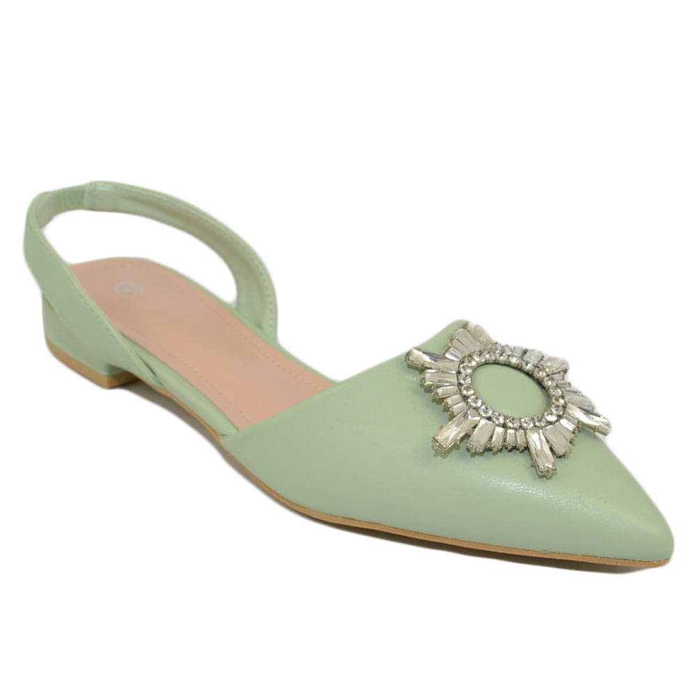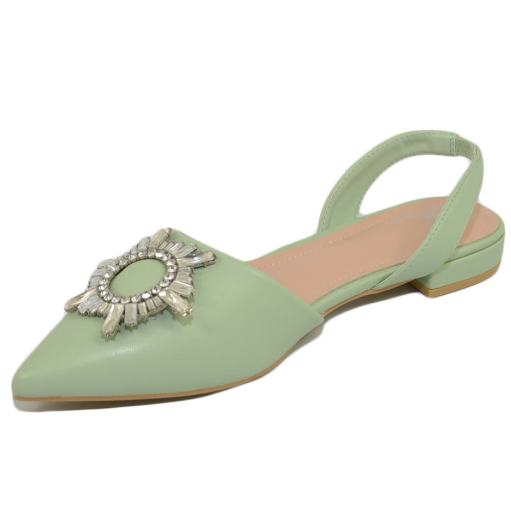 Scarpe donna ballerine slingback verde salvia gioiello luccicante punta sabot sandal basso moda donna cerimonia elegante