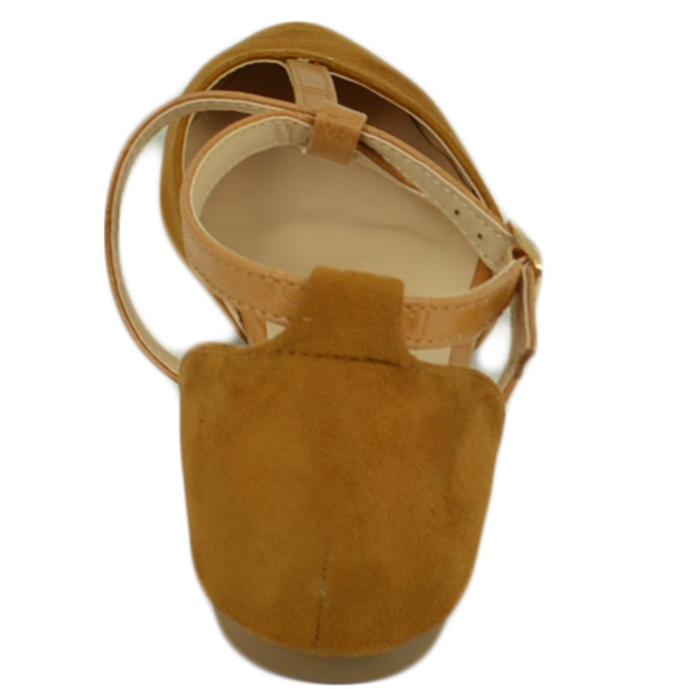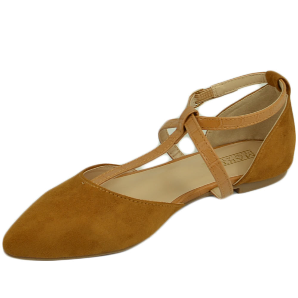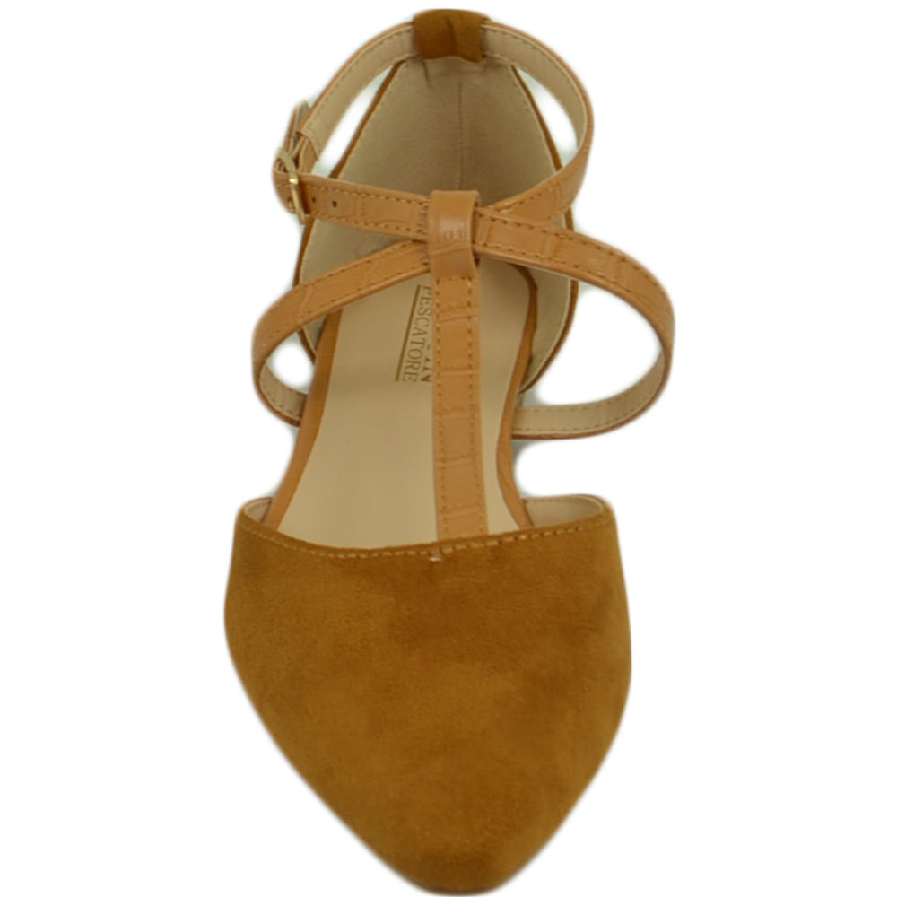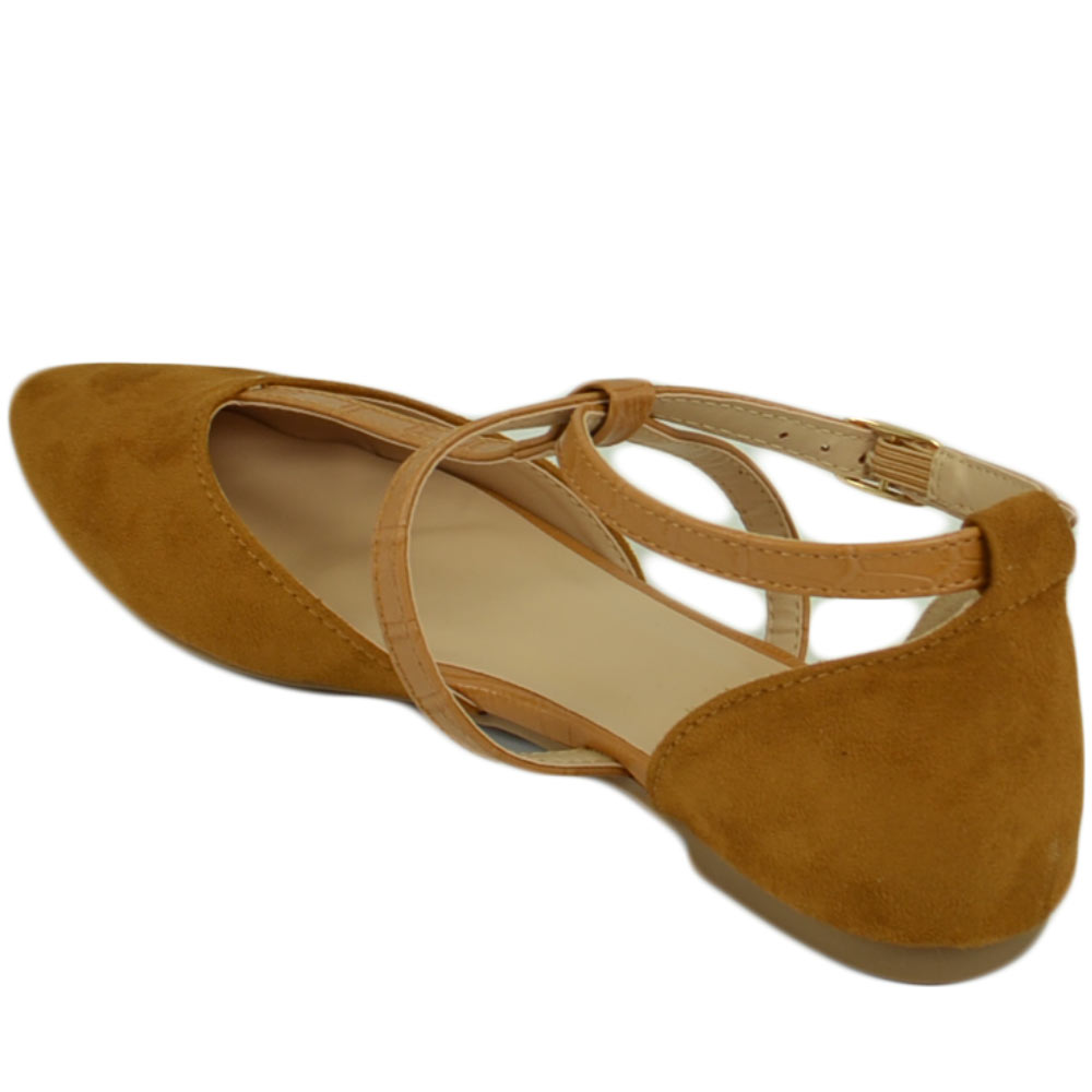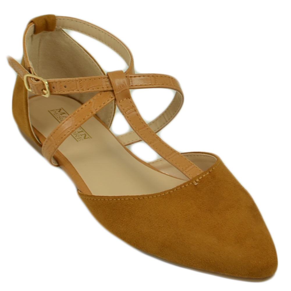 Scarpe ballerine donna a punta in camoscio cuoio con fascette incrociate raso terra moda comfort fondo antiscivolo