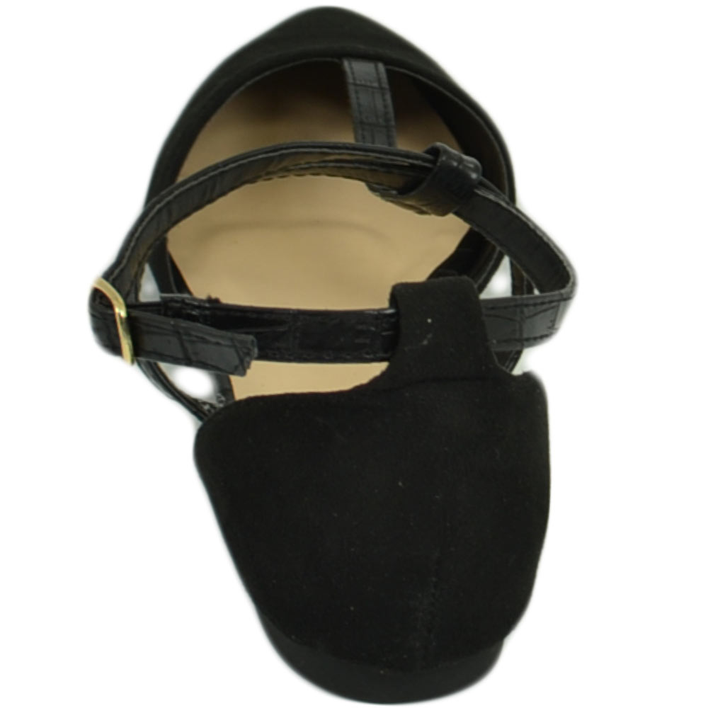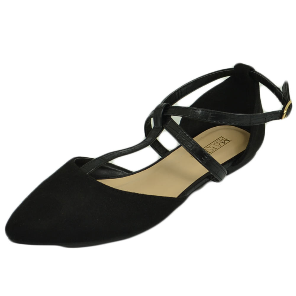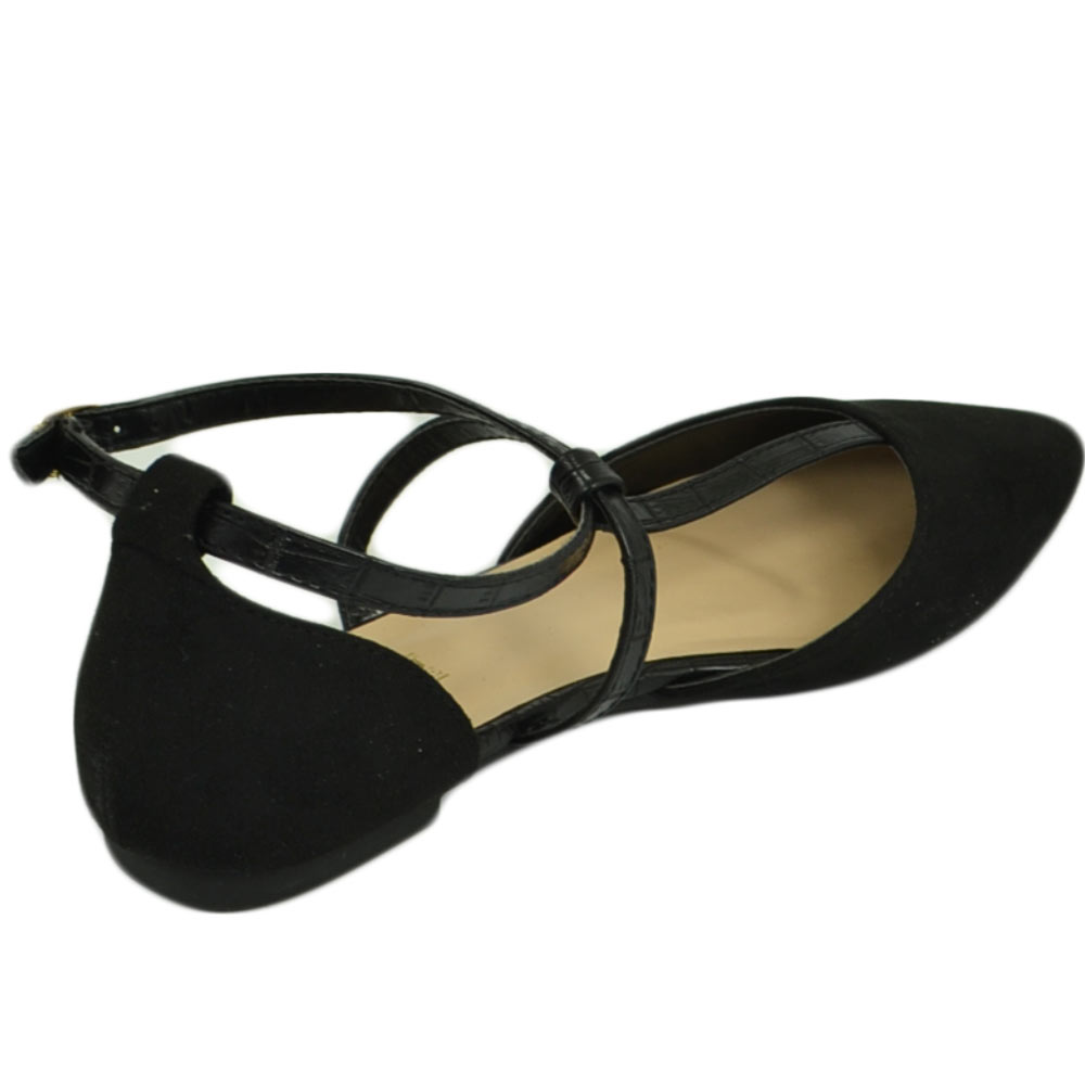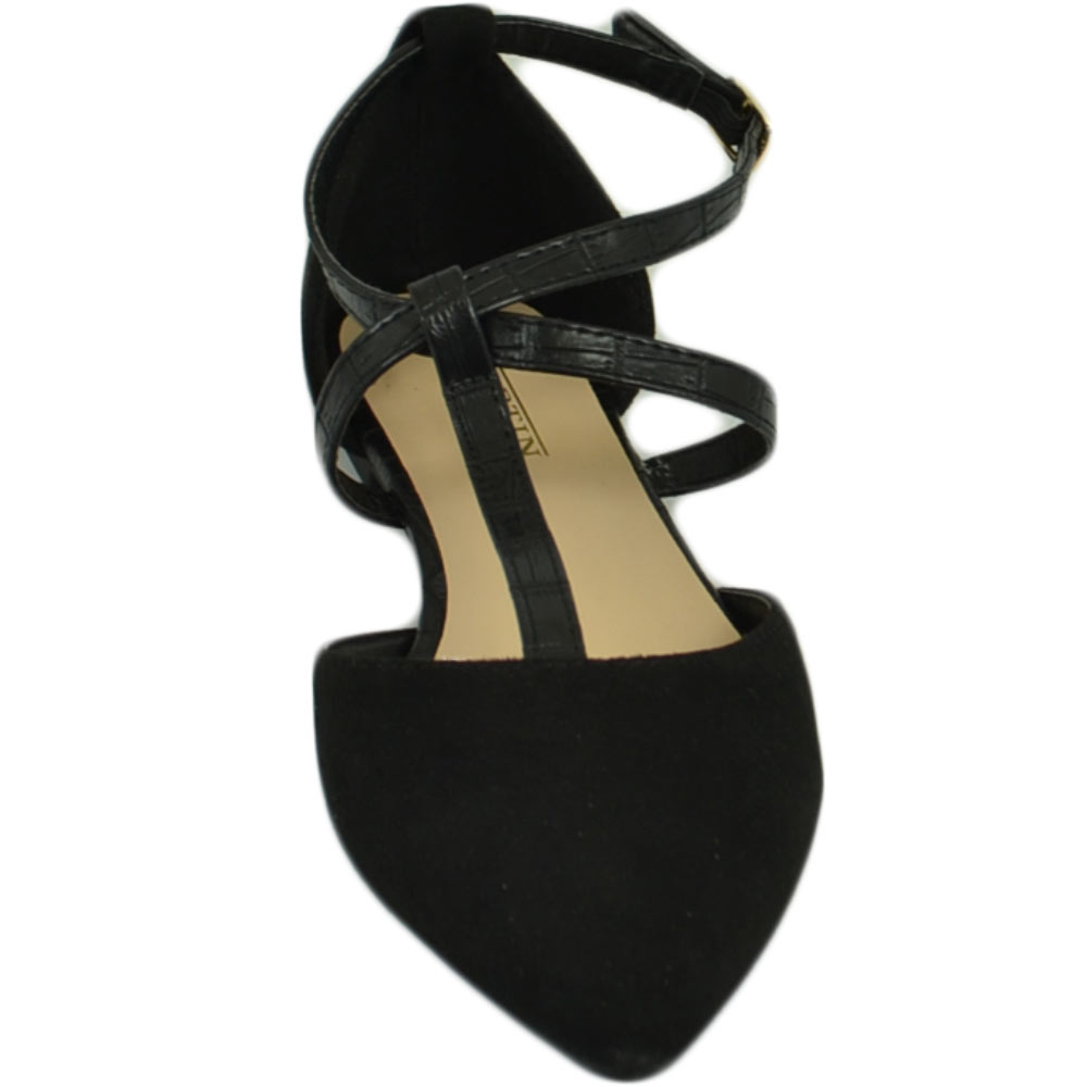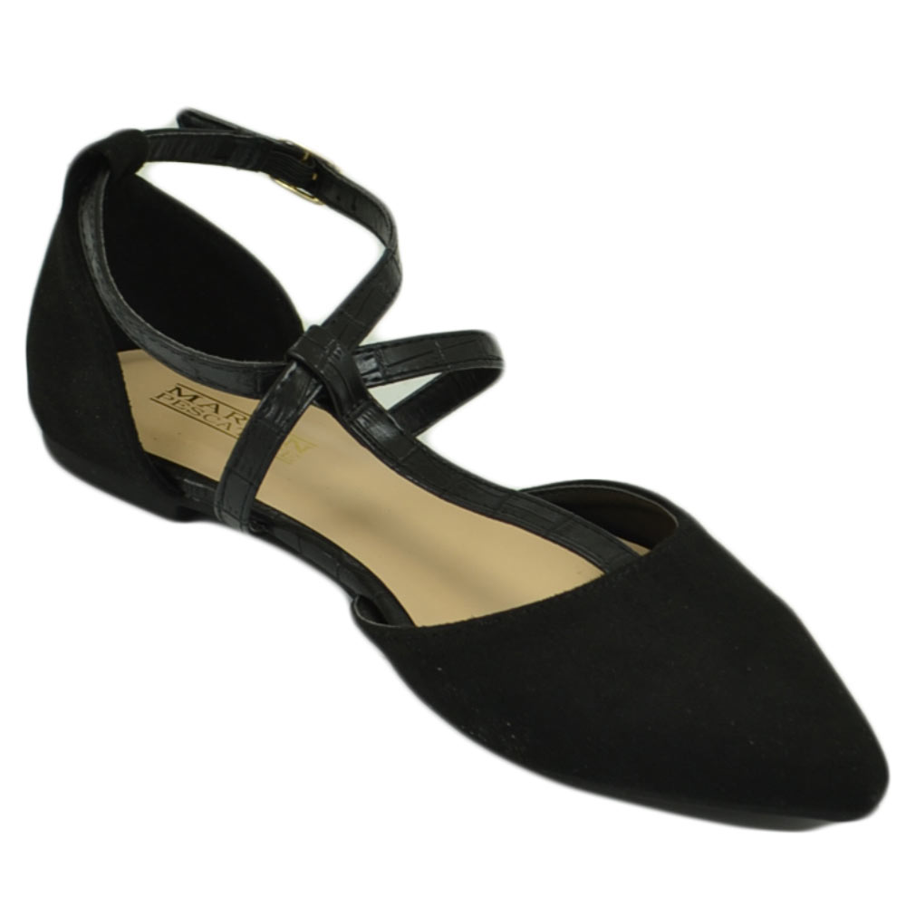 Scarpe ballerine donna a punta in camoscio nero con fascette incrociate raso terra moda comfort fondo antiscivolo