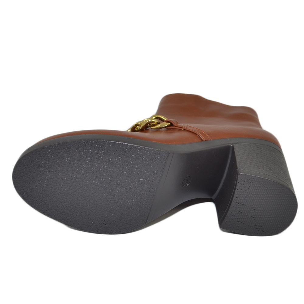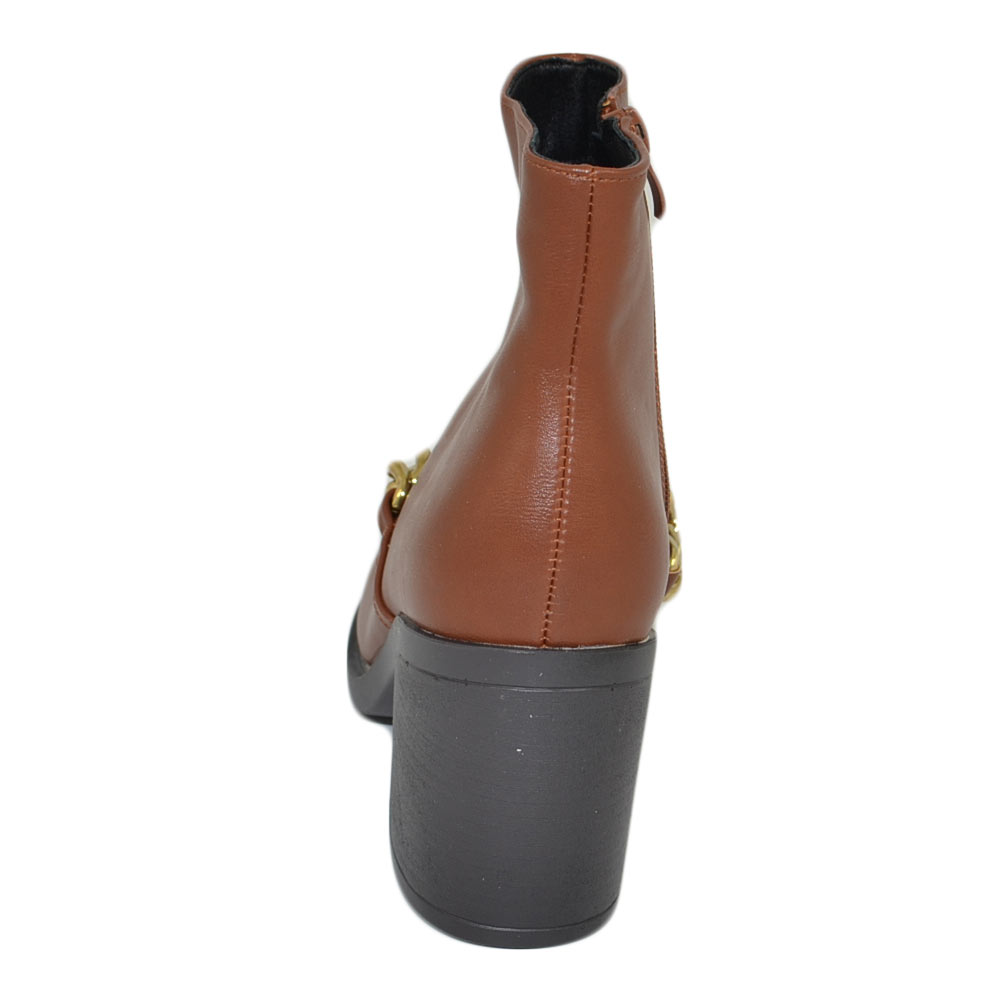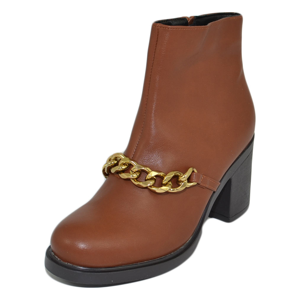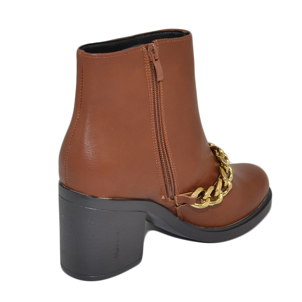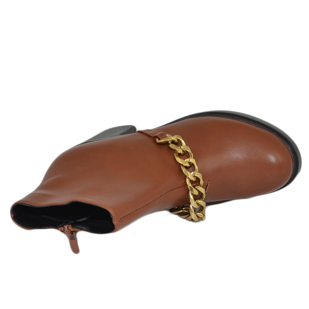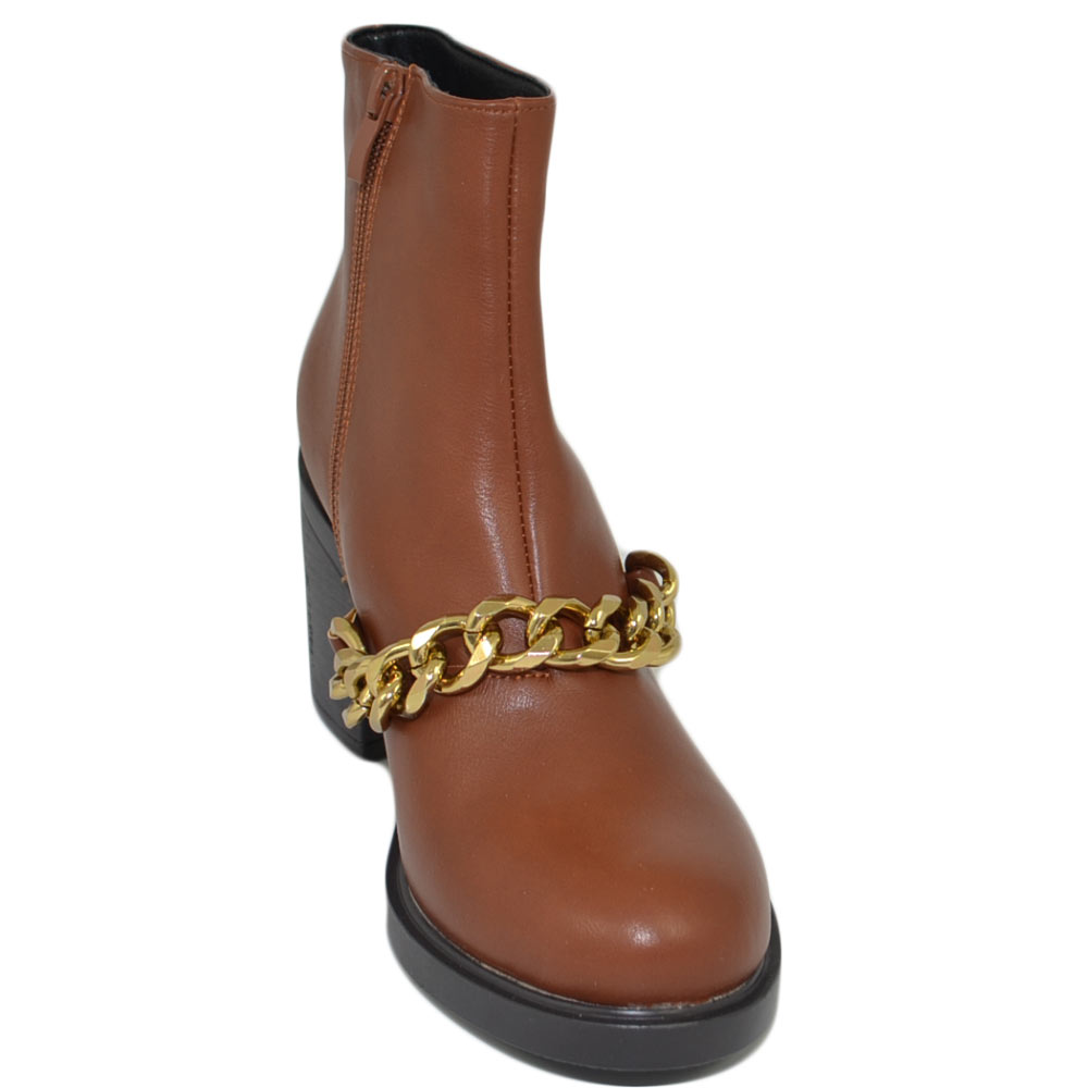 Stivaletti donna tronchetto cuoio tacco comodo largo 6 gomma con catena in punta oro moda tendenza zip