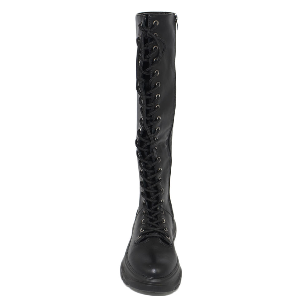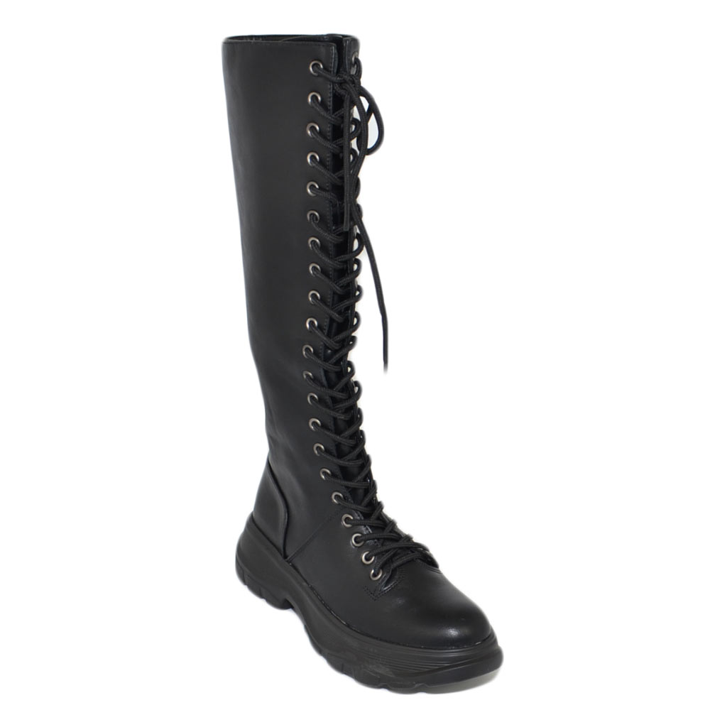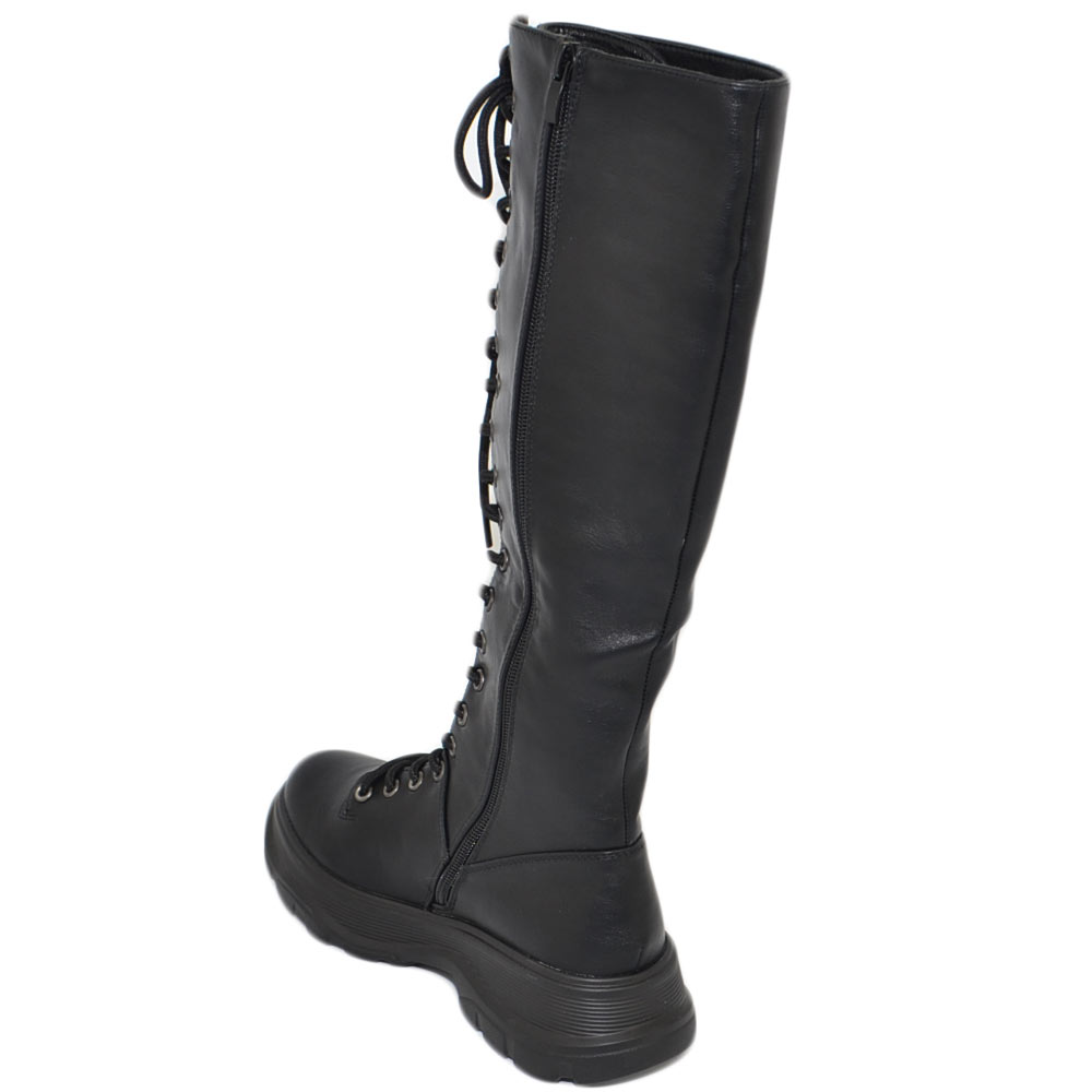 Stivali anfibi donna alto al ginocchio nero zip suola carrarmato comodo zeppa lacci moda aderente regolabile
