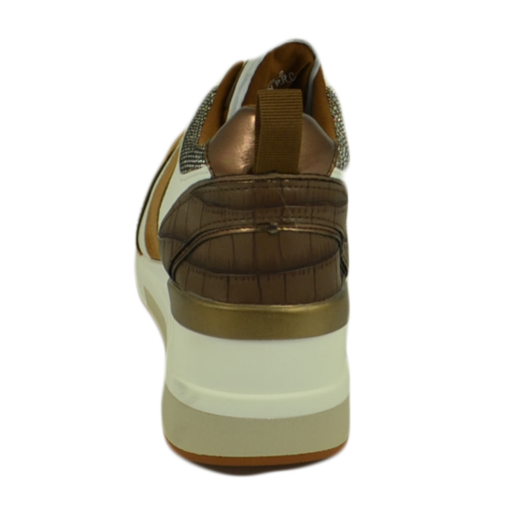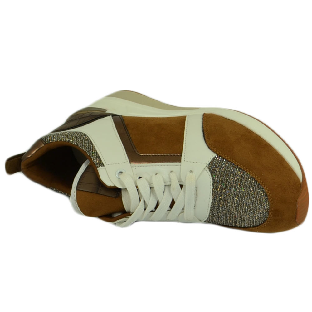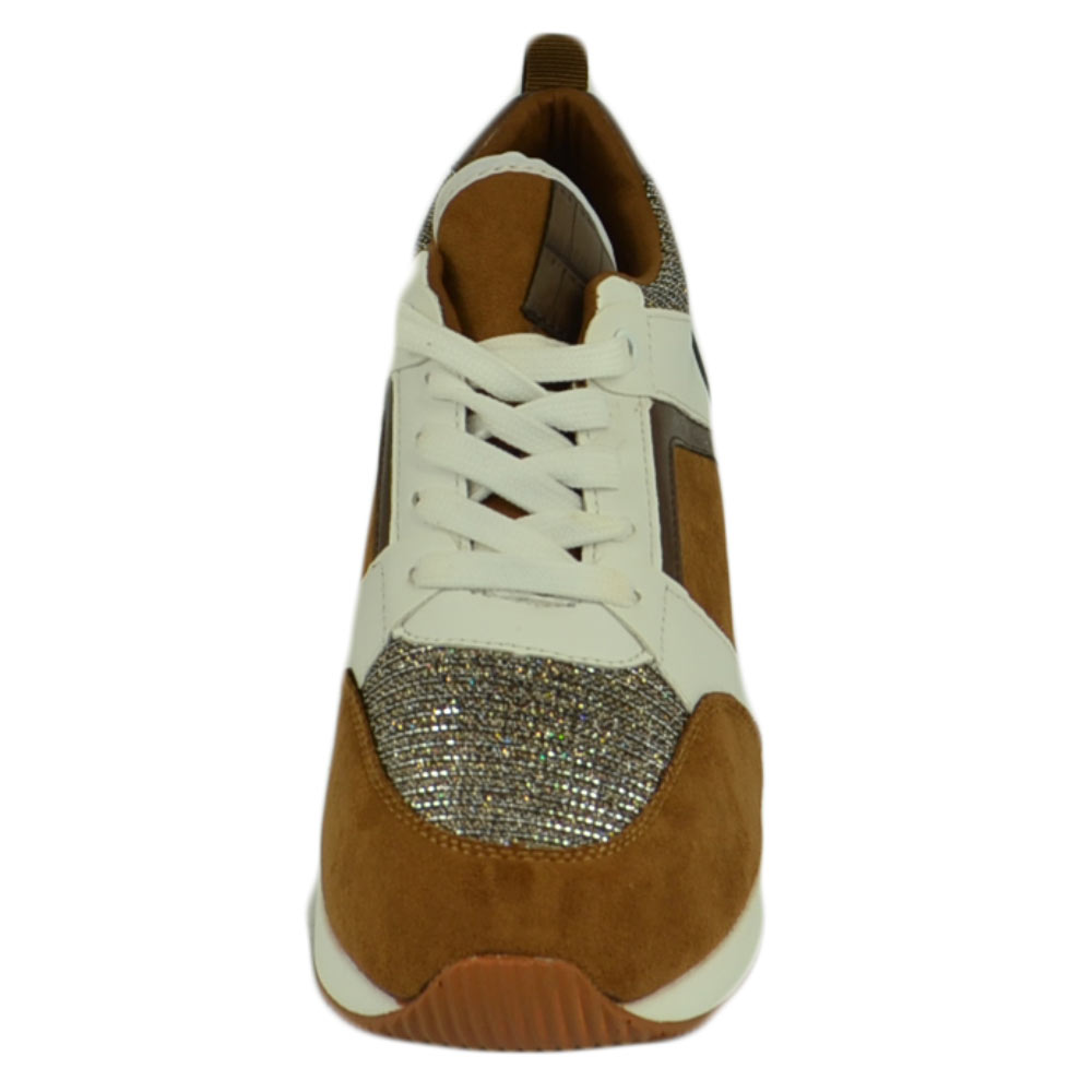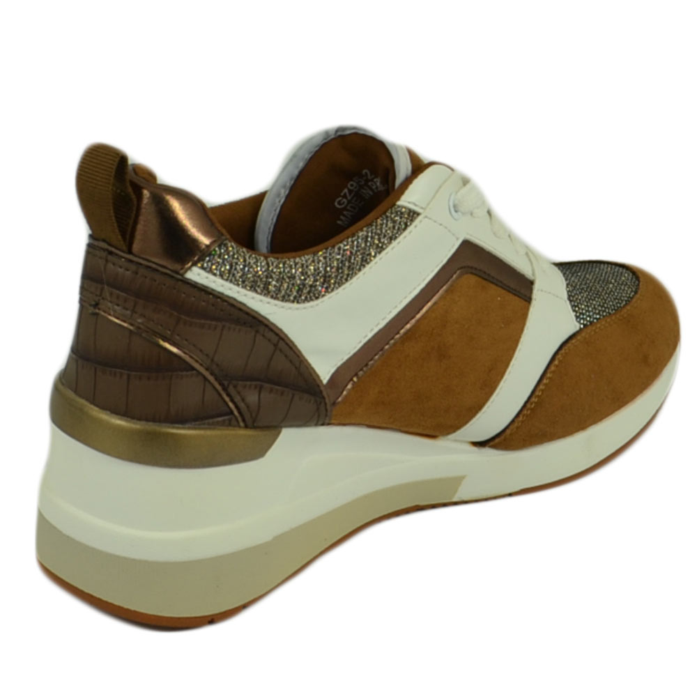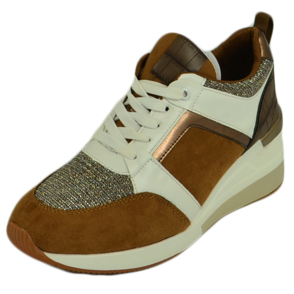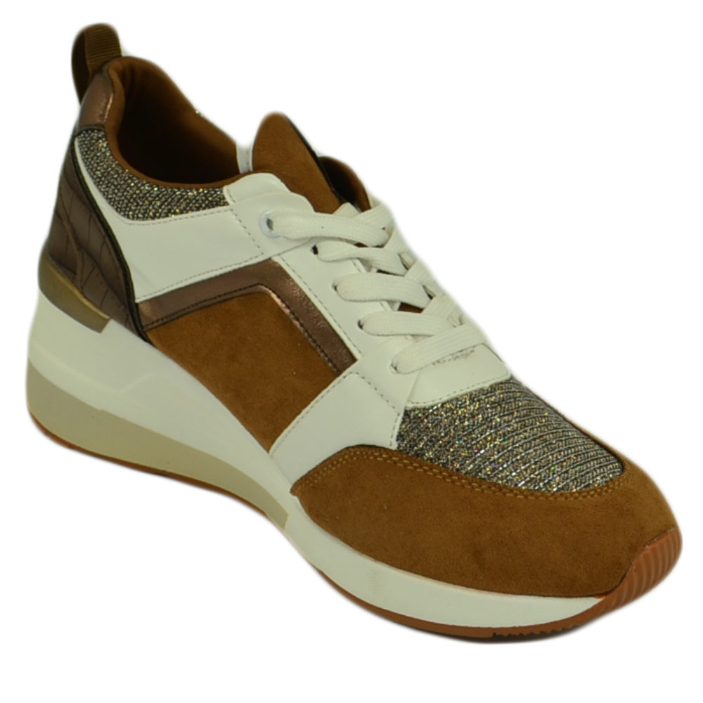 Scarpe donna polacchino sneakers comfort da passeggio glitter marrone bianco gomma anatomica zeppa lacci