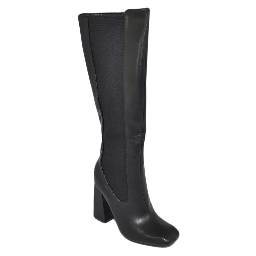 Stivale alto donna punta quadrata nero liscio gambale aderente con elastico al ginocchio tacco largo 10 cm moda con zip