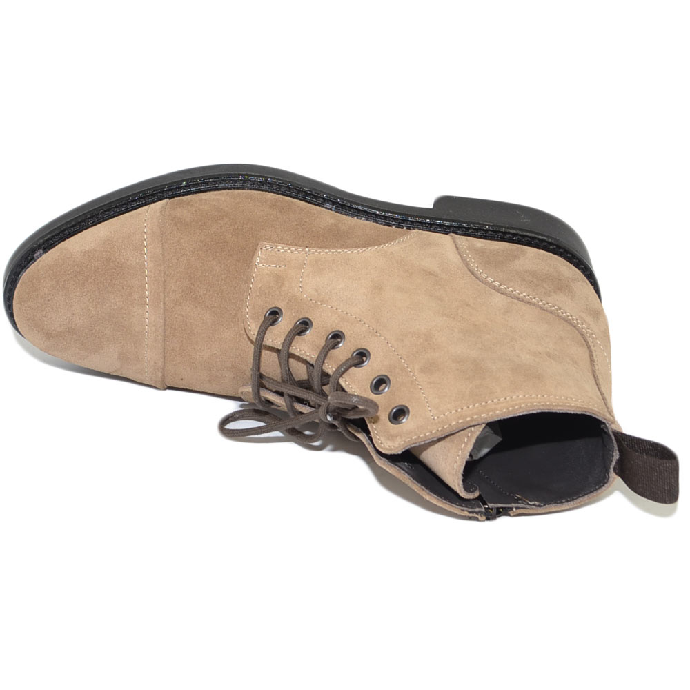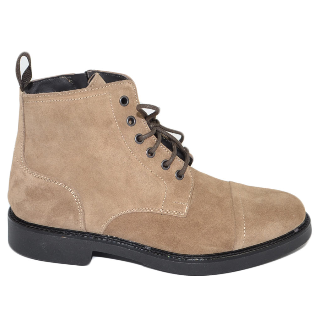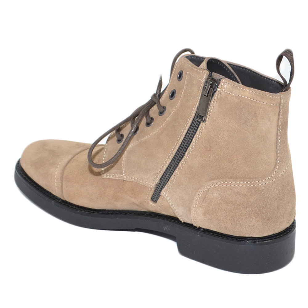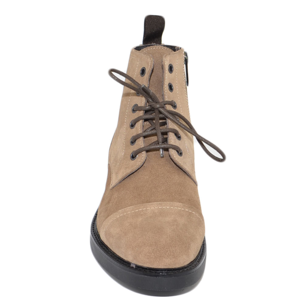 Anfibio stivaletto uomo vera pelle camoscio tortora beige spazzolato fondo gomma lacci in tinta zip moda tendenza
