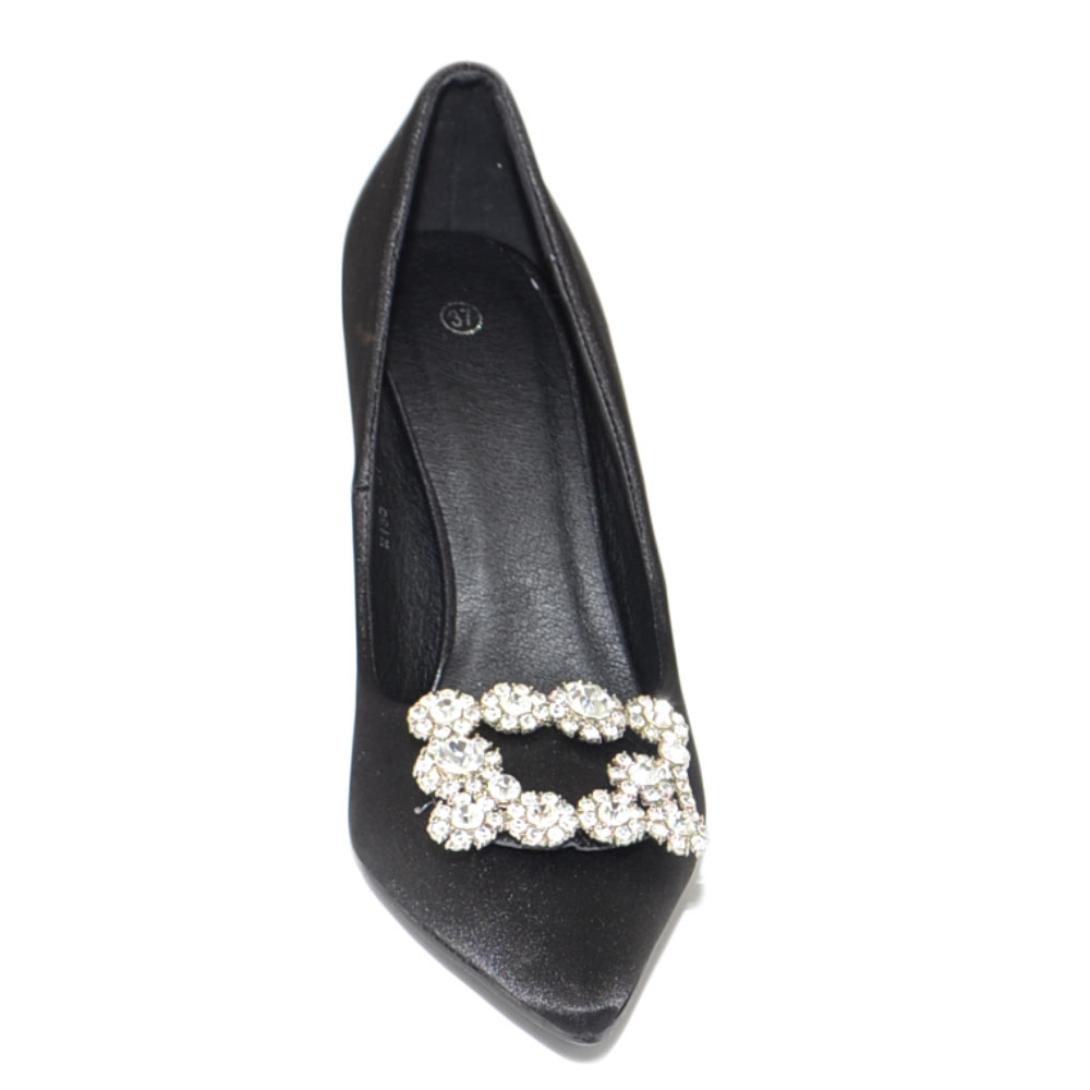 Scarpe decollete donna gioiello quadrato di swarosky brillantini luminosi in punta in raso nero tacco comodo a spillo 10 cm, tipicamente vintage anni 30 è un modello di tendenza estremamente femminile con tacco comodo e glamour. Una scarpa comoda grazie ai materiali di qualità dalla linea semplice e glamour . Una calzatura perfetta con abbigliamento formale, ma adatta anche alla donna glamour che non rinuncia alla propria femminilità nemmeno quando indossa outfit più pratici.