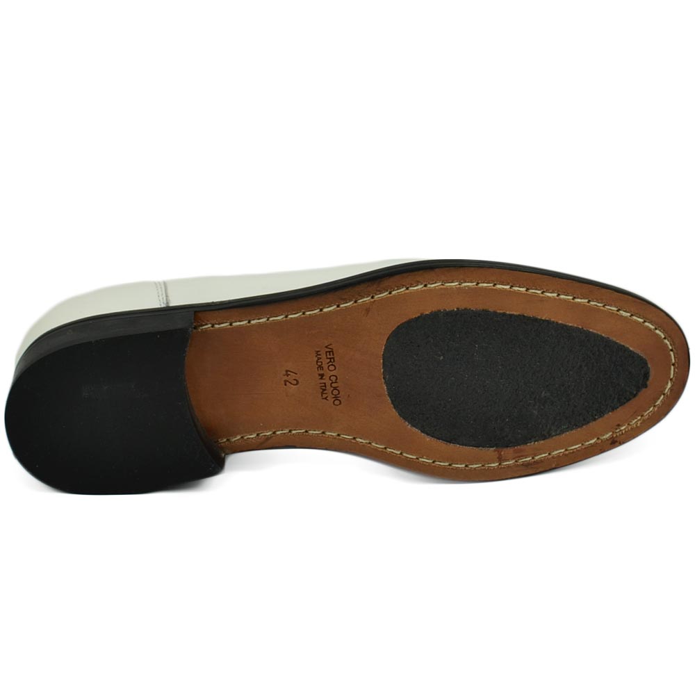 Mocassini ls luisantiago in vera pelle nappa bianco ottico fondo cuoio ovalino nappine campanella rifinimenti ondulati