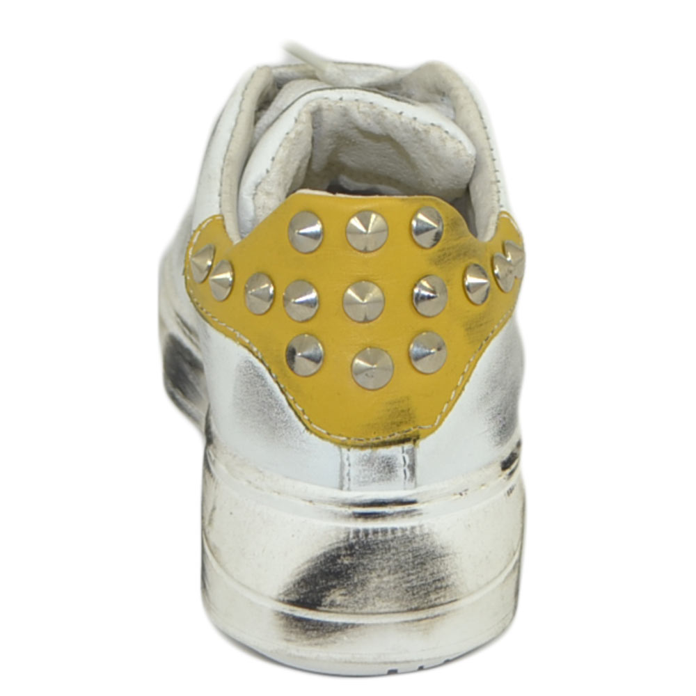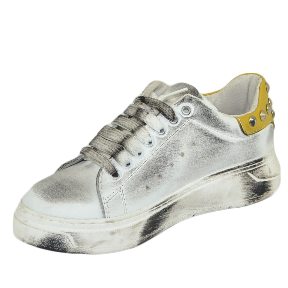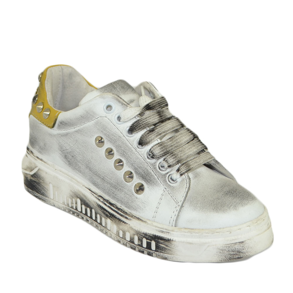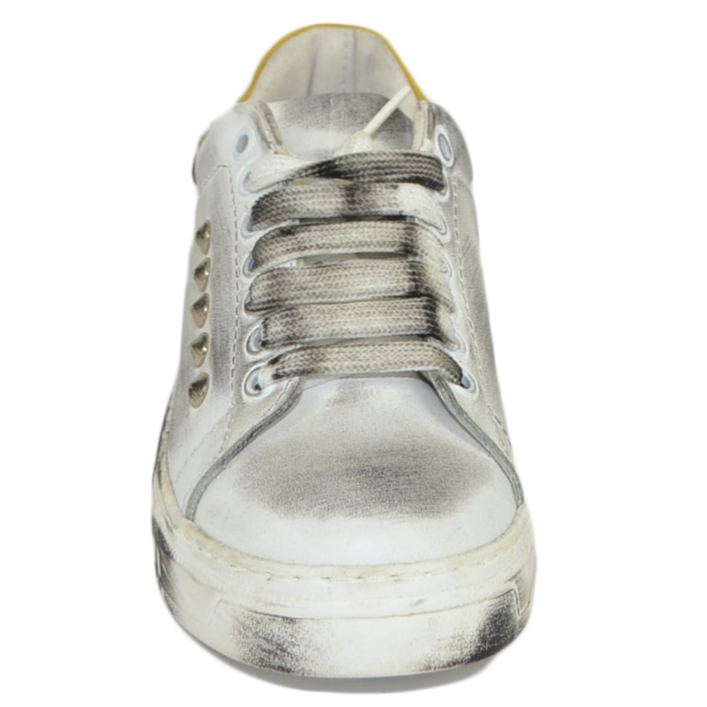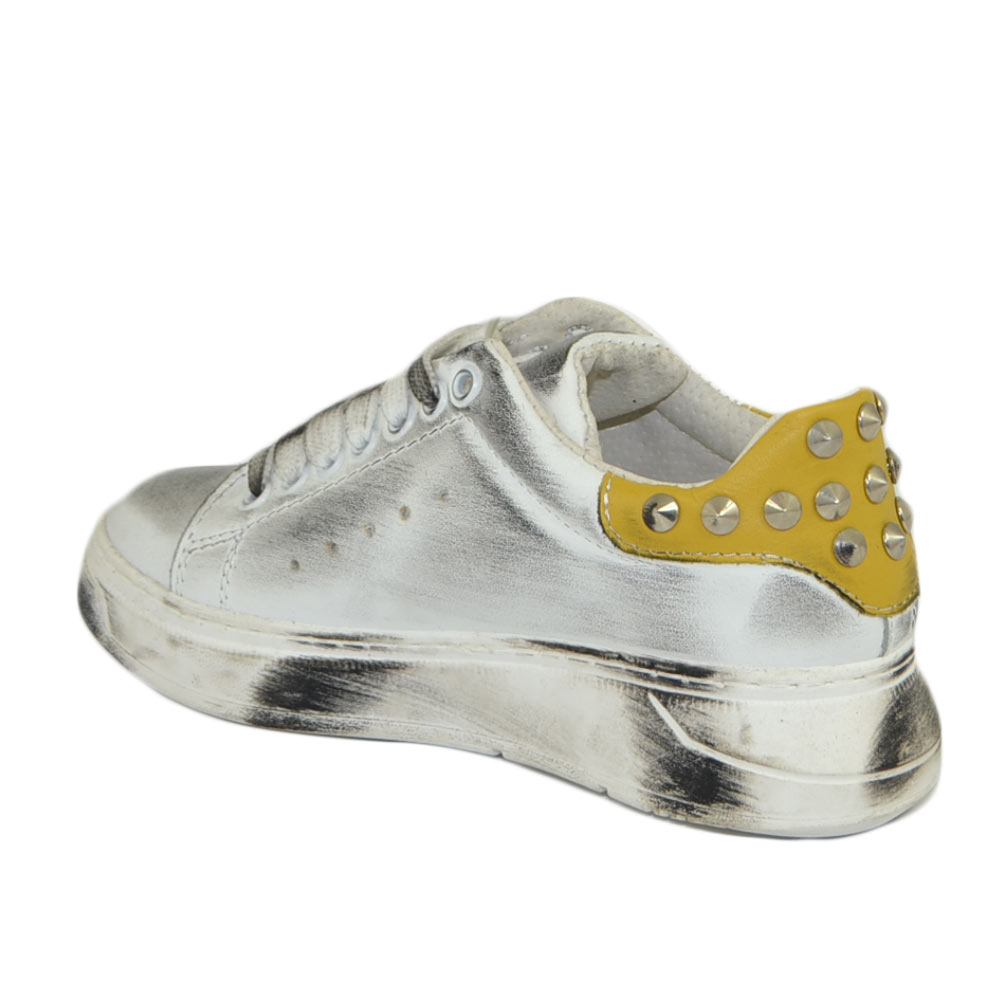 Sneakers donn bianca in vera pelle effetto sporco borchie retro laterali fortino giallo ocra fondo army moda uomo street